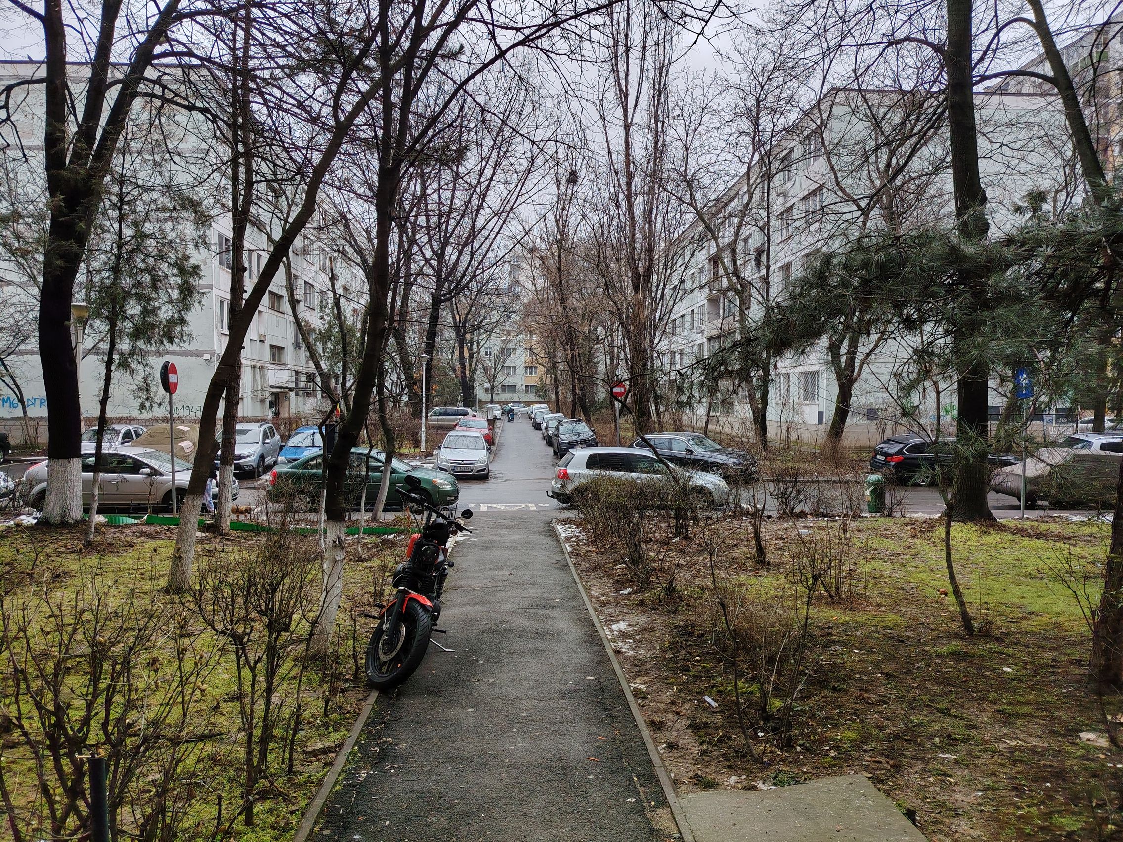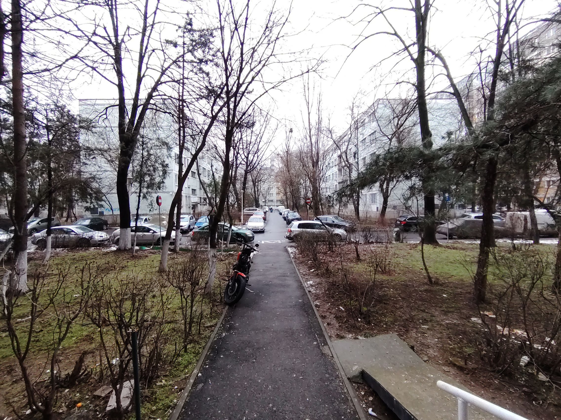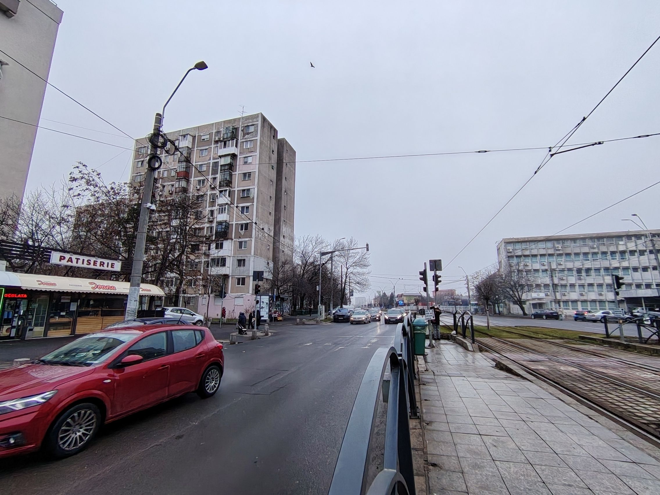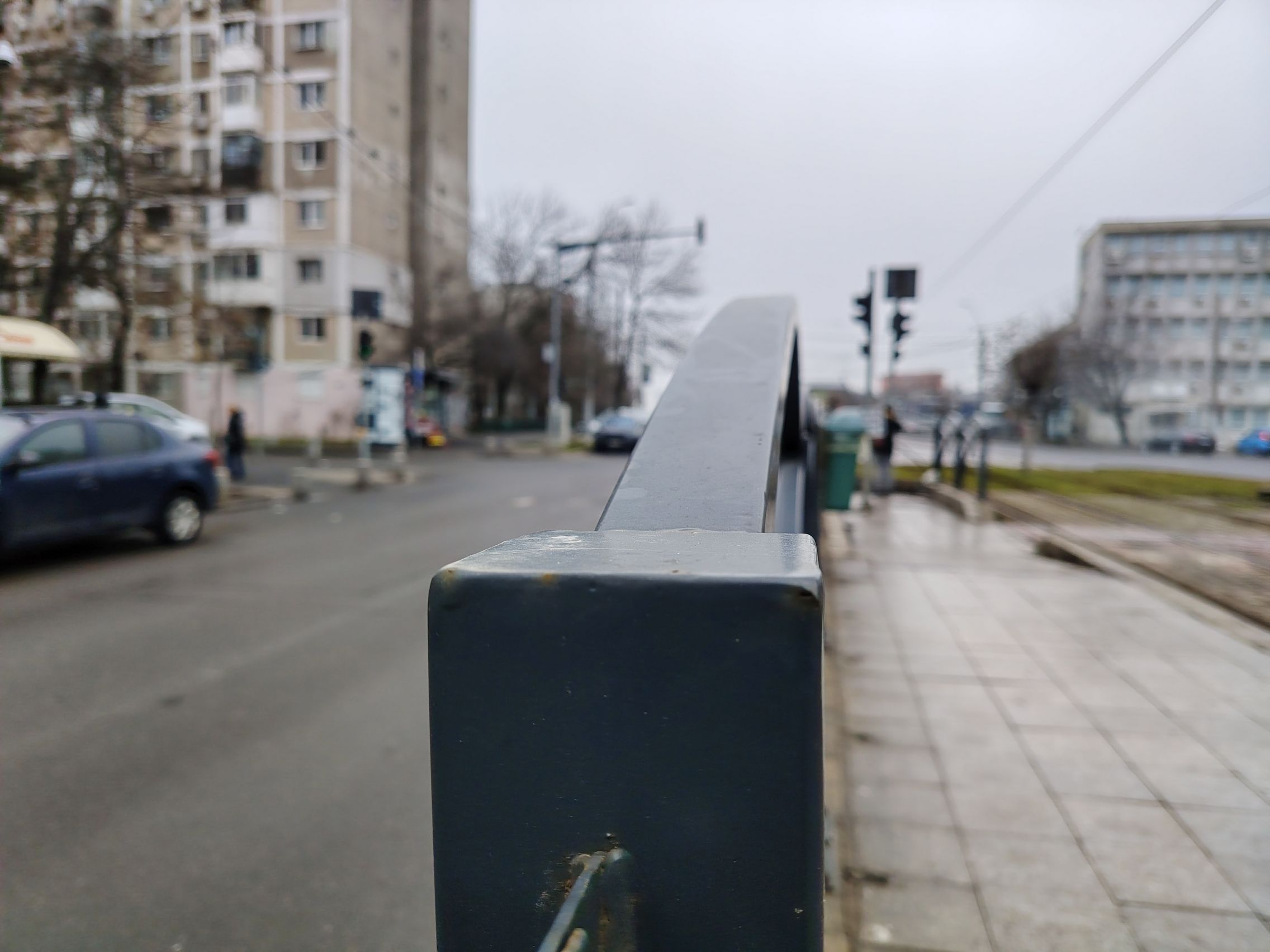Ultrawide-ul e clar verigă slabă, am remarcat cadre cu detalii slabe şi uşor mov ca tenta. Paradoxal ultrawide-ul produce şi cadre mai luminoase, cu cer complet alb totuşi. Pozele cu camera principală sunt pline de contrast, cu roşu intens şi merg pe realism şi o paletă oarecum limitată de culori. Ziua mohorâtă şi-a pus amprentă şi pe coloristica de aici.