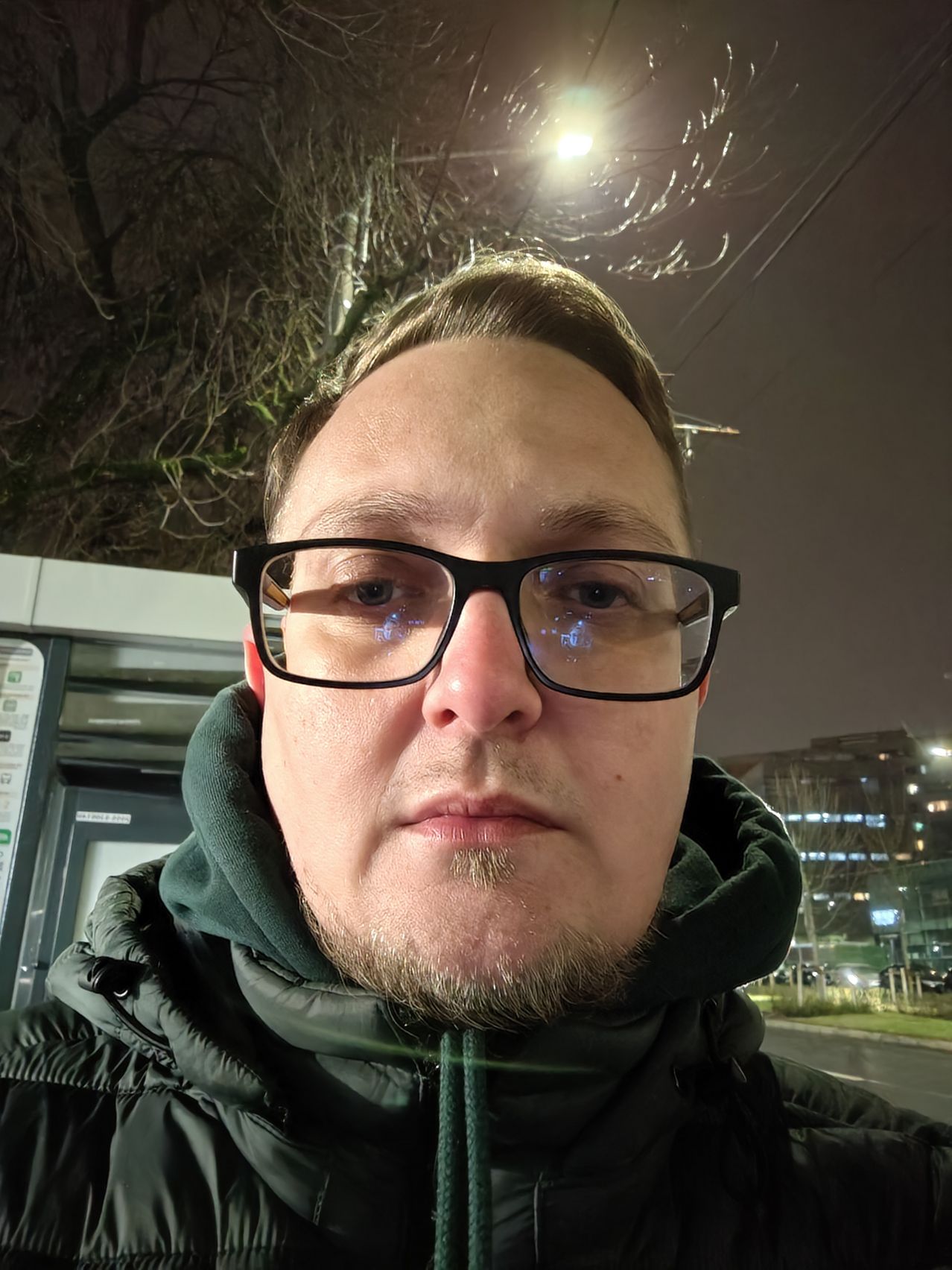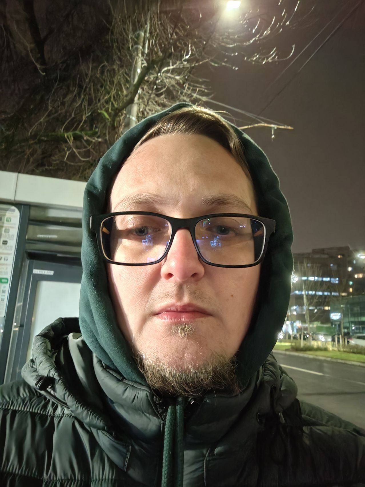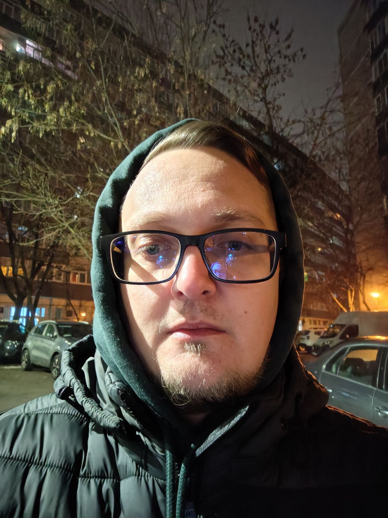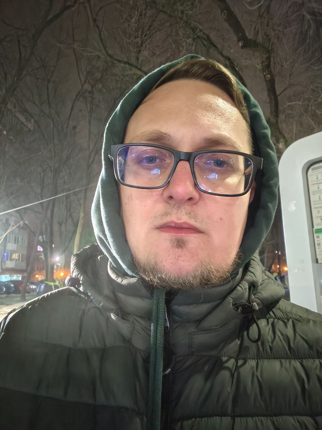 Selfie-urile scad în calitatea noapte, fie sunt întunecate, fie prea iluminate. E nevoie şi de funcţia de "ecran blitz" să conturezi ca lumea capul subiectului. Sursele de lumină au halouri măricele, iar obiectele din depărtare sunt zgomotoase. Cele din plan apropiat au claritate OK. Selfie-urile făcute la lumina stradală arată ceva mai bine, îmi place conturul ochelarilor şi părul redat corect de sub glugă.
