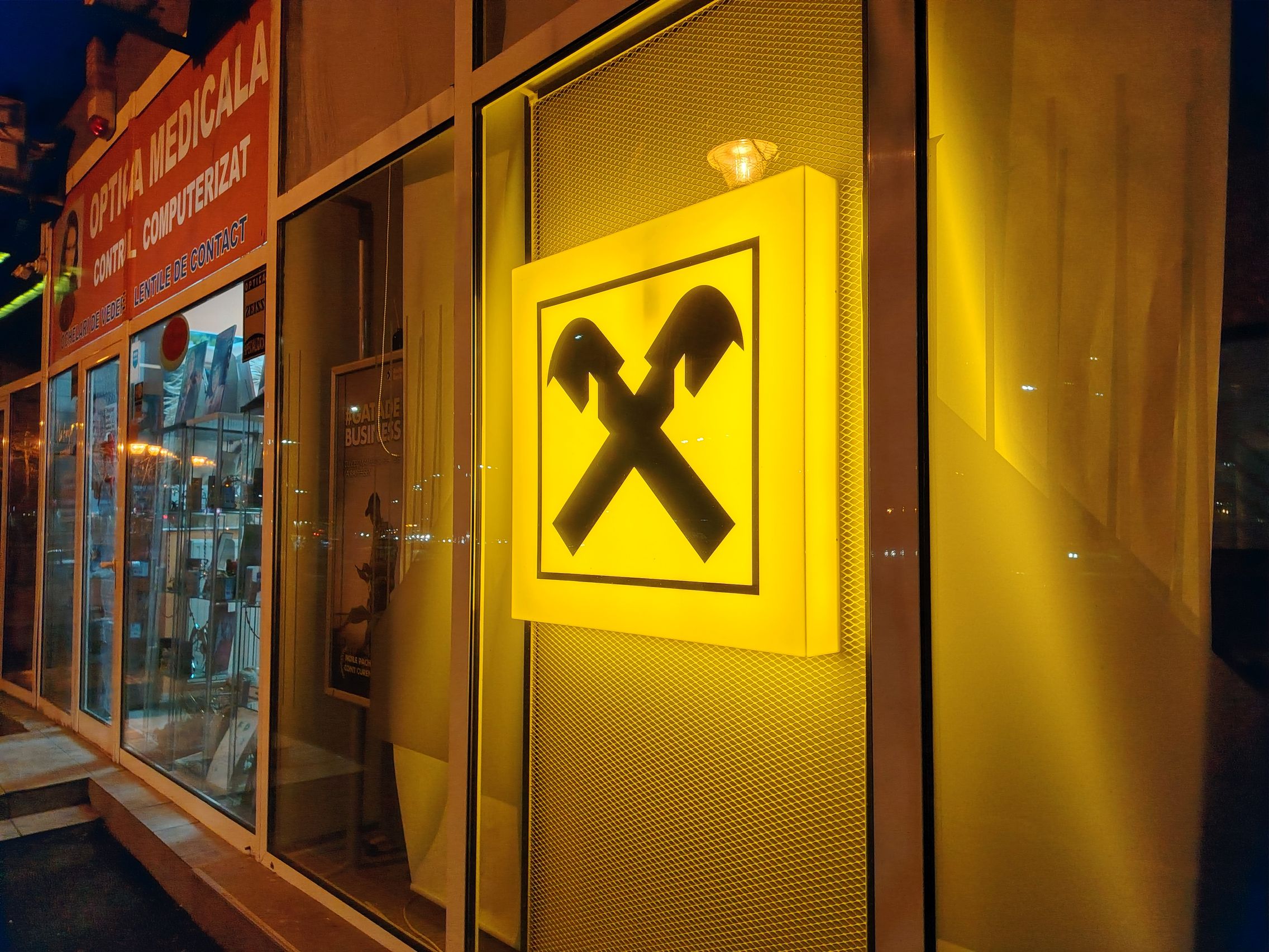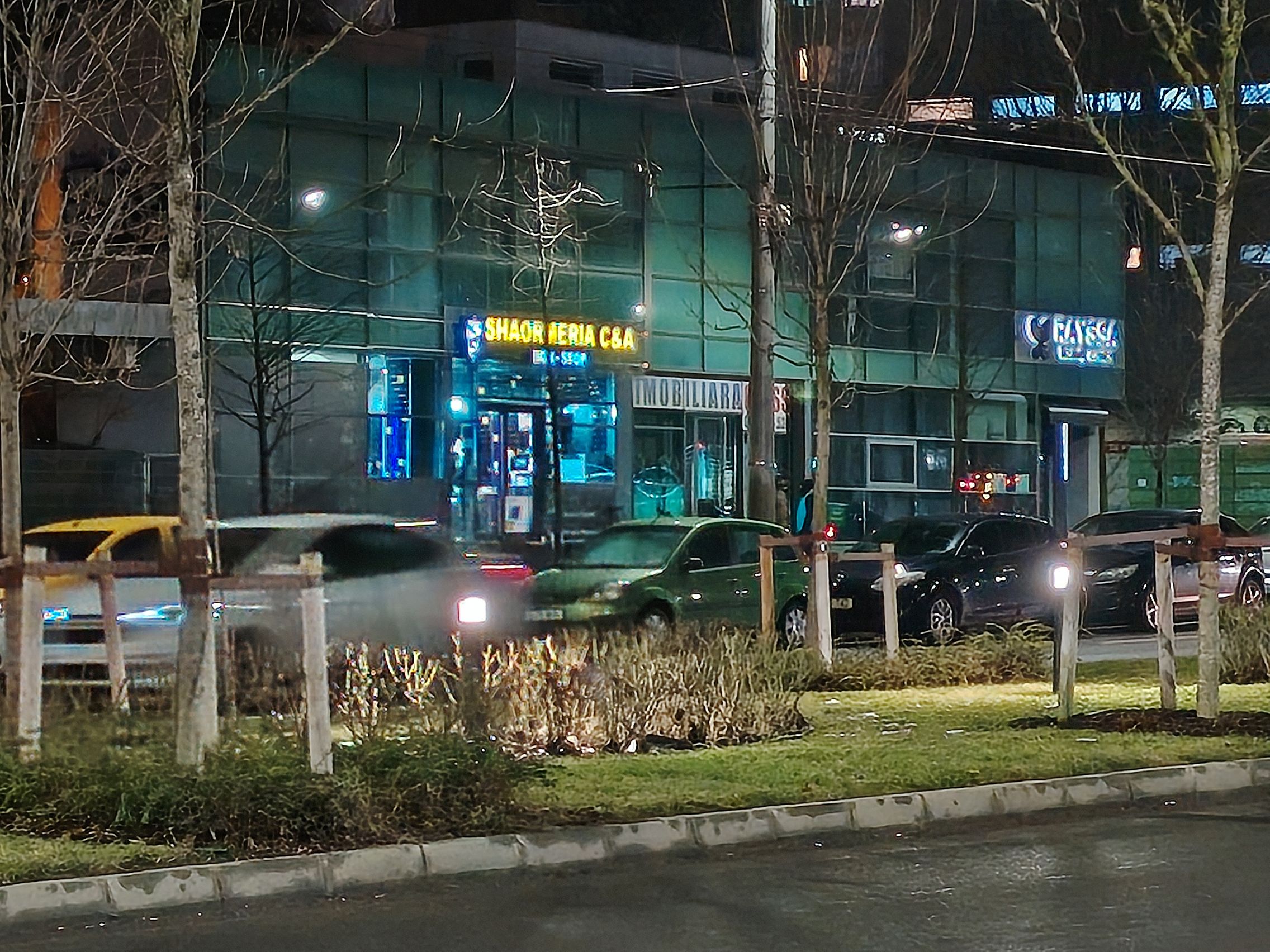 Noaptea limitările sunt clare: reflexii, halouri mari, nuanţa gălbuie şi zgomot. Văd zgomot inclusiv la nivelul cerului, dar şi în plan apropiat, plus plan depărtat. Unele halouri de lumină creează curcubee, iar unele sunt roşiatice sau portocalii. Zoom-ul se lasă cu zgomot şi "purici". Stabilizarea nu mi se pare chiar rea, pesemne că mergea colegul puţin mai lent, pe lângă acea bancă şi shaormerie. Atenţie la albul iluminării shaormeriei, care zici că e din Rai.