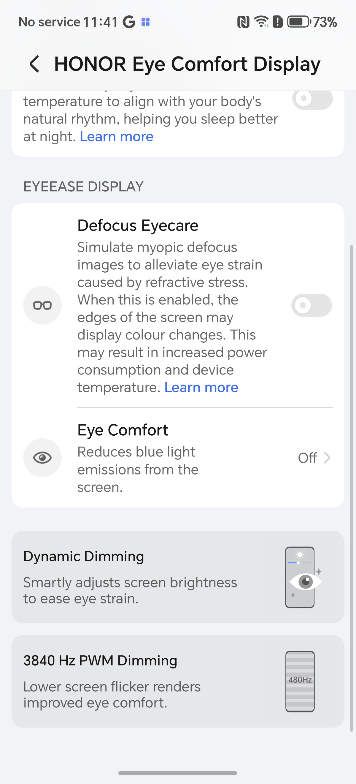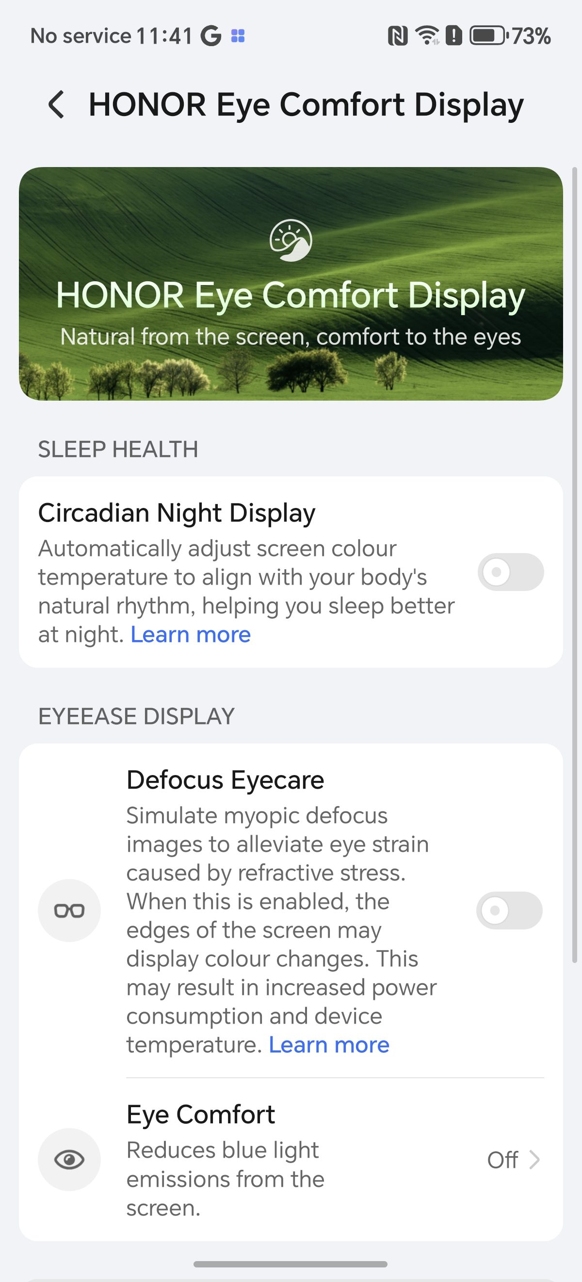 Prin setări am dat și de zona HONOR Eye Comfort Display, cu un panou ce aduce funcții pentru protejarea ochilor. Avem Eye Comfort care reduce emisiile de lumină albastră sau Defocus Eyecare care simulează imagini cu defocalizare miopică pentru a atenua oboseala ochilor cauzată de stresul de refracție.