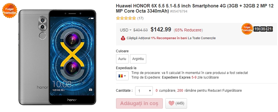 Nu vedem mereu smartphone-uri Huawei la promoție în ofertele retailerilor chinezi, dar astăzi dăm peste o astfel de promoție ce îl are drept vedetă pe Huawei Honor 6X. Acest telefon care sosește în varianta cu 3 GB RAM și 32 GB de stocare flash poate fi achiziționat în momentul de față pentru suma de doar 142.99 dolari, sumă la care dacă adăgăm și TVA-ul de 19% pe care îl avem de plătit odată cu sosirea produsului în țară, ajunge la 170.15 dolari.