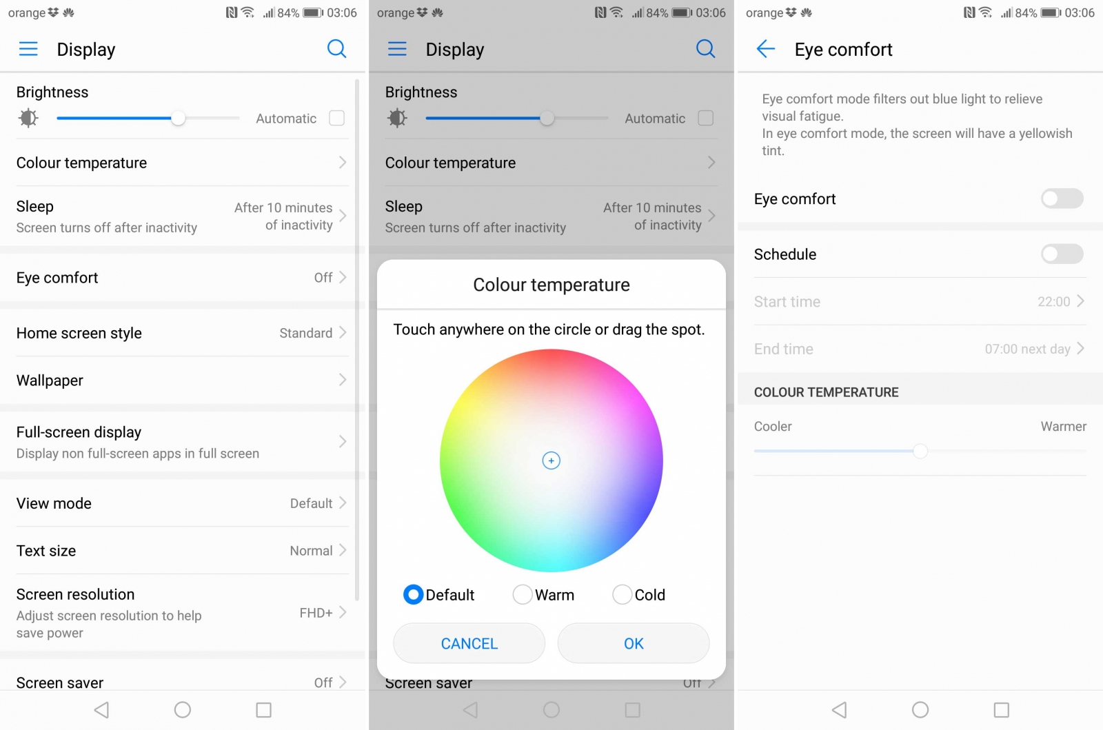 Suntem macat peste Mate 9 Pro, cu ai săi 354 LUX, dar sub HTC U11 şi LG G6. Setările ecranului includ reglajele de luminozitate, modul Sleep Eye comfort, cu slider pentru a face culorile mai calde sau mai reci, dar şi posibilitatea de a regla aspectul pentru aplicaţii (Full Screen Display). Avem şi opţiuni pentru mărimea textului, modul de vizualizare, rezoluţie (FHD+ sau HD+) şi modurile de culoare: Normal sau Vivid.