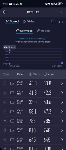 Când vine vorba de Wi-Fi, telefonul se revanșează clar. Conectat la rețeaua Digi Romania, folosind un abonament Fiberlink 1000, am atins un maxim de 810 Mbps la download și 785 Mbps la upload. Sunt rezultate excelente, care pun în valoare implementarea Wi-Fi și fac din Mate X7 un partener ideal pentru consum media, download rapid de fișiere mari și upload aproape instant de conținut.