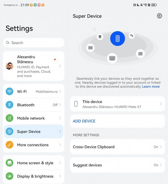Dincolo de conectivitatea clasică, Huawei Mate X7 îți permite să profiți din plin de ecosistemul producătorului prin opțiunile Super Device, care transformă telefonul într-un adevărat hub pentru celelalte dispozitive Huawei din apropiere. Conectarea tabletelor, laptopurilor, televizoarelor sau accesoriilor compatibile se face rapid și intuitiv, permițând transferul instant de conținut audio și video, dar și continuarea activităților de pe telefon pe ecrane mai mari.