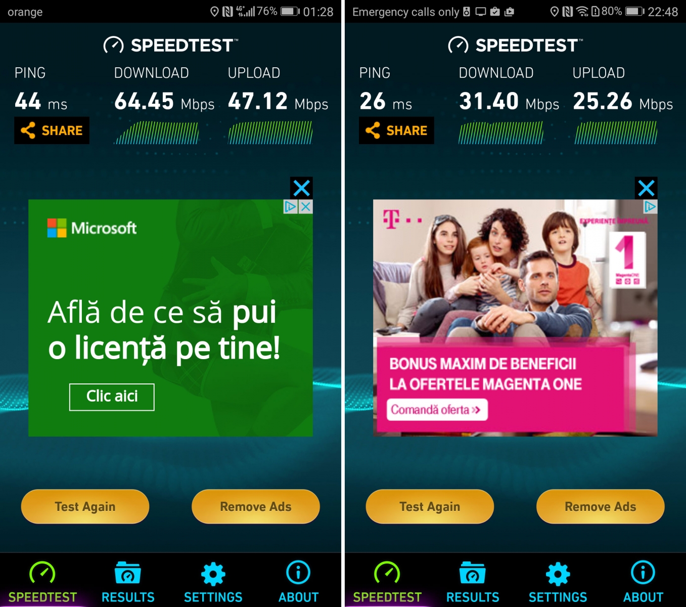 Nu am uitat de SpeedTest, astfel că am ajuns la 64 Mbps download în 4G şi 47 Mbps viteza upload. La testul WiFi am ajuns la 31 Mbps download şi 25 Mbps, rămânând în grafic faţă de ultimele modele testate.