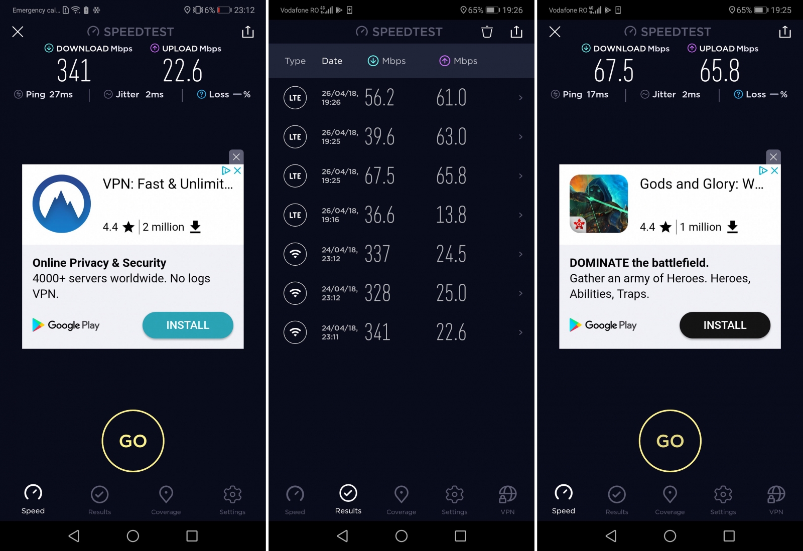 Ambele slot-uri SIM oferă conectivitate 4G, în cazul în care vă întrebaţi. Pe partea de apelare, avem Speed Dial, volum ridicat la apeluri şi sunet clar, dar mi se pare că difuzorul pentru convorbiri e prea mic şi poate fi acoperit uşor cu urechea din greşeală. Am făcut şi teste de viteze SpeedTest, atingând 67.5 Mbps la download 4G şi 65.8 Mbps la upload 4G.
