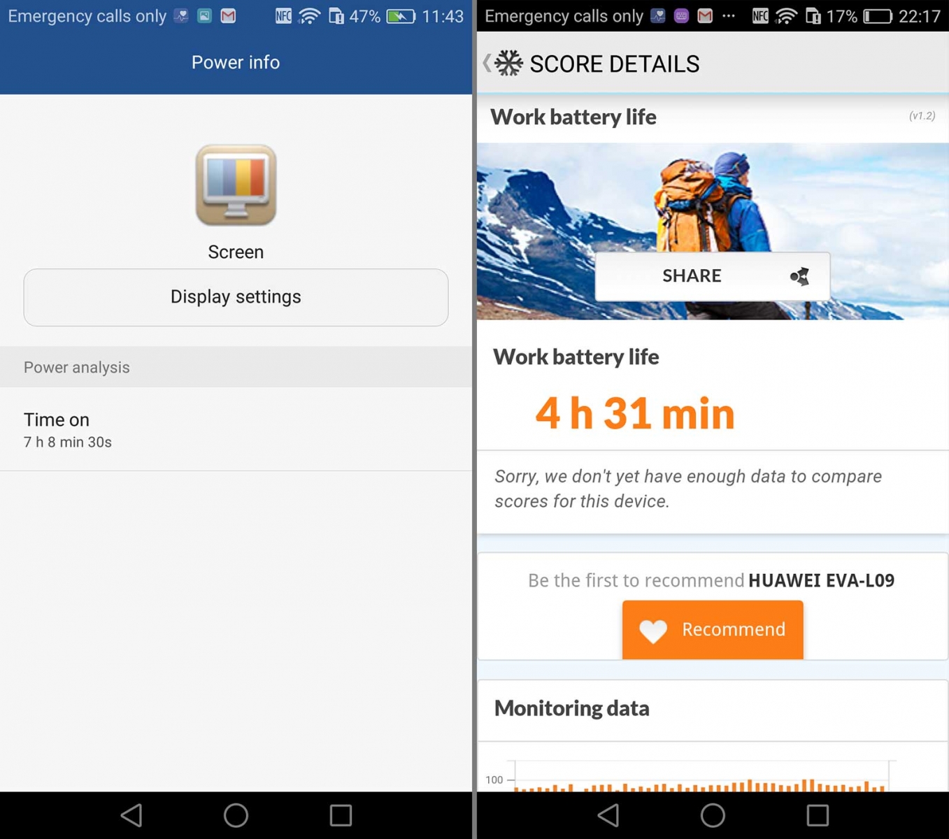 Mai mult decât atât, acest rezultat ne plasează sub Huawei P8 Lite şi sub un model foarte modest precum Mstar S700. Încărcarea se realizează în 2 ore şi 10 minute, ceea ce e rezonabil, mai ales că e cu 37 de minute mai scurtă decât pe Huawei P8. Setările au acum zona Power Saving mai bine ascunsă şi permit închiderea de aplicaţii energofage, dar şi utilizarea opţiunilor Power Plan de tip Performance, Smart, Ultra Power Saving. Ele au de-a face cu administrarea utilizării de CPU şi conectivitate.
