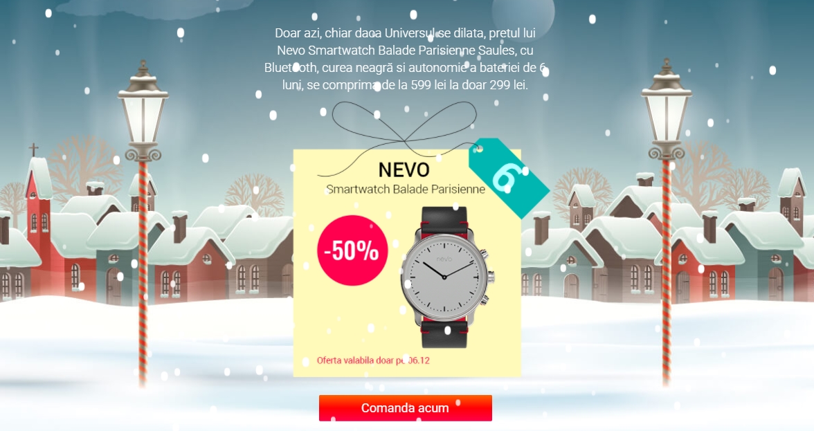În cele 18 zile ale campaniei veți descoperi zilnic câte un produs cu discount generos odată ce accesați pagina campaniei de aici. Aveți 24 ore la dispoziție pentru a achiziționa gadget-ul zilei și după cum putem observa, discount-urile sunt foarte atractive. Ieri pe data de 5 decembrie a fost pus în vânzare un smartband la suma de doar 29 lei, iar azi avem un smartwatch elegant ce pierde 50% din prețul inițial.