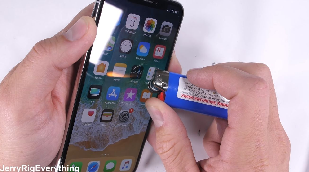 Jerry a abuzat şi protecţia camerei duale şi marginile din oţel inoxidabil, fără a lăsa urme prea adânci, chiar si cu cutter-ul. Trecând la testul cu bricheta, OLED-ul folosit de Apple rezistă 25 de secunde la flamă şi nu şi-a revenit, deci dauna e permanentă. La testul de îndoire, iPhone X a rezistat ca un campion, cu zero îndoire şi zero probleme. Nu se separă panoul de ecran de ramă, rezistența la apa e intactă şi orice ar face Jerry nu apare nici măcar o crăpătură.