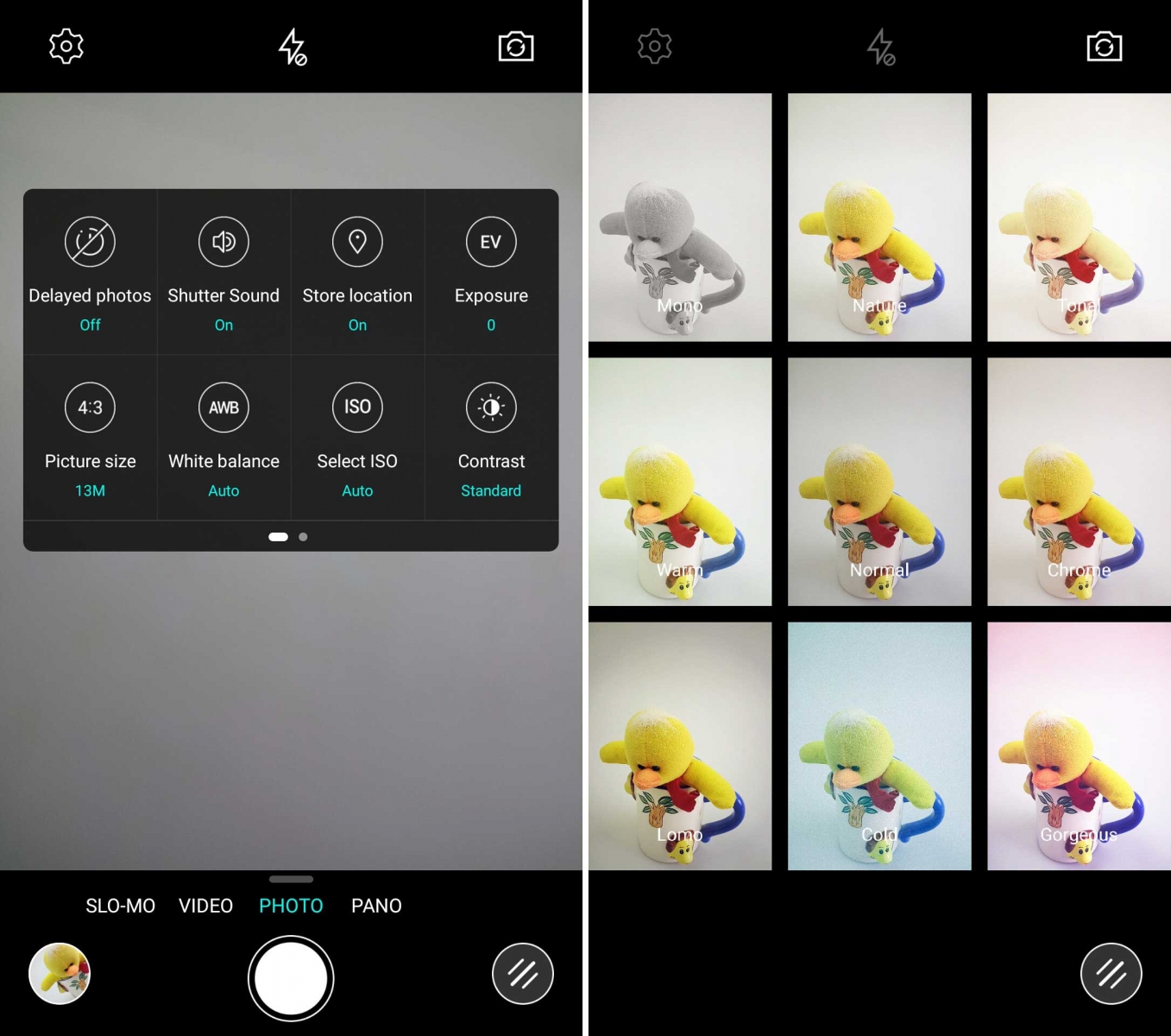 Aplicaţia Camera se deschide rapid şi este foarte minimalistă, chiar şi când e comparată cu una stock Lollipop sau Marshmallow. Primim filtre şi moduri de captură că Panorama, Photo, Video şi Slow Motion. Printre opţiuni se număra expunerea, rezoluţia (13 MP în 4:3 sau 10 MP în 16:9). Putem regla şi balansul de alb, ISO, contrastul, claritatea şi saturarea.
