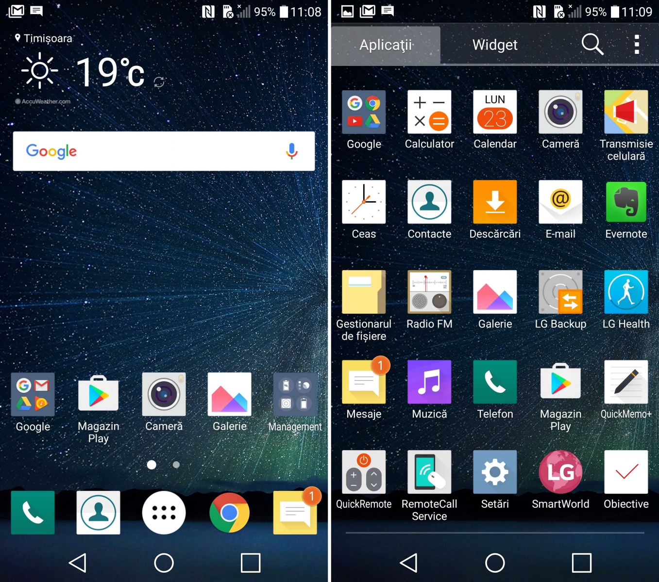 Widget-urile din această interfaţă sunt şi ele abstracte, plate şi minimaliste, iar multitasking-ul implică un carusel şi posibilitatea de a face app pinning pentru a ţine aplicaţiile active şi după ce dăm clear all. Fiind un device mare, era de aşteptat ca LG V10 să ofere şi un mod Dual Window, care ne permite să folosim două aplicaţii în acelaşi timp, împărţind ecranul în două.