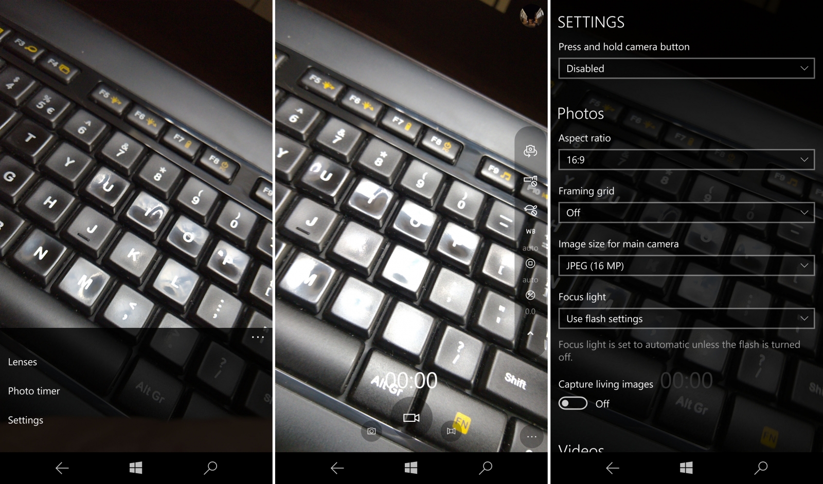 Putem realiza şi panoramă şi avem şi acele Lenses clasice, sub formă de aplicaţii descărcabile. Din Setări reglăm aspectul (16:9 sau 4:3), creăm şi acele Living Images (fotografie plus 3 secunde video) şi avem şi opţiuni video variate (stabilizare şi multiple framerate-uri pentru captura: 24, 25, 30 sau 60 FPS la filmare Full HD sau 24, 25, 30 FPS la 4K).