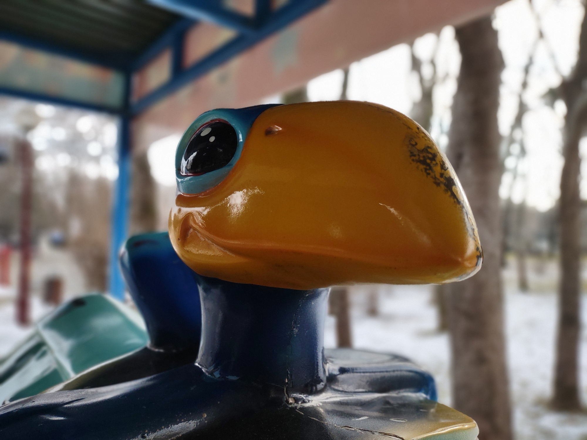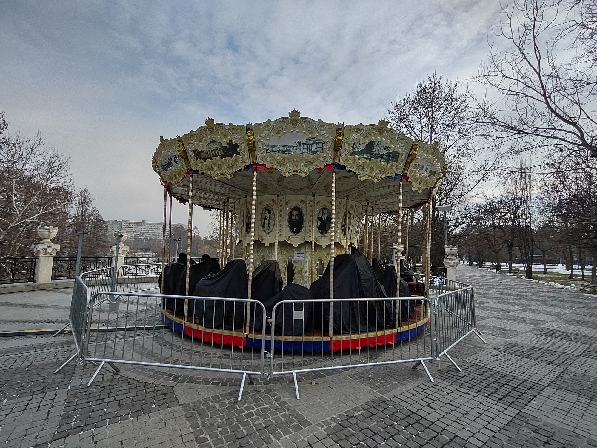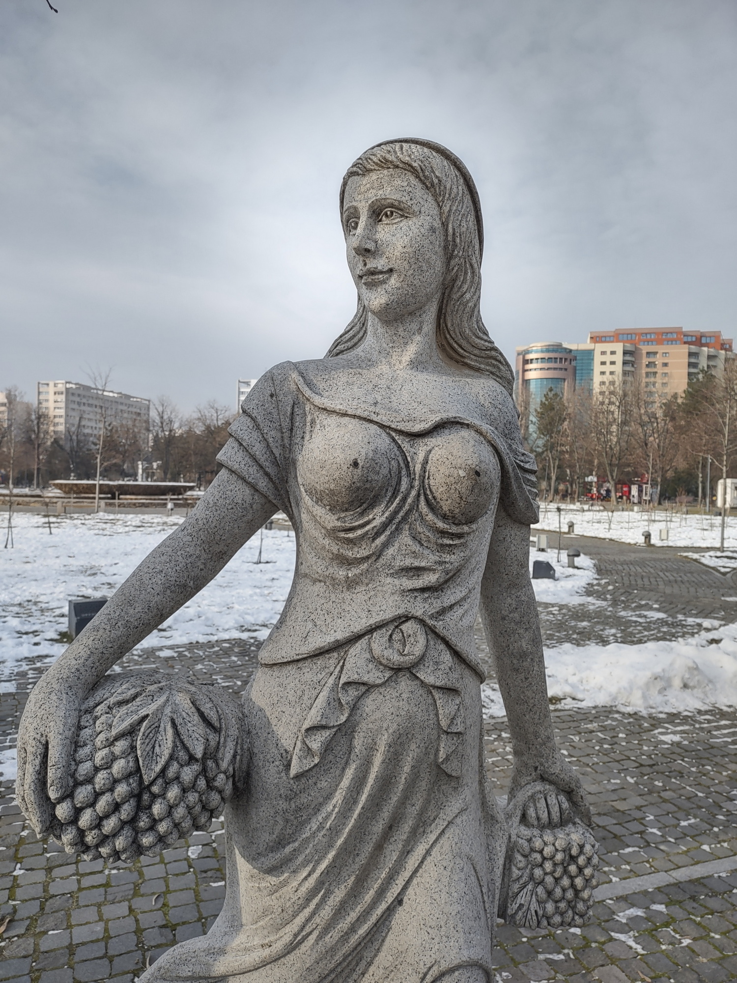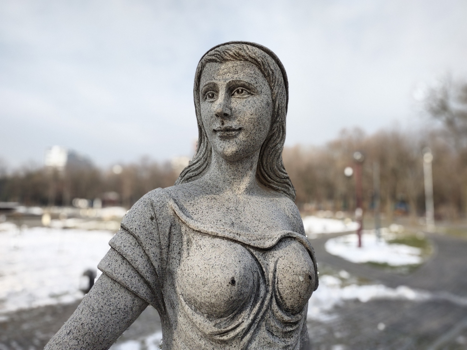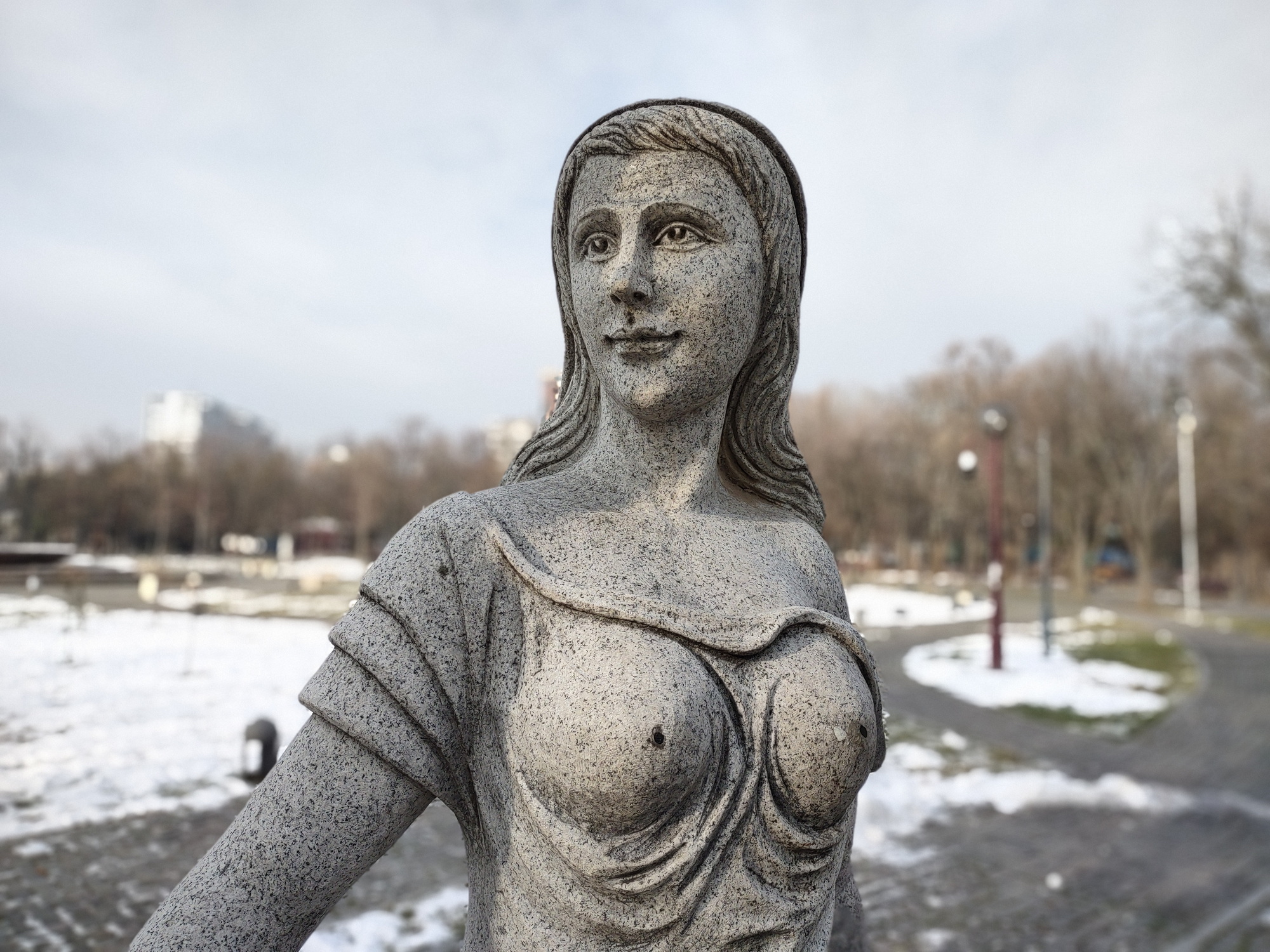 Apreciez şi luciul soarelui pe şaua căluţului de jucărie şi textura gheţii de pe jos, pe care era să alunec. Am şi un Bokeh reuşit cu statuia feminină din parc, chit că în jurul braţului său drept se produc nişte inexactităţi şi scapă o zonă clară de pavaj între braţul stâng şi corp. Atenţie şi la cum am prins acei zgrunţuri de gheaţă pe statuie a un Bokeh doar cu bustul.