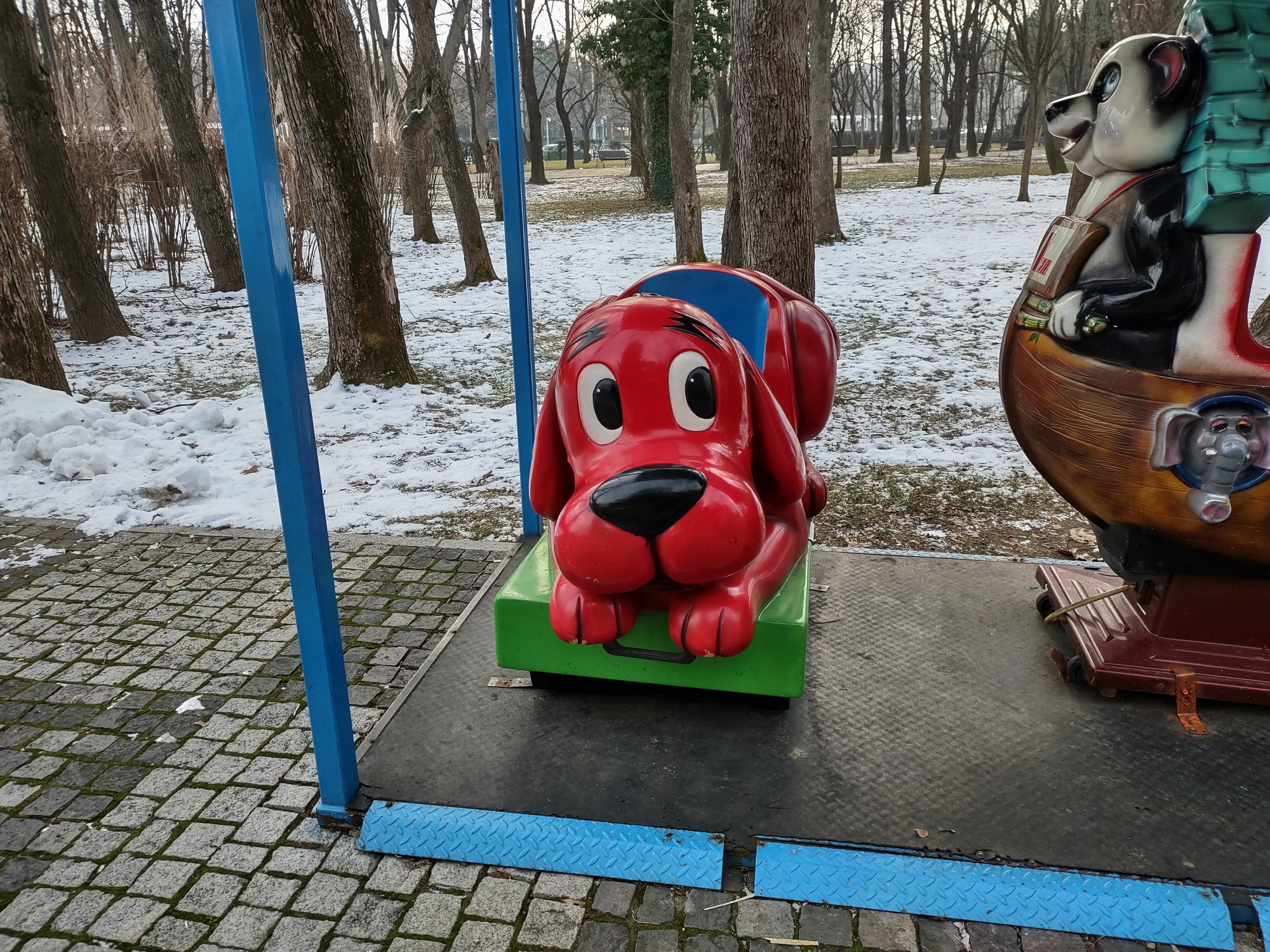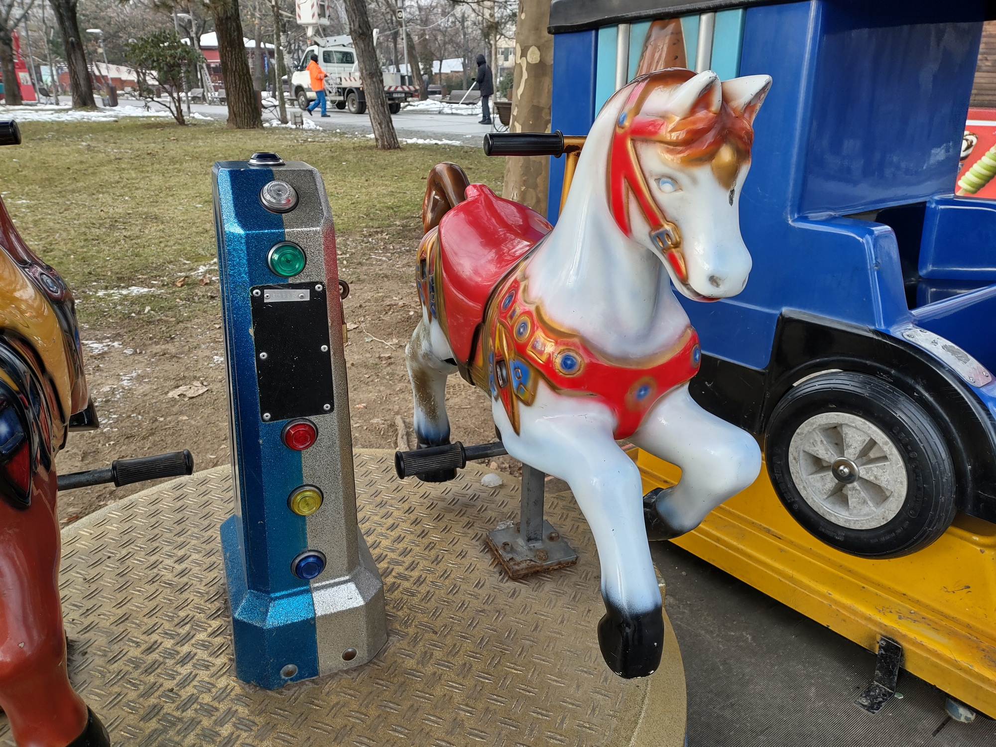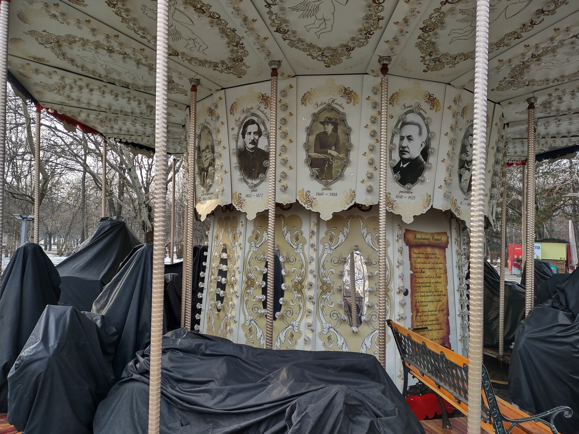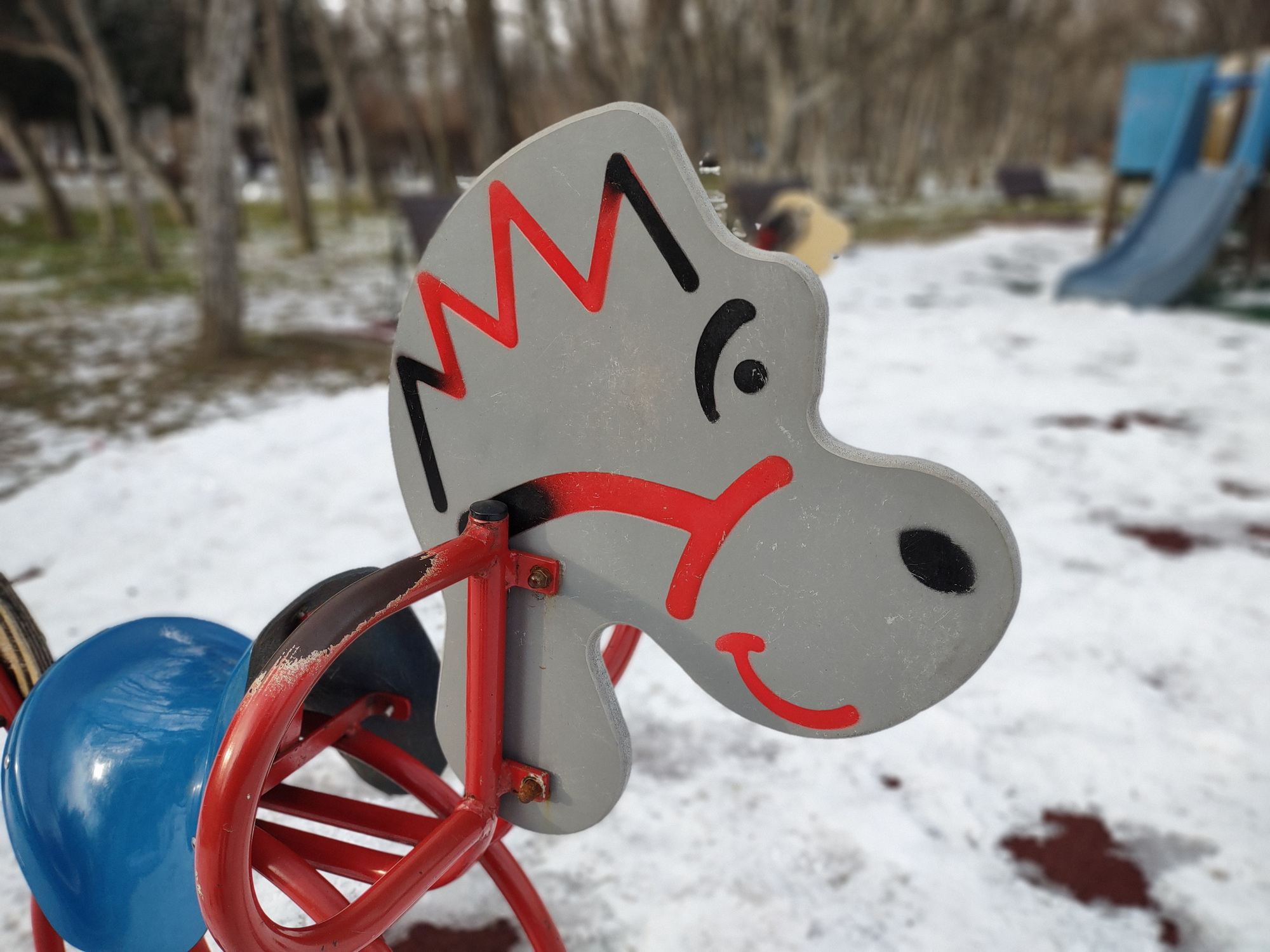 Apreciez şi luciul soarelui pe şaua căluţului de jucărie şi textura gheţii de pe jos, pe care era să alunec. Am şi un Bokeh reuşit cu statuia feminină din parc, chit că în jurul braţului său drept se produc nişte inexactităţi şi scapă o zonă clară de pavaj între braţul stâng şi corp. Atenţie şi la cum am prins acei zgrunţuri de gheaţă pe statuie a un Bokeh doar cu bustul.