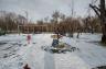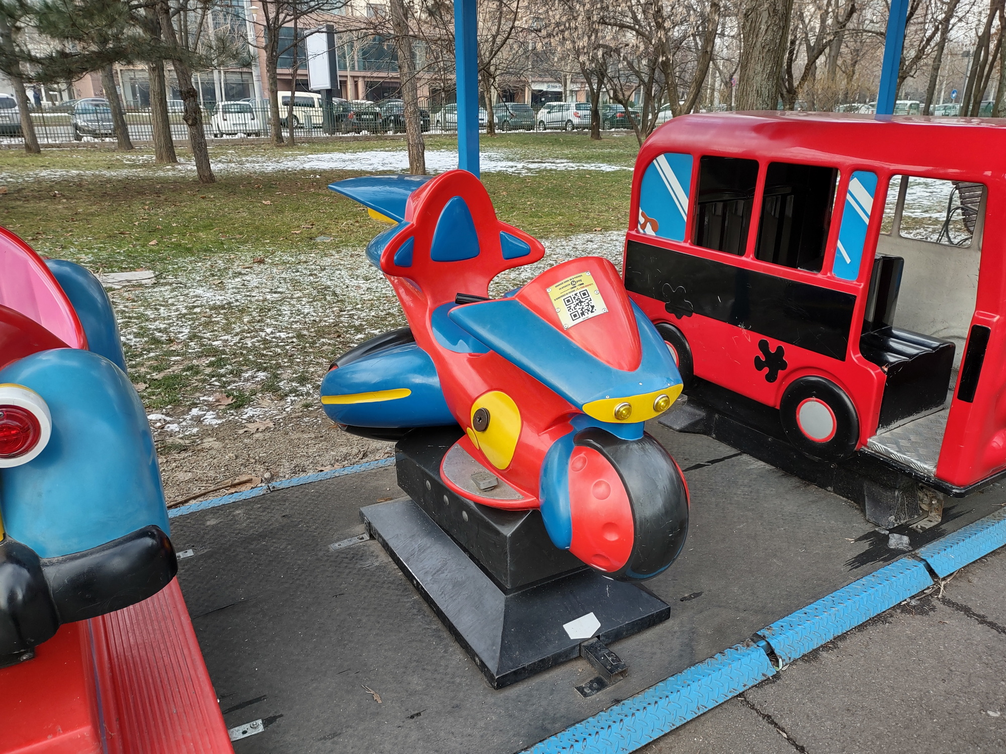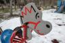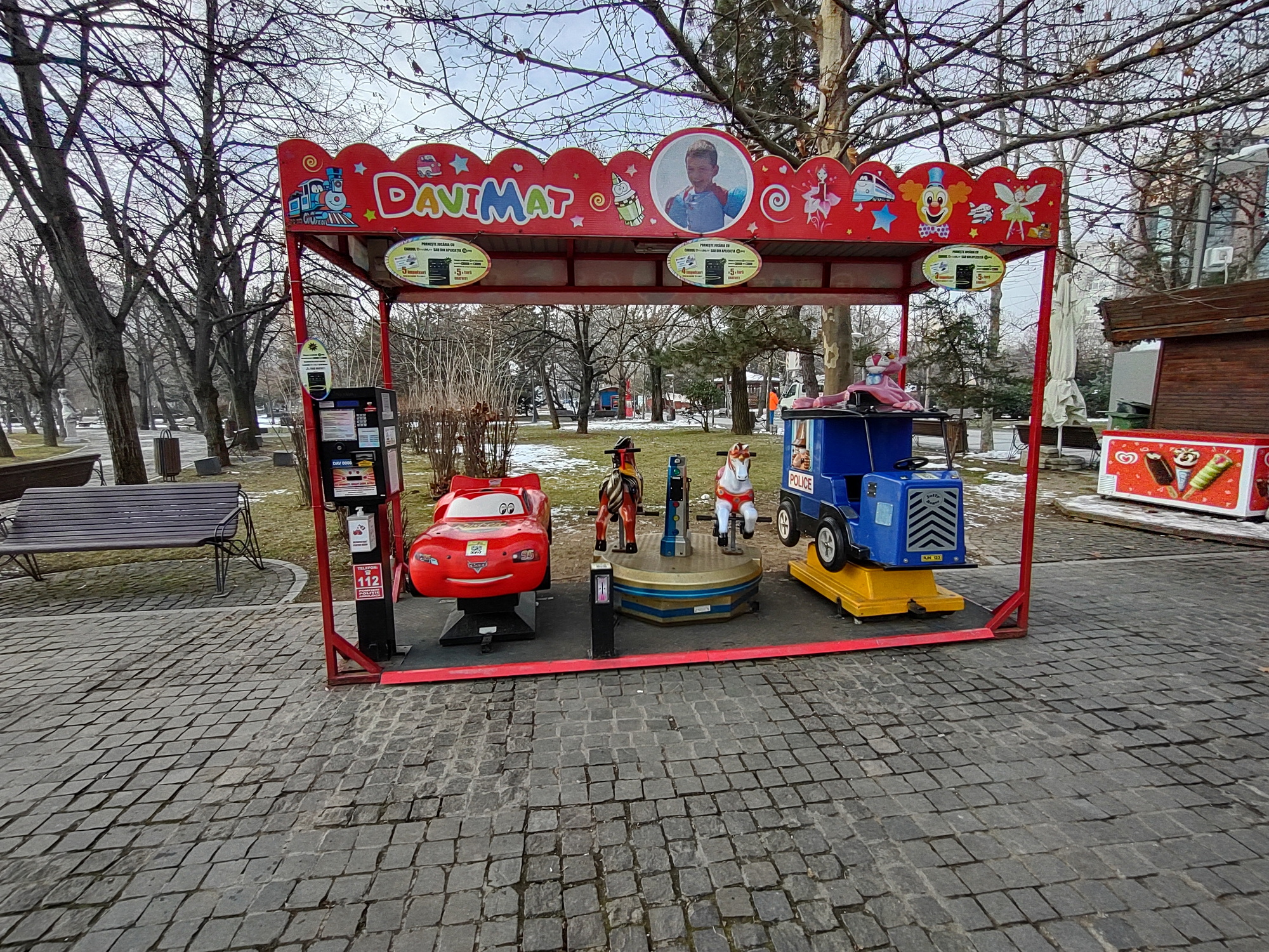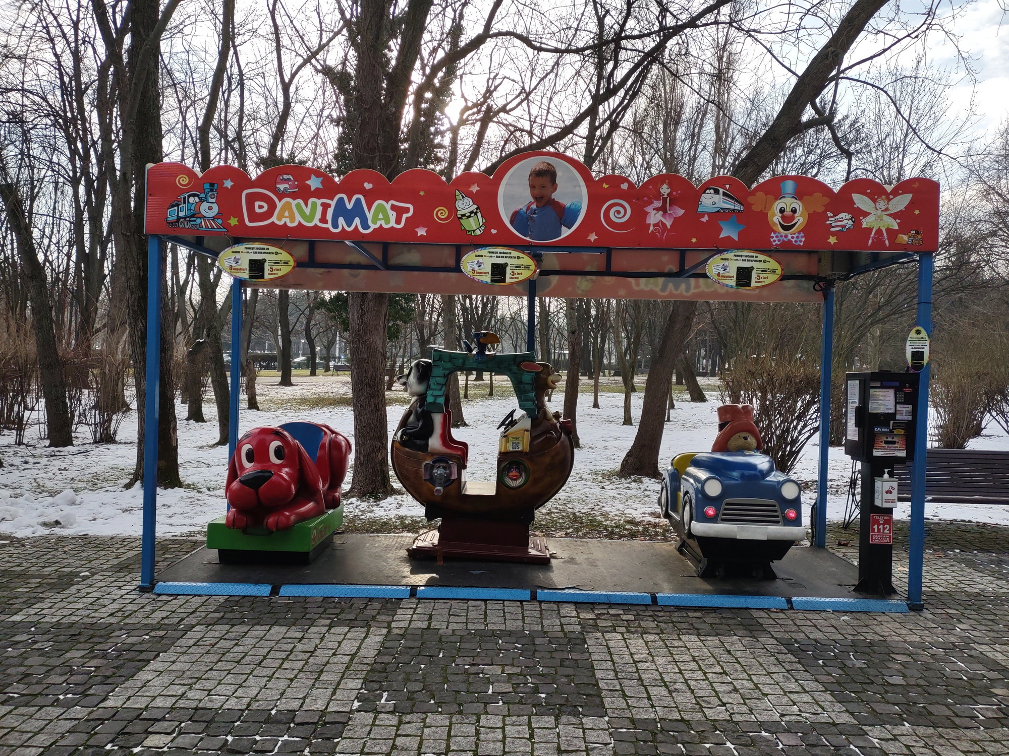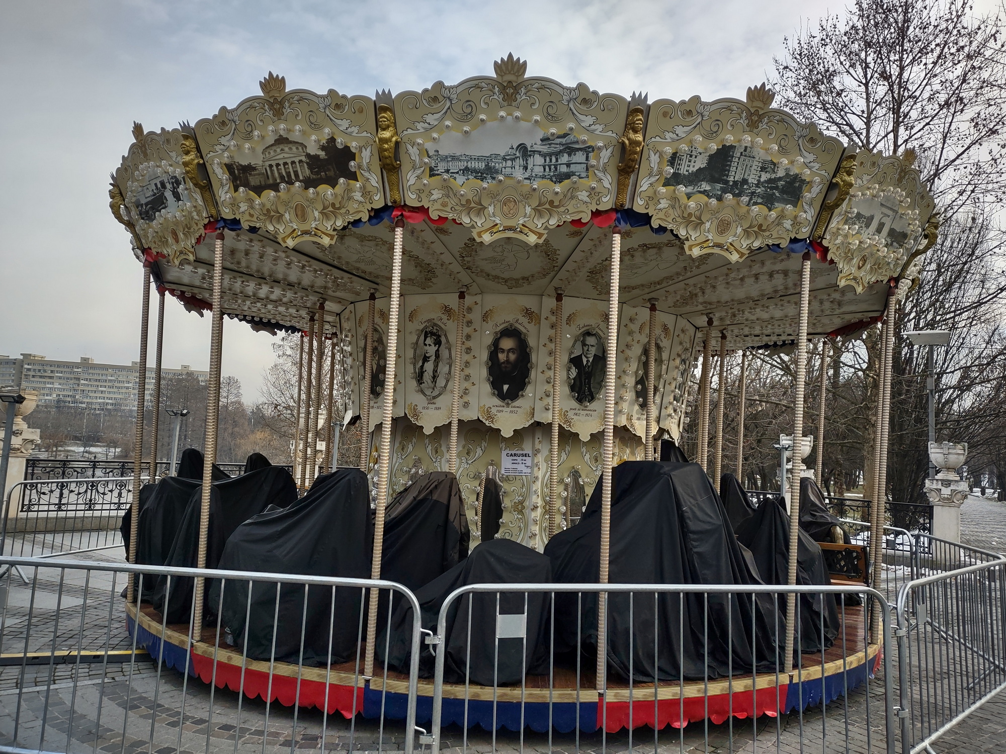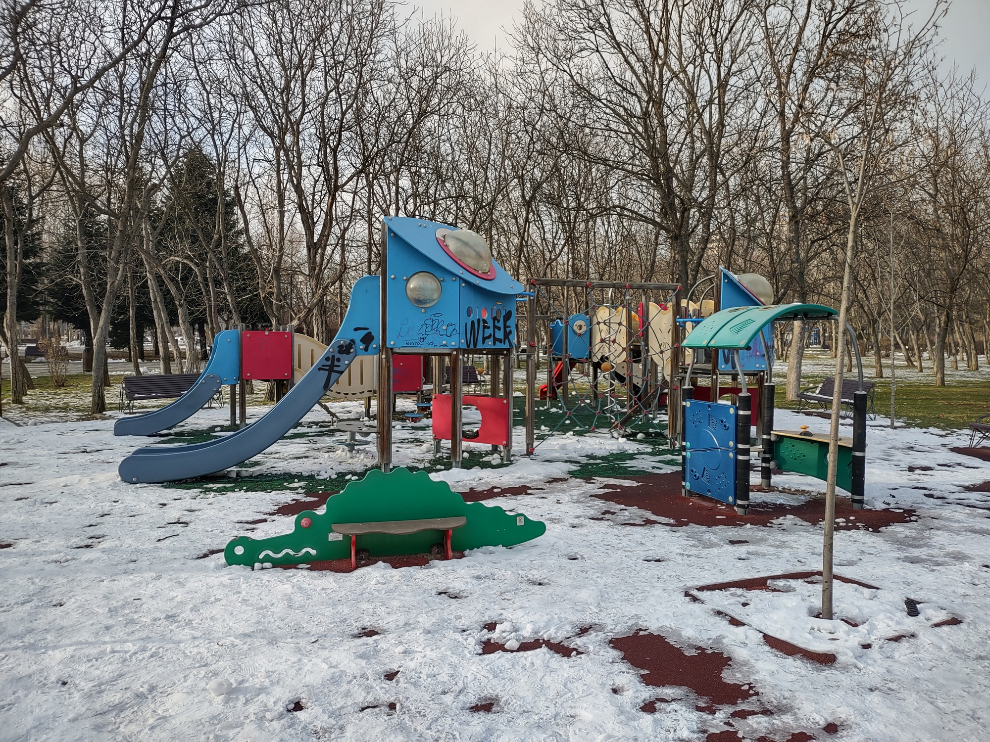 Apreciez şi luciul soarelui pe şaua căluţului de jucărie şi textura gheţii de pe jos, pe care era să alunec. Am şi un Bokeh reuşit cu statuia feminină din parc, chit că în jurul braţului său drept se produc nişte inexactităţi şi scapă o zonă clară de pavaj între braţul stâng şi corp. Atenţie şi la cum am prins acei zgrunţuri de gheaţă pe statuie a un Bokeh doar cu bustul.