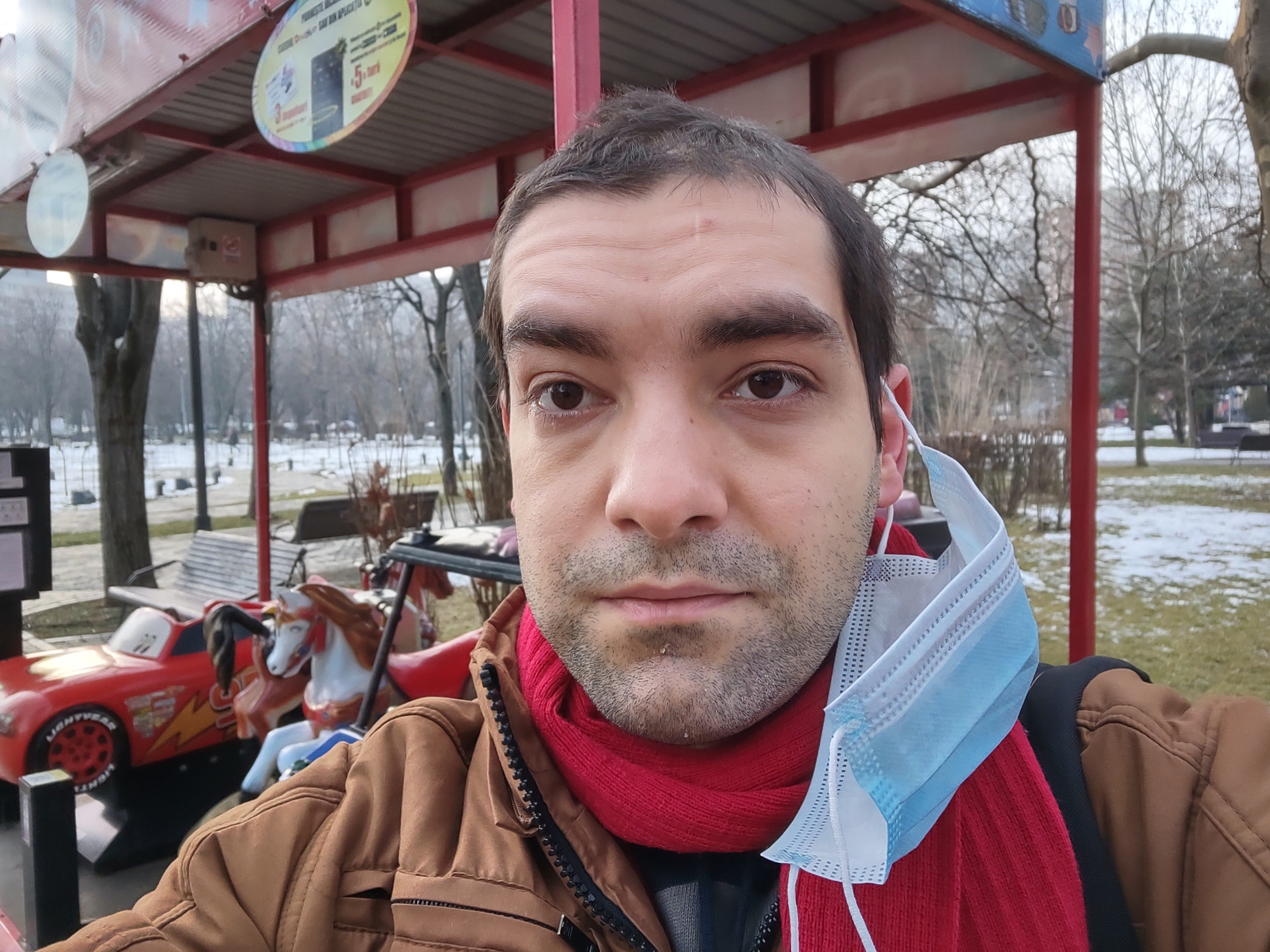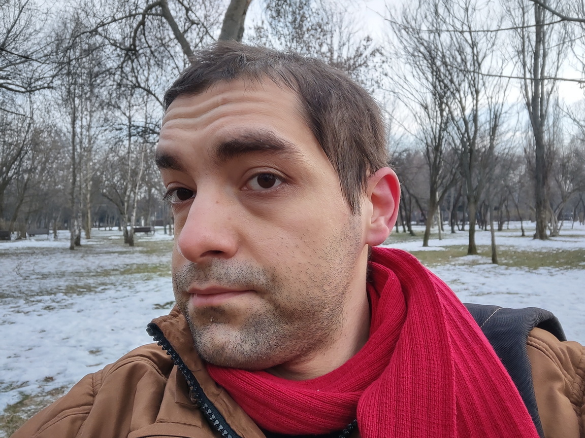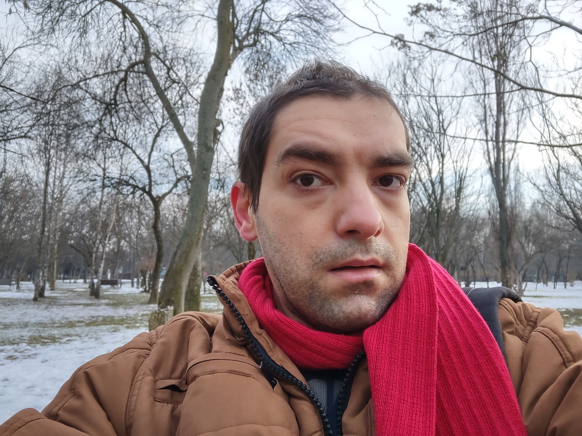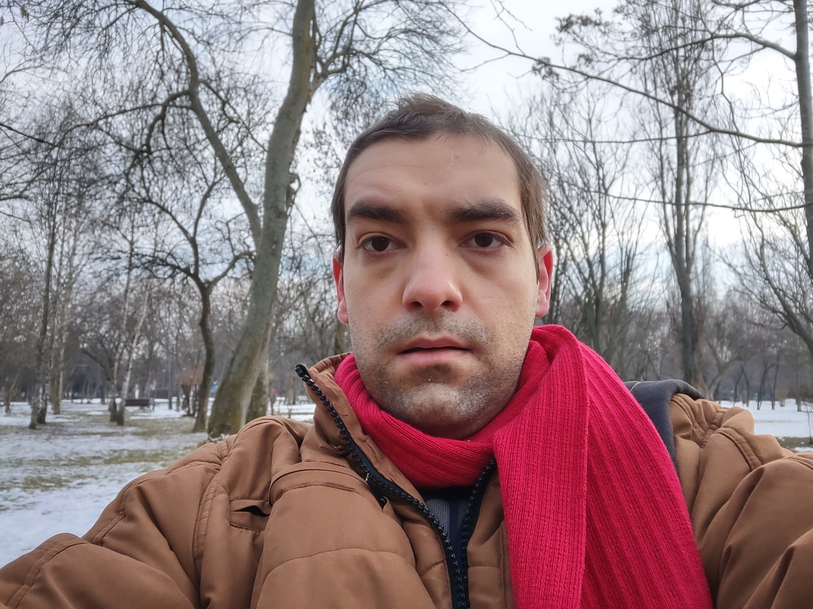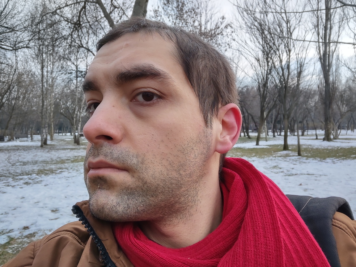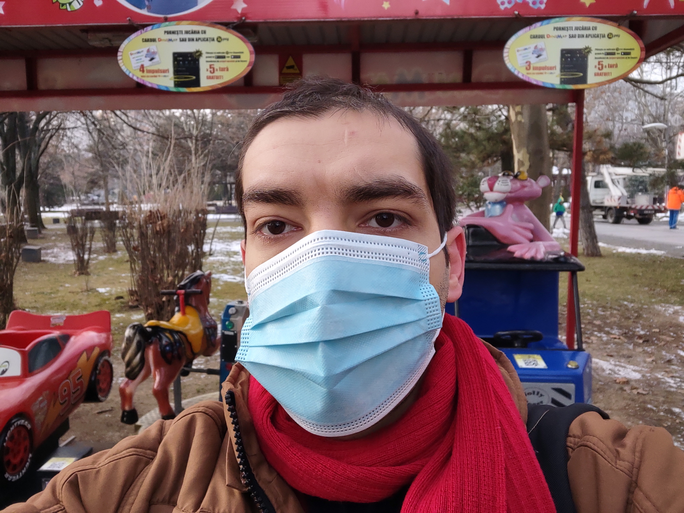 La selfie continui să fiu fascinat de detalii, la nivel de pori, păr facial şi îmi place şi fundalul estompat natural, dar cu detalii vizibile. Îmi place cum arată textura părului, ochii sunt expresivi, hainele sunt clar redate. Fata este şi ea expresiva, iar Bokeh a separat corect chipul de fundal, cu tot cu urechi roşii îngheţate de frig şi cu masca. Prima rundă de selfie a fost la 16 MP, iar a doua la 4 MP. În a doua lipsesc detaliile, avem o piele de bebeluş, prea întinsă, ce scade expresivitatea. Bokeh continuă să arate bine totuşi şi chiar şi cu soarele intrat în nori am realizat selfie-uri demne de postat în social media, dacă ignori alură de Grumpy Cat. Mi-a tăiat puţin din lobul urechii totuşi acel Bokeh, dar apreciez textura părului facial şi a buzelor.