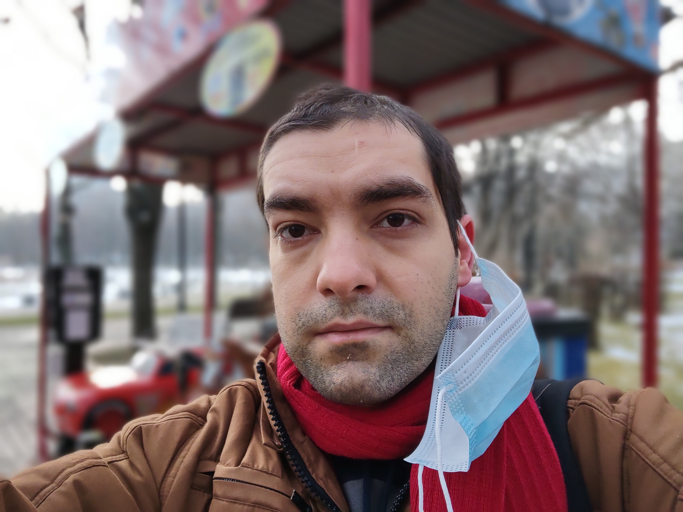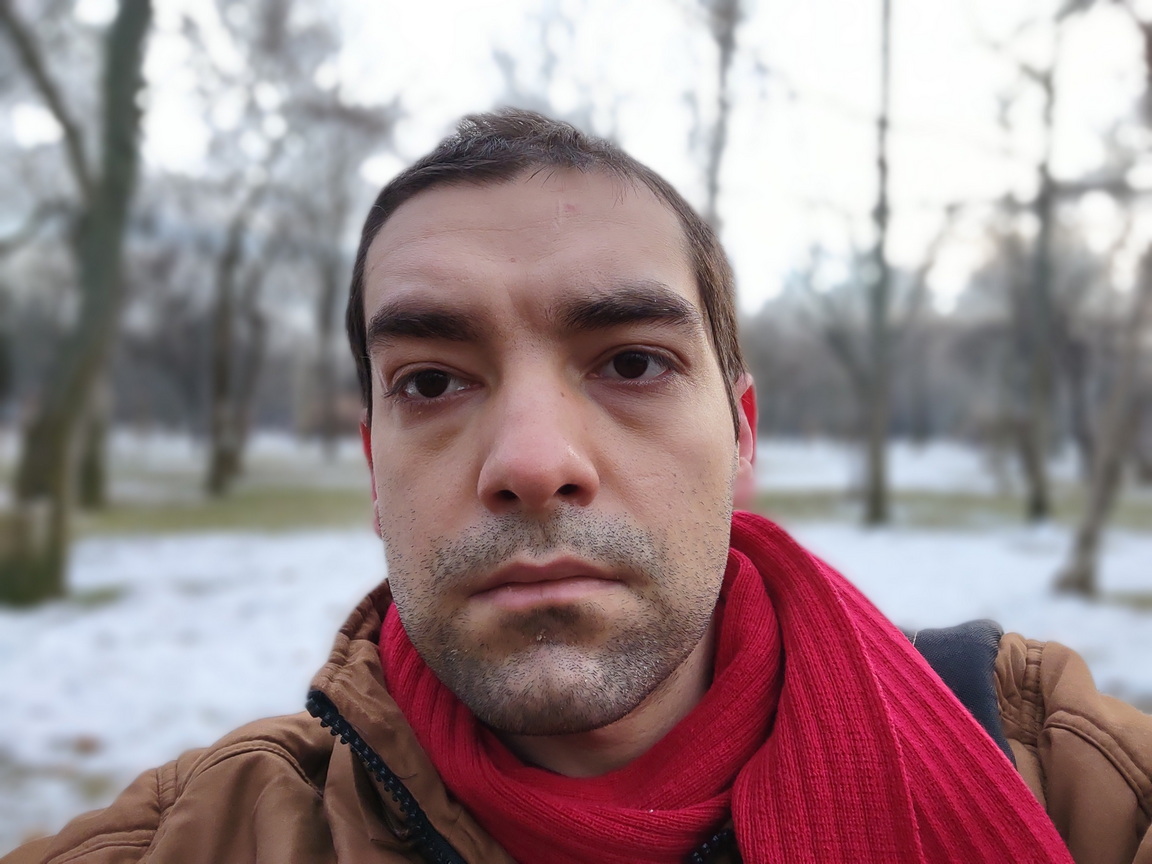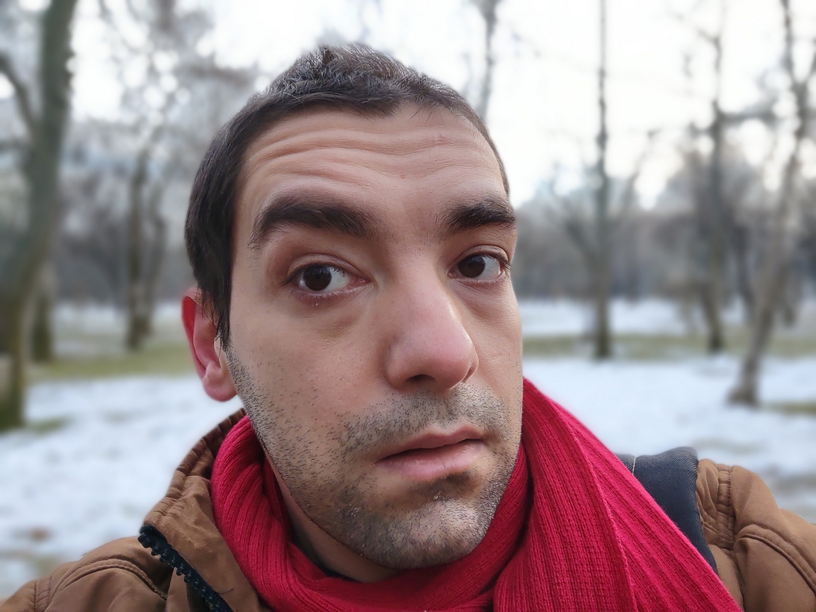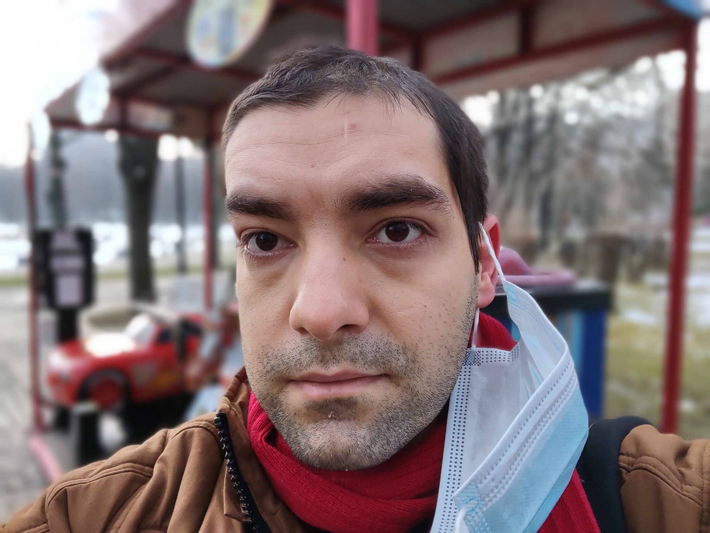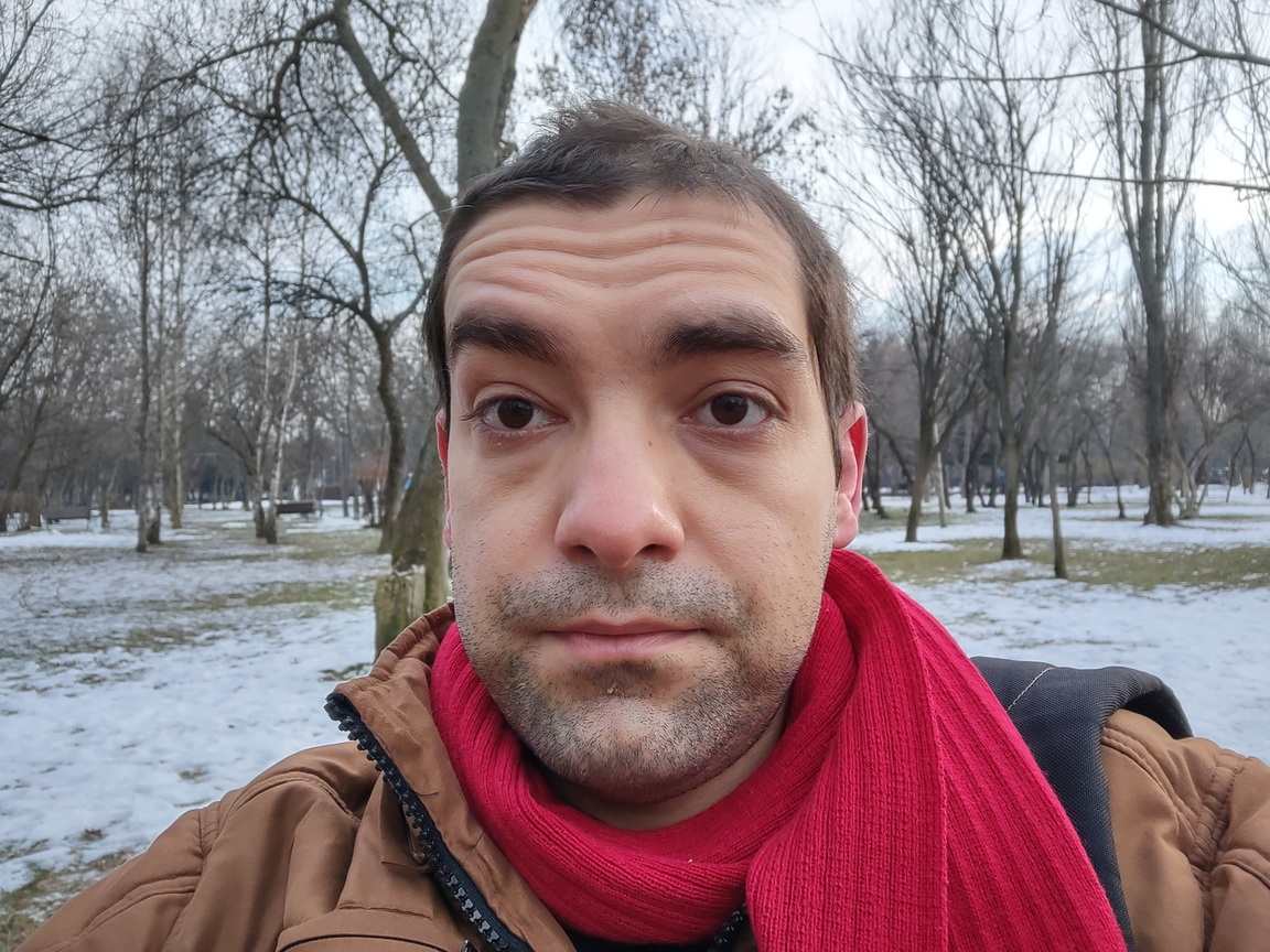 La selfie continui să fiu fascinat de detalii, la nivel de pori, păr facial şi îmi place şi fundalul estompat natural, dar cu detalii vizibile. Îmi place cum arată textura părului, ochii sunt expresivi, hainele sunt clar redate. Fata este şi ea expresiva, iar Bokeh a separat corect chipul de fundal, cu tot cu urechi roşii îngheţate de frig şi cu masca. Prima rundă de selfie a fost la 16 MP, iar a doua la 4 MP. În a doua lipsesc detaliile, avem o piele de bebeluş, prea întinsă, ce scade expresivitatea. Bokeh continuă să arate bine totuşi şi chiar şi cu soarele intrat în nori am realizat selfie-uri demne de postat în social media, dacă ignori alură de Grumpy Cat. Mi-a tăiat puţin din lobul urechii totuşi acel Bokeh, dar apreciez textura părului facial şi a buzelor.