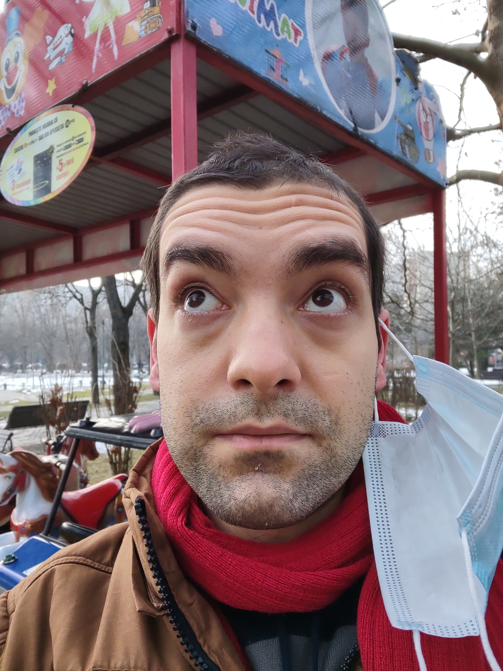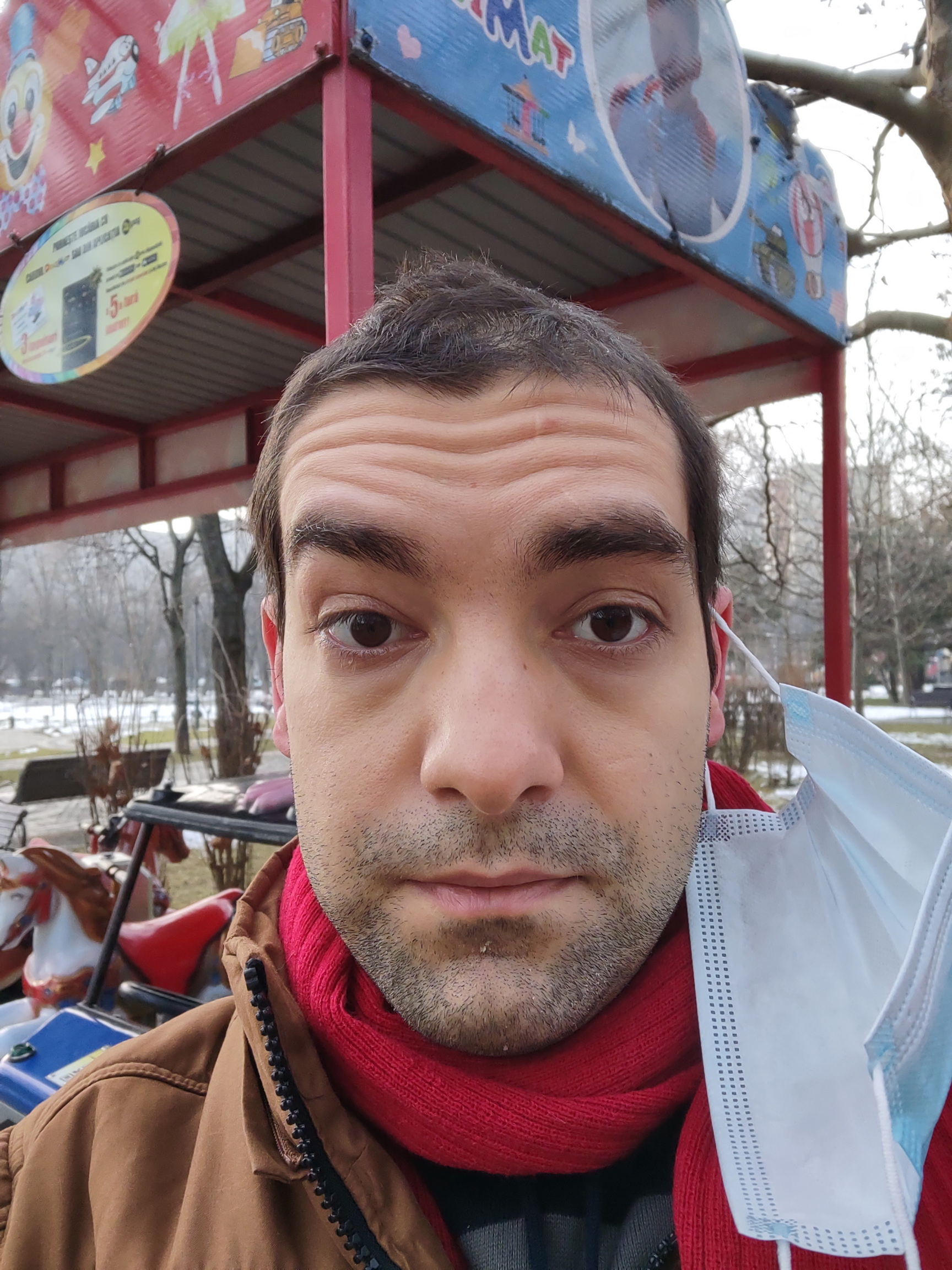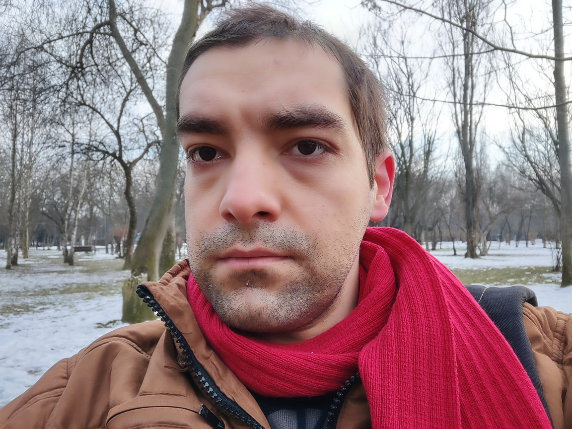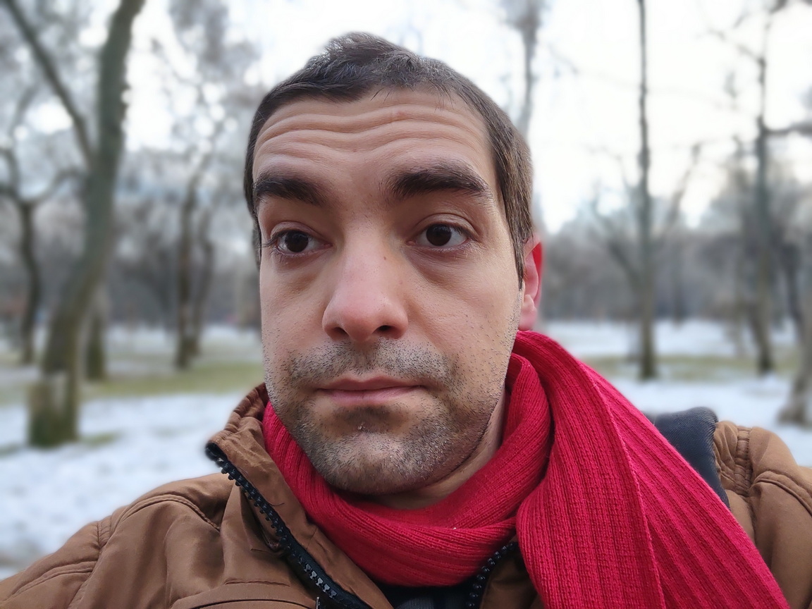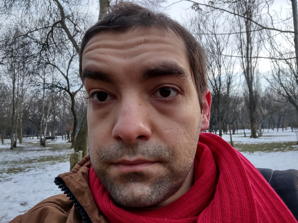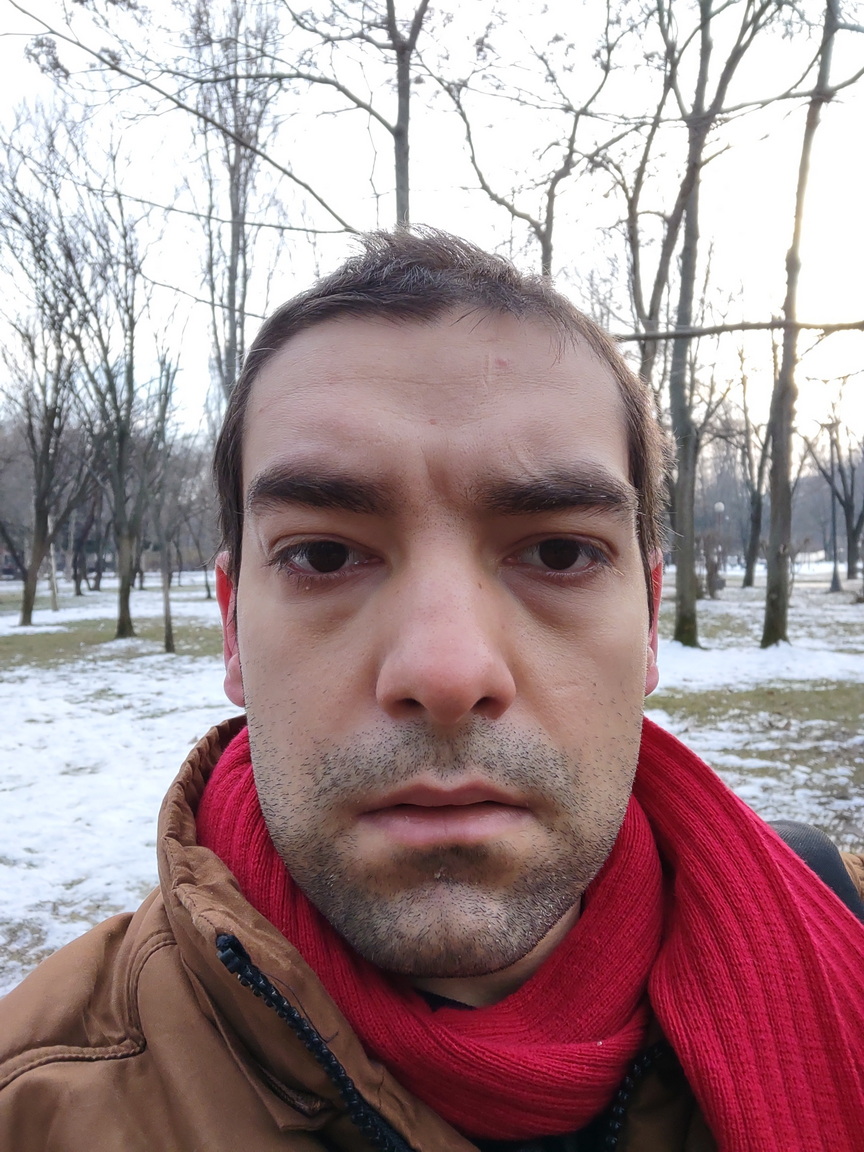 La selfie continui să fiu fascinat de detalii, la nivel de pori, păr facial şi îmi place şi fundalul estompat natural, dar cu detalii vizibile. Îmi place cum arată textura părului, ochii sunt expresivi, hainele sunt clar redate. Fata este şi ea expresiva, iar Bokeh a separat corect chipul de fundal, cu tot cu urechi roşii îngheţate de frig şi cu masca. Prima rundă de selfie a fost la 16 MP, iar a doua la 4 MP. În a doua lipsesc detaliile, avem o piele de bebeluş, prea întinsă, ce scade expresivitatea. Bokeh continuă să arate bine totuşi şi chiar şi cu soarele intrat în nori am realizat selfie-uri demne de postat în social media, dacă ignori alură de Grumpy Cat. Mi-a tăiat puţin din lobul urechii totuşi acel Bokeh, dar apreciez textura părului facial şi a buzelor.