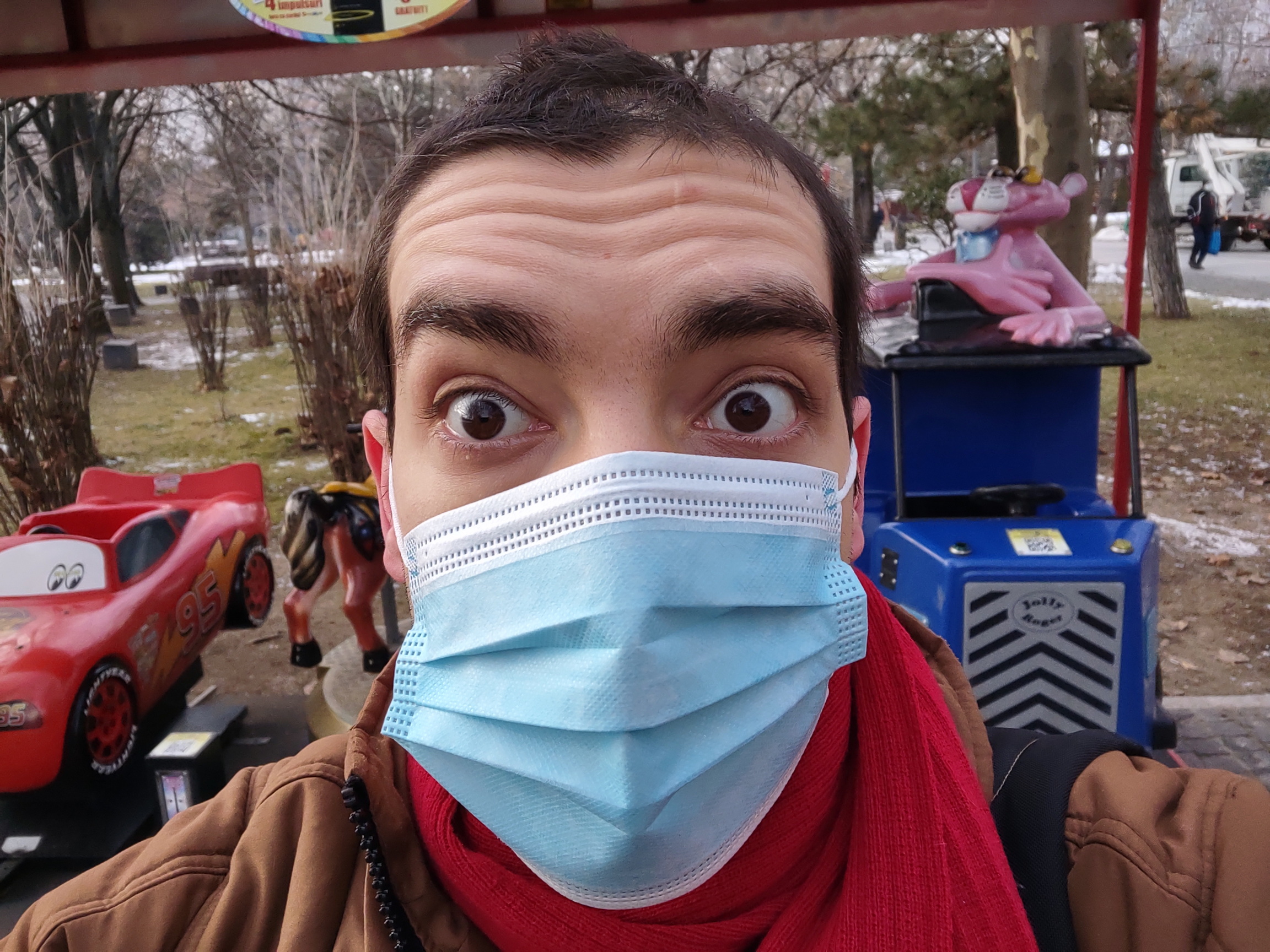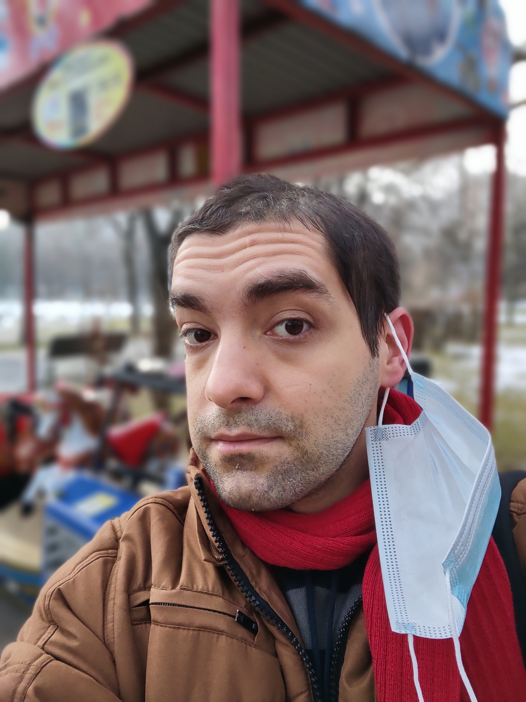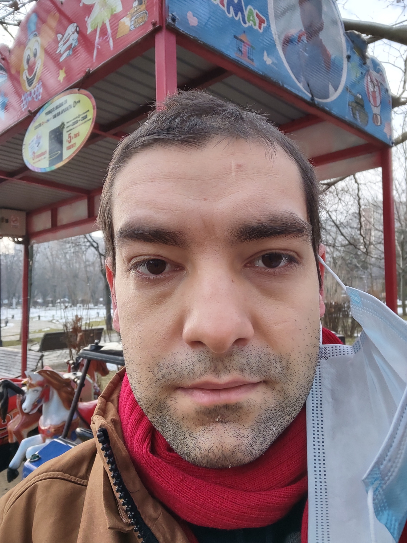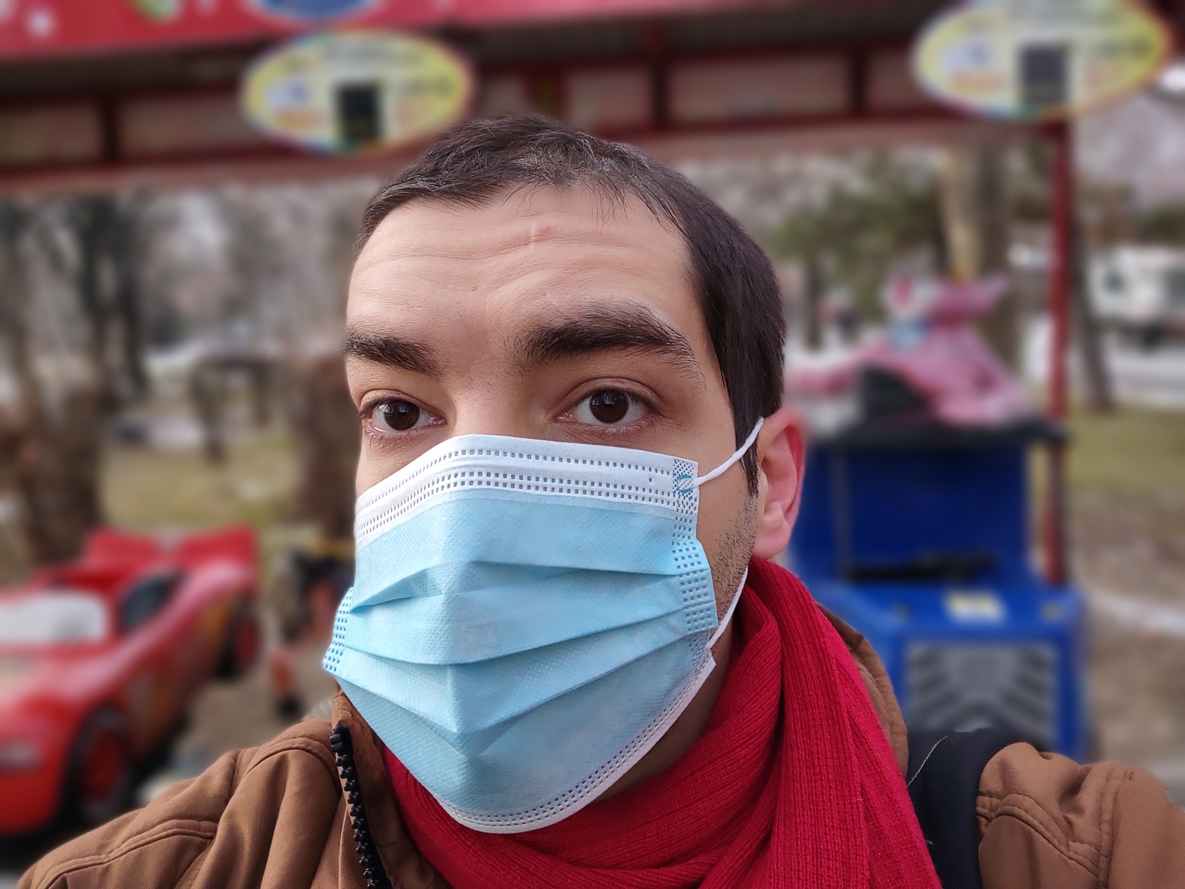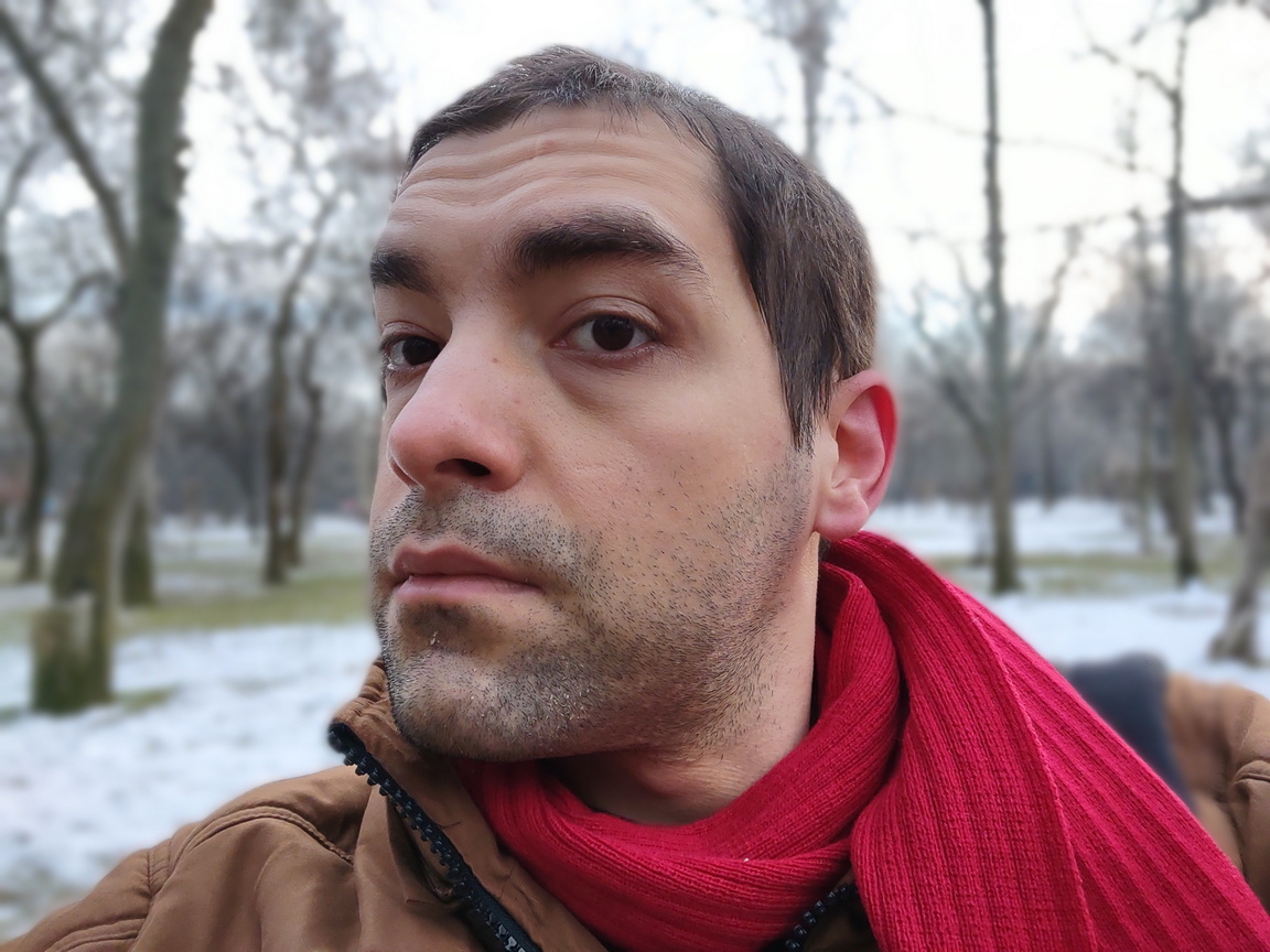 La selfie continui să fiu fascinat de detalii, la nivel de pori, păr facial şi îmi place şi fundalul estompat natural, dar cu detalii vizibile. Îmi place cum arată textura părului, ochii sunt expresivi, hainele sunt clar redate. Fata este şi ea expresiva, iar Bokeh a separat corect chipul de fundal, cu tot cu urechi roşii îngheţate de frig şi cu masca. Prima rundă de selfie a fost la 16 MP, iar a doua la 4 MP. În a doua lipsesc detaliile, avem o piele de bebeluş, prea întinsă, ce scade expresivitatea. Bokeh continuă să arate bine totuşi şi chiar şi cu soarele intrat în nori am realizat selfie-uri demne de postat în social media, dacă ignori alură de Grumpy Cat. Mi-a tăiat puţin din lobul urechii totuşi acel Bokeh, dar apreciez textura părului facial şi a buzelor.