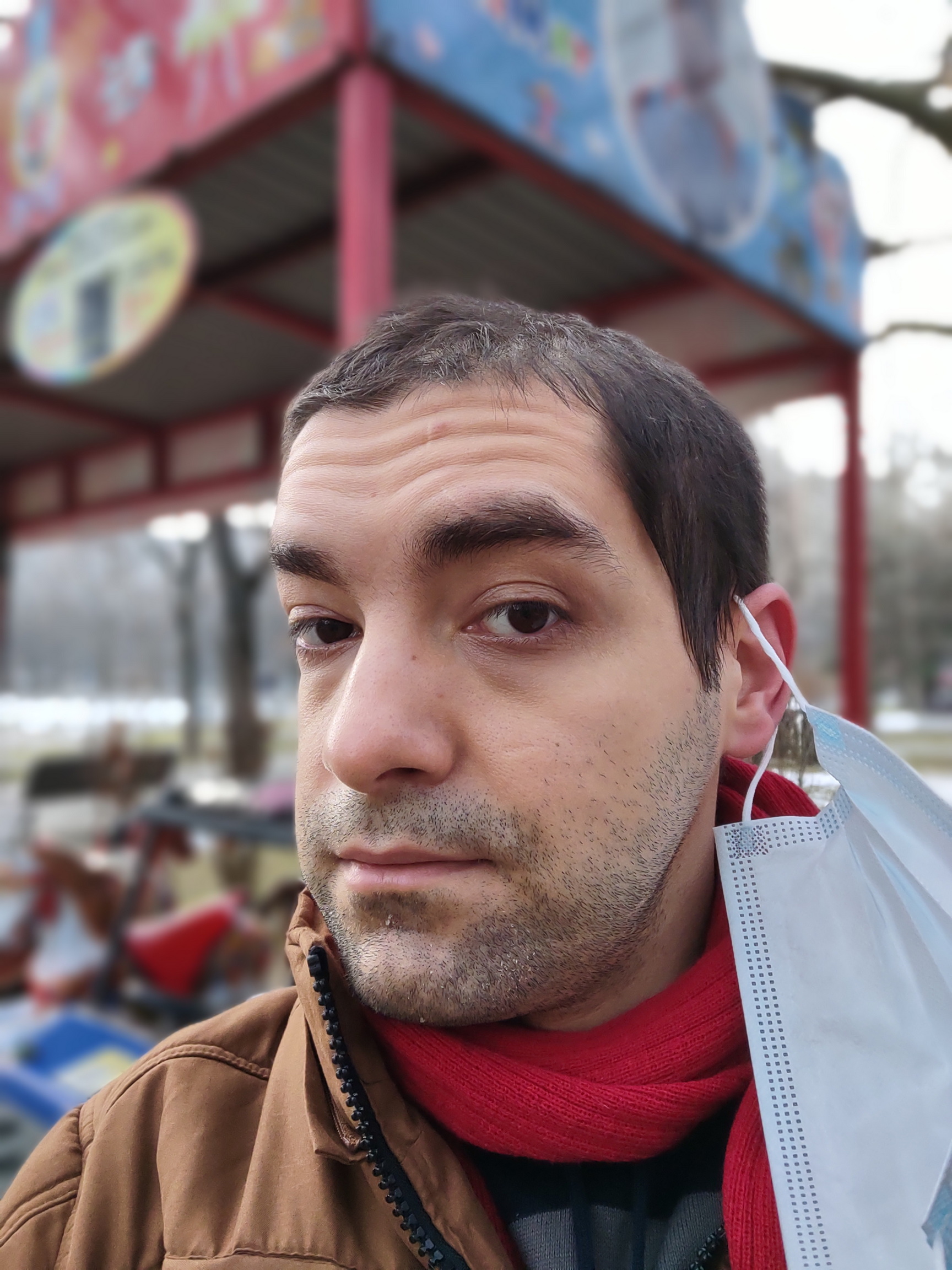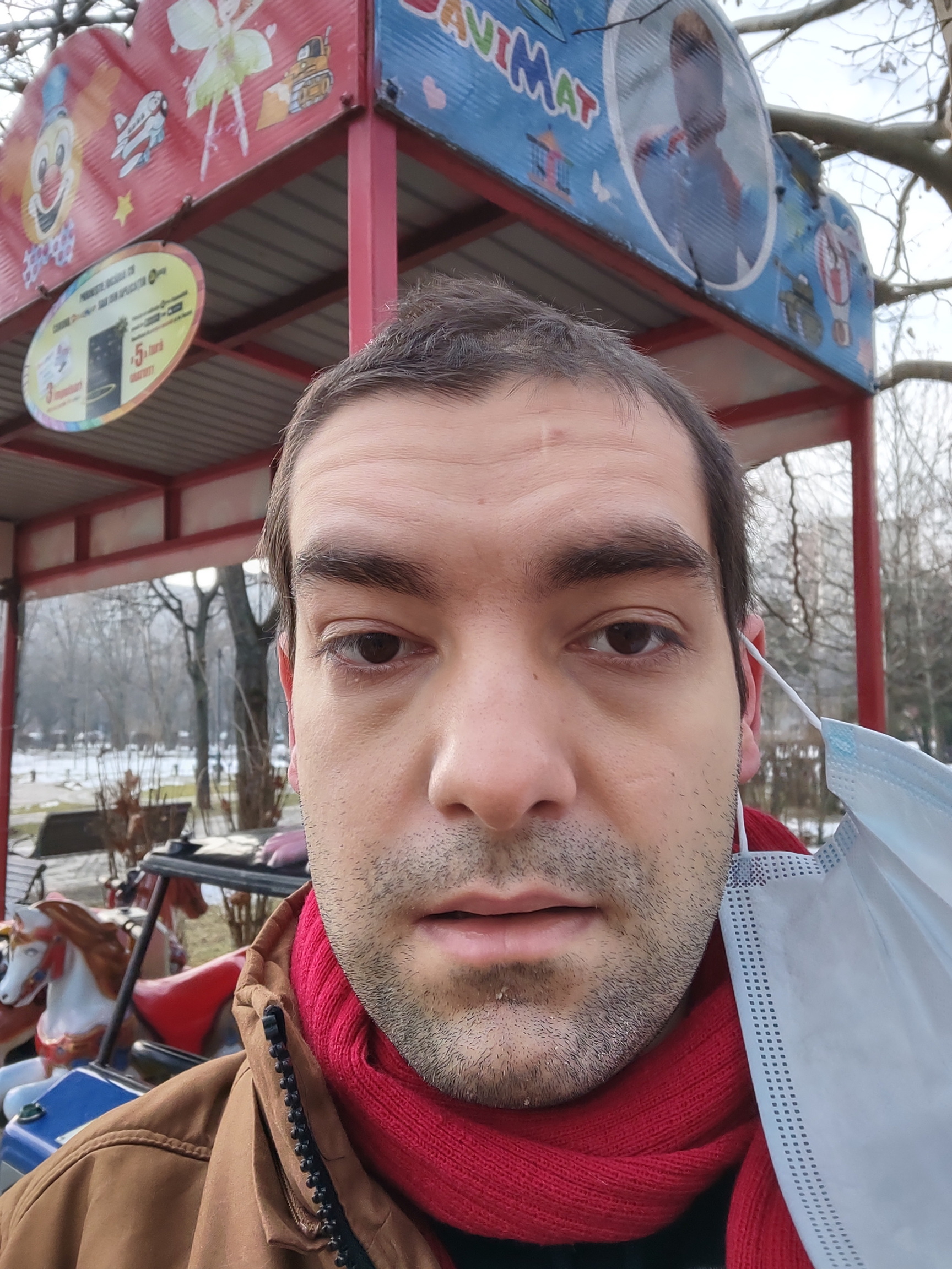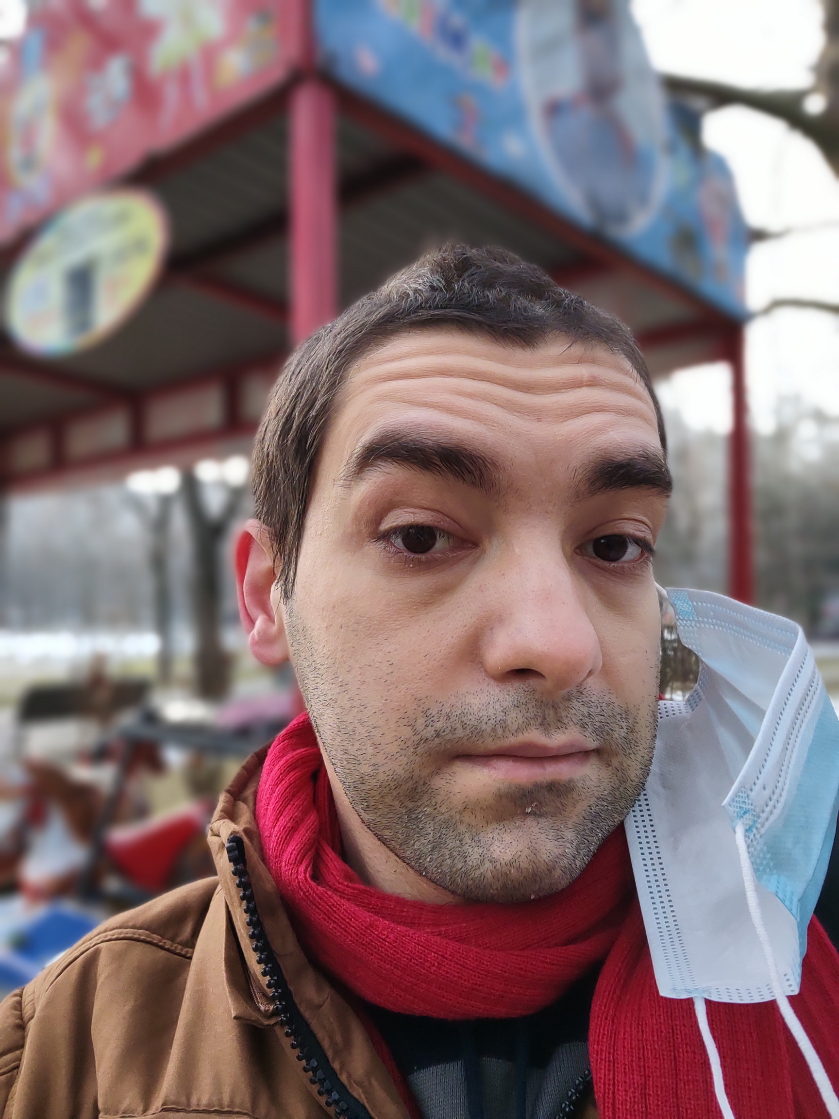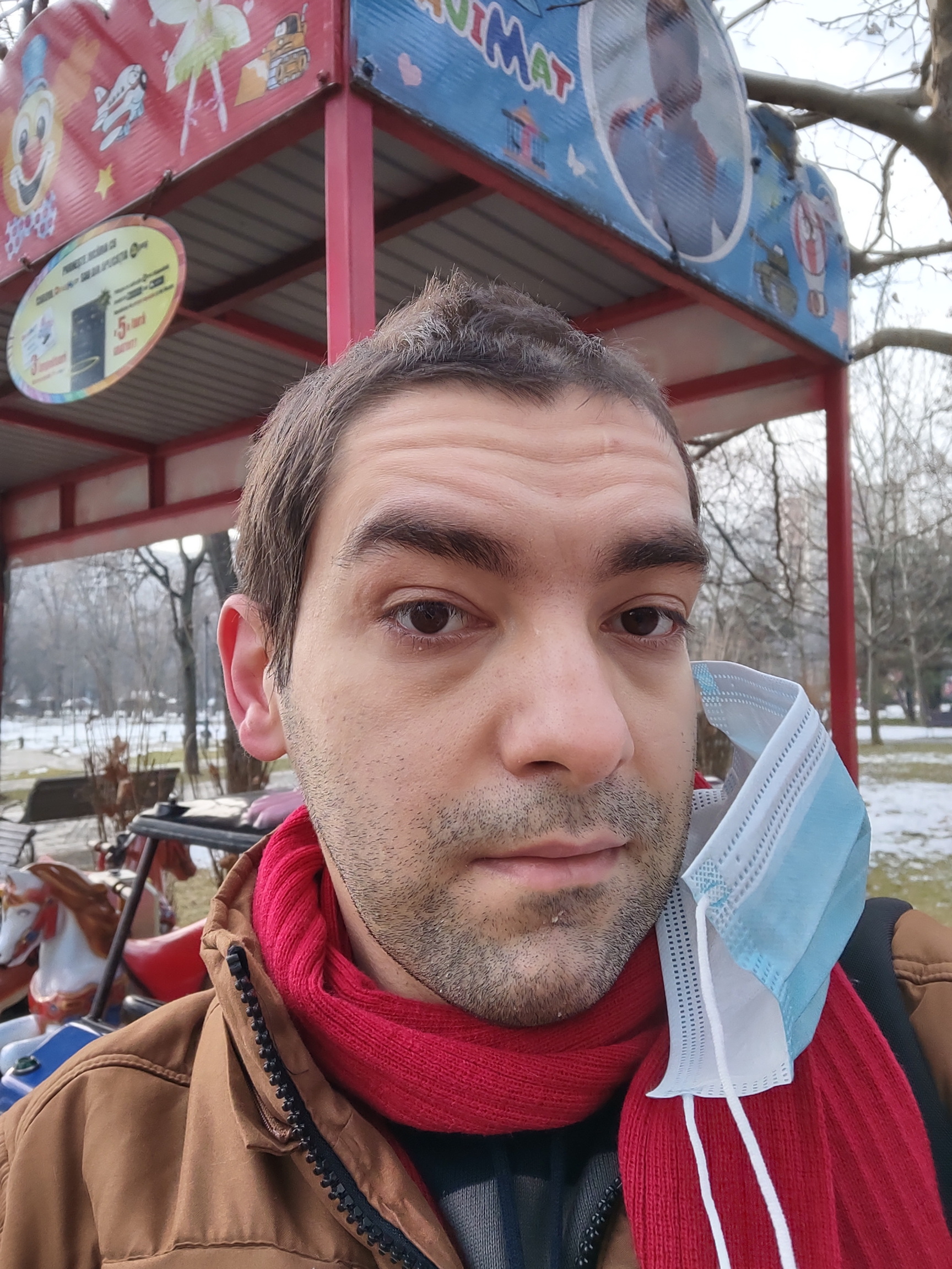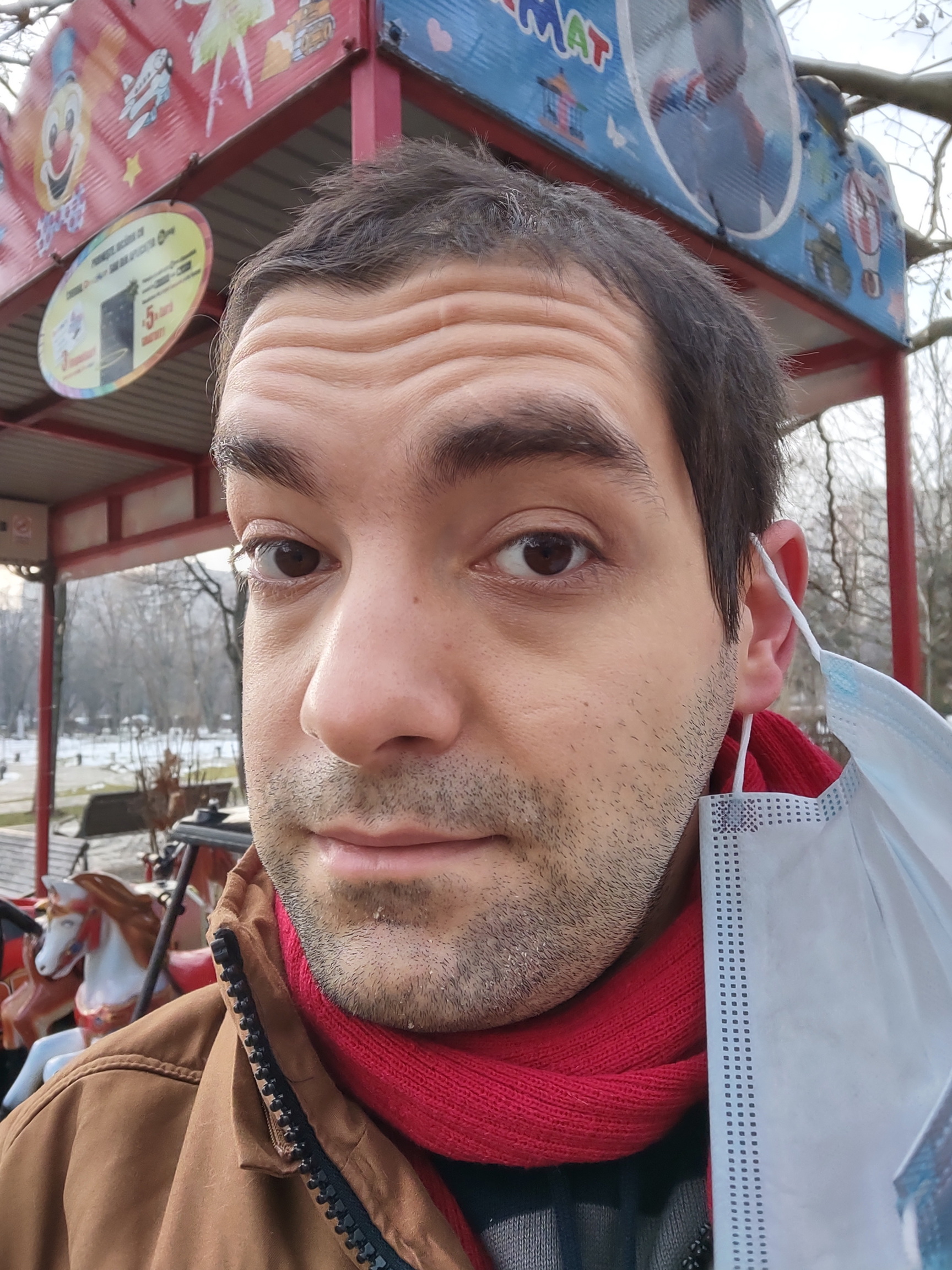 La selfie continui să fiu fascinat de detalii, la nivel de pori, păr facial şi îmi place şi fundalul estompat natural, dar cu detalii vizibile. Îmi place cum arată textura părului, ochii sunt expresivi, hainele sunt clar redate. Fata este şi ea expresiva, iar Bokeh a separat corect chipul de fundal, cu tot cu urechi roşii îngheţate de frig şi cu masca. Prima rundă de selfie a fost la 16 MP, iar a doua la 4 MP. În a doua lipsesc detaliile, avem o piele de bebeluş, prea întinsă, ce scade expresivitatea. Bokeh continuă să arate bine totuşi şi chiar şi cu soarele intrat în nori am realizat selfie-uri demne de postat în social media, dacă ignori alură de Grumpy Cat. Mi-a tăiat puţin din lobul urechii totuşi acel Bokeh, dar apreciez textura părului facial şi a buzelor.