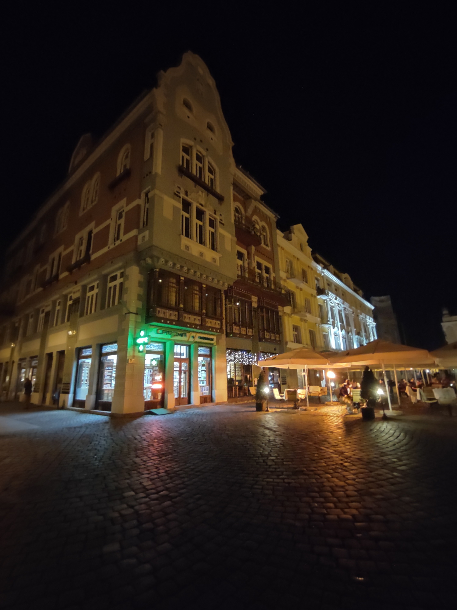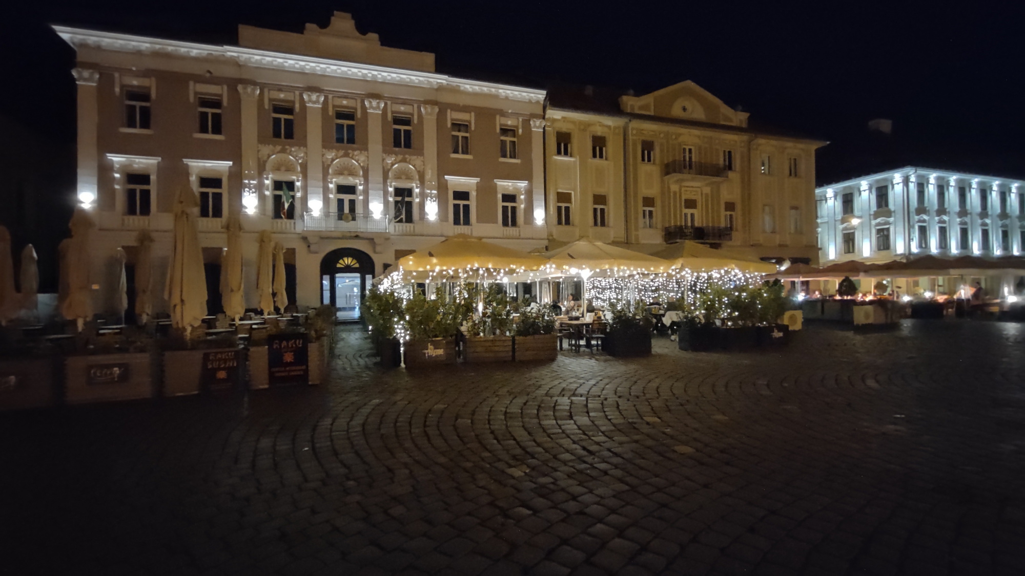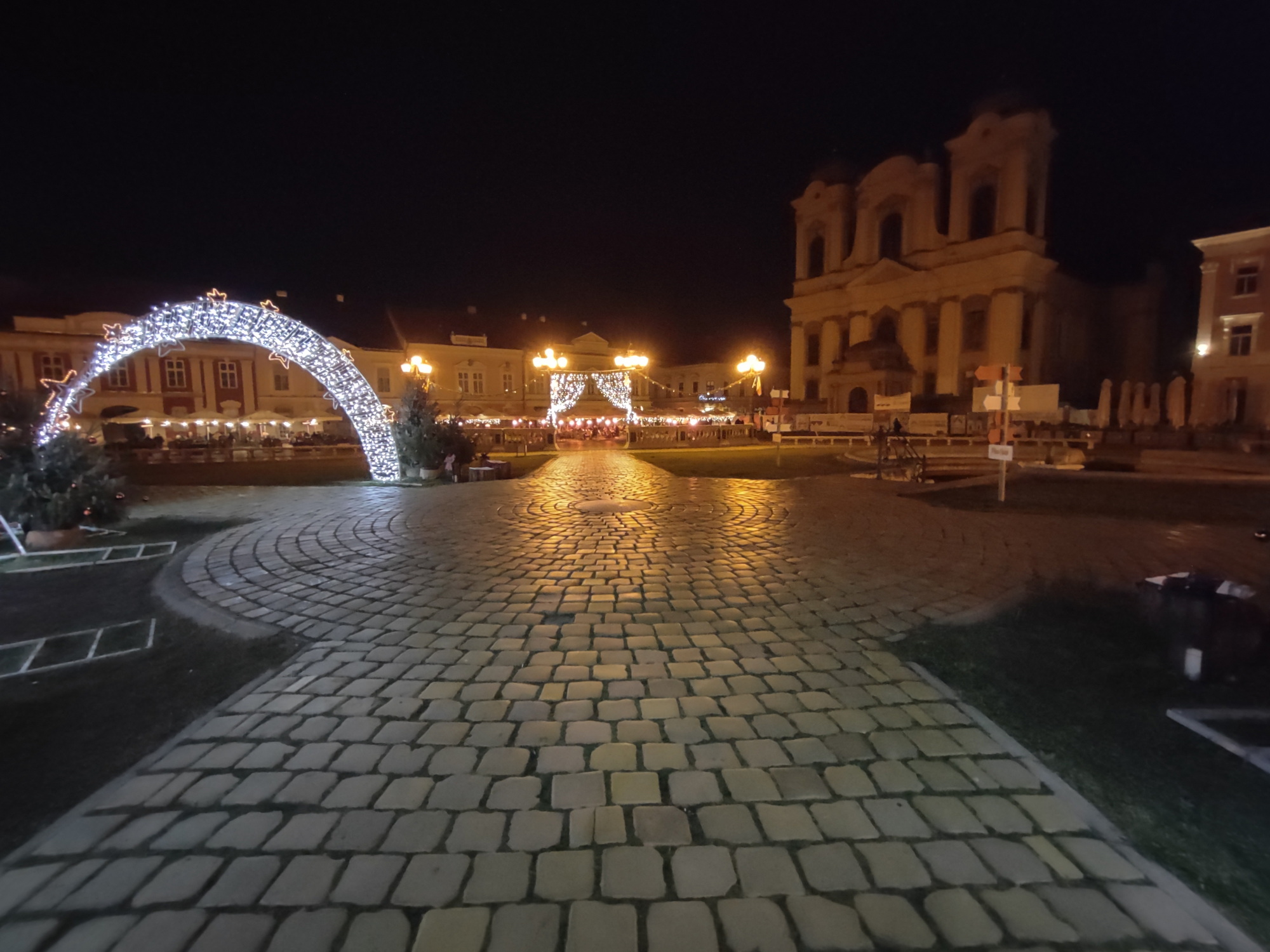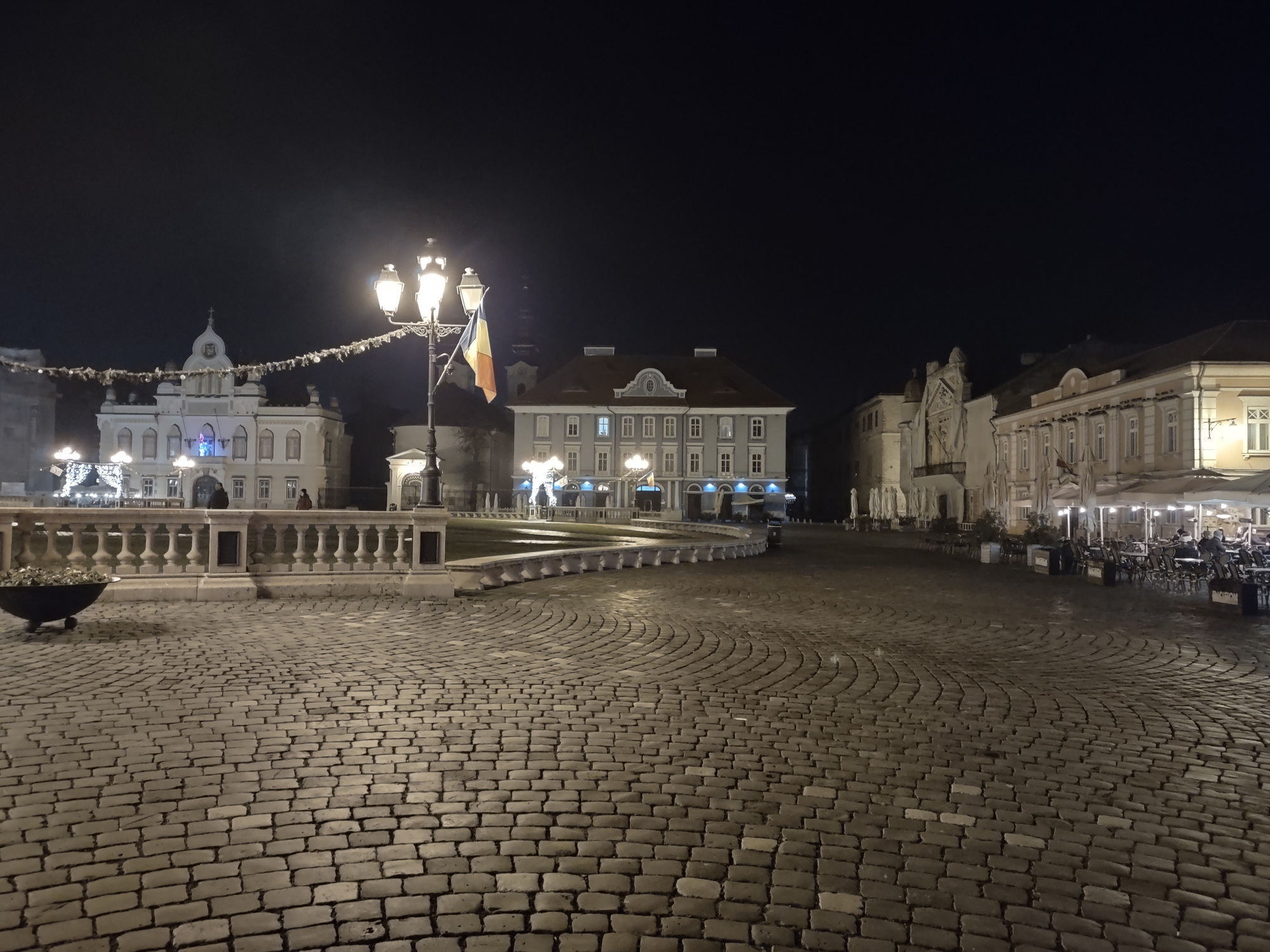 Pentru captura foto nocturnă ne mutăm la Timişoara. Aici recomand să nu faceţi prea multe poze ultrawide, pentru că ies gri, întunecate, amplifica prea mult luminile şi au zgomot. Şi camera principală tinde să amplifice luminiţele de la terasele din Timişoara. Detaliile arată OK, dar la distanţă văd zgomot şi un soi de uşoara ceaţă peste imagine. Sunt şi poze cam albaştrii, iar Night Mode injectează prea multă luminozitate în cadru, făcându-l albicios. Mai luminos nu înseamnă şi mai clar!