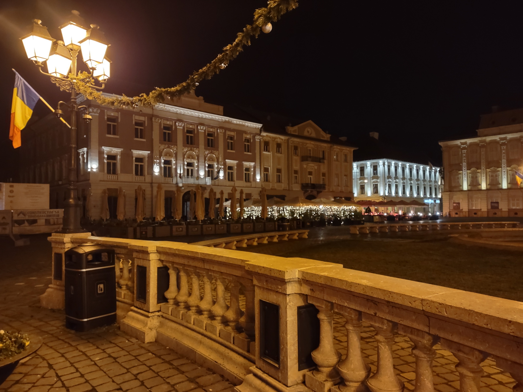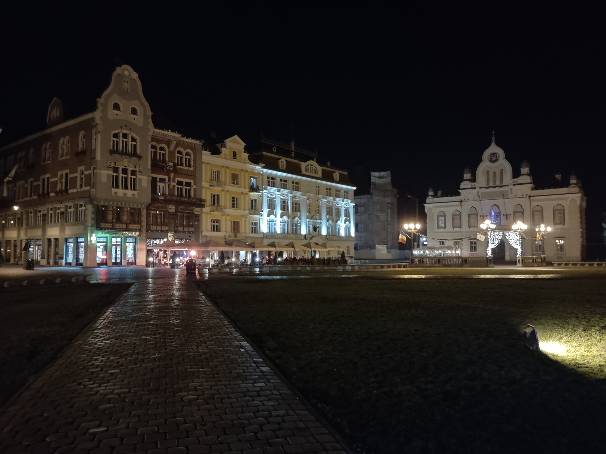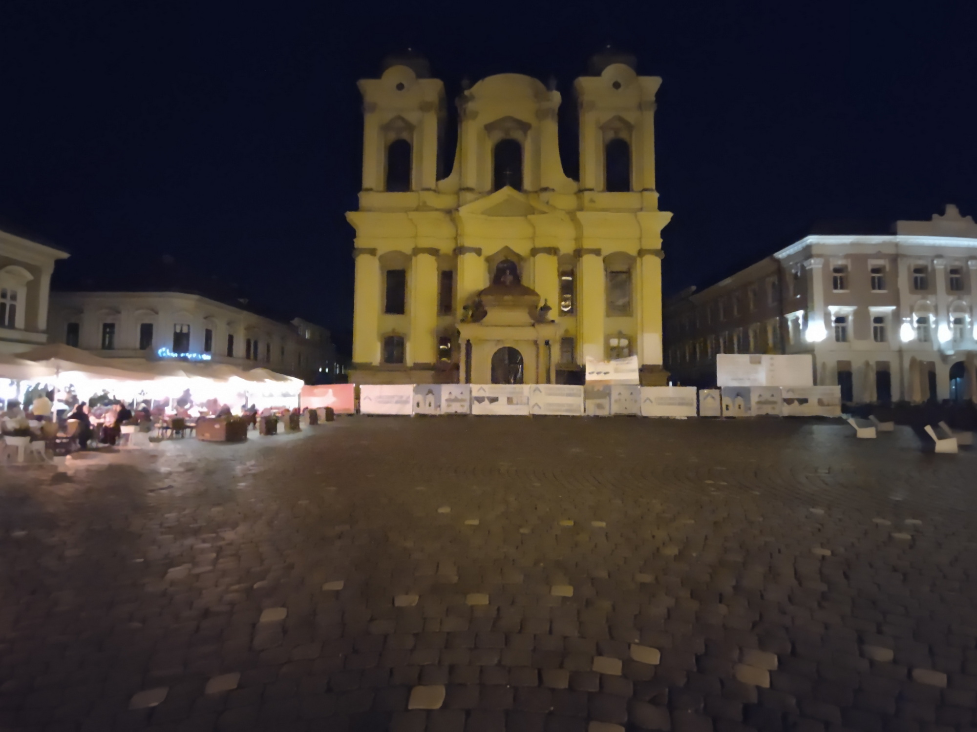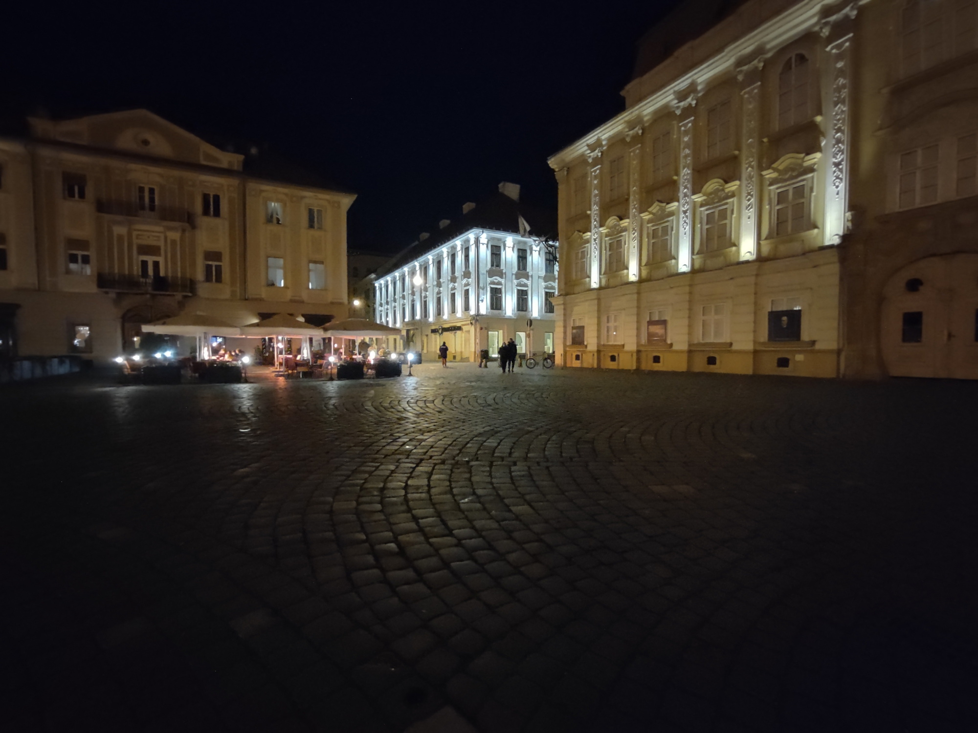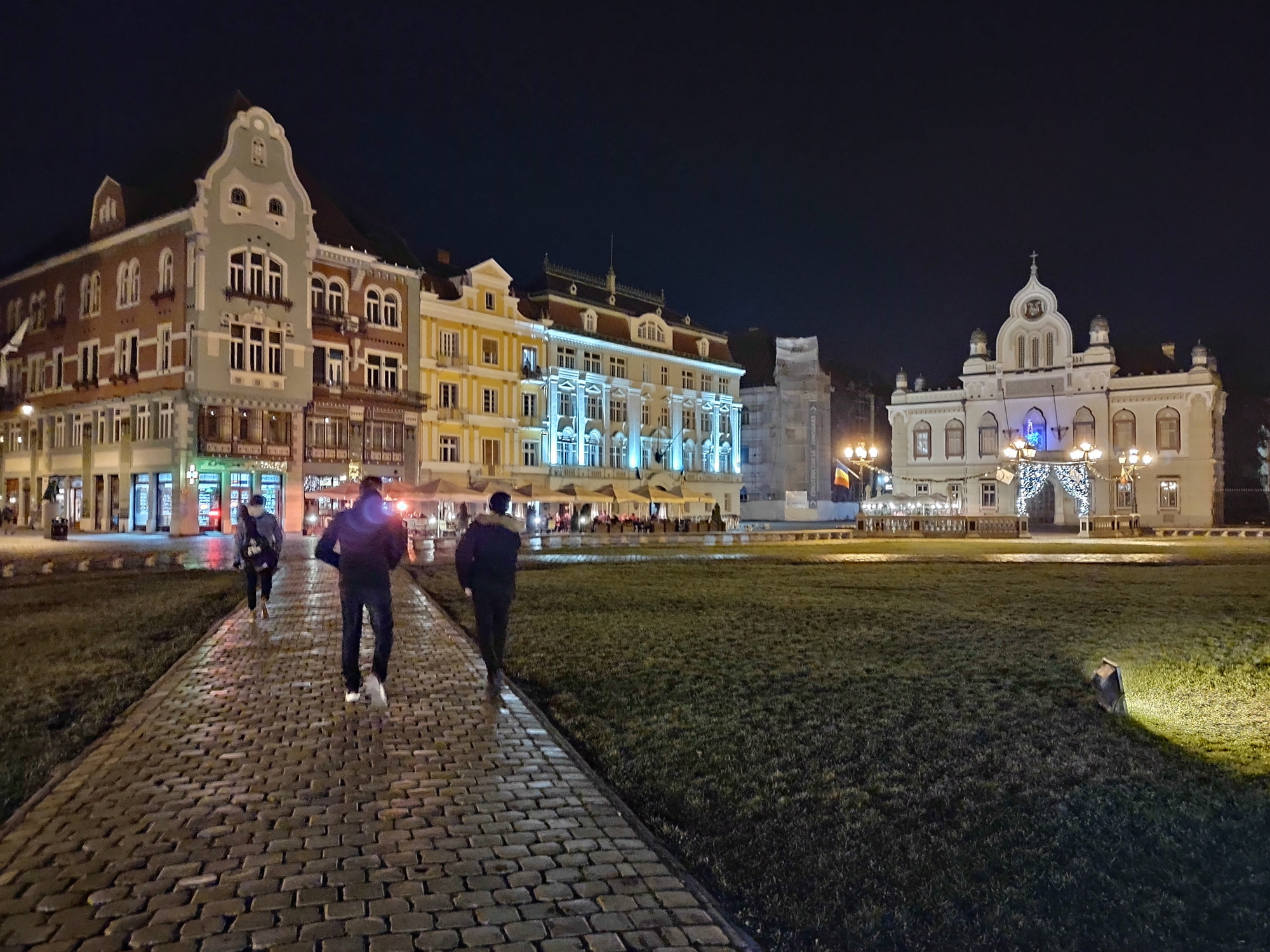 Pentru captura foto nocturnă ne mutăm la Timişoara. Aici recomand să nu faceţi prea multe poze ultrawide, pentru că ies gri, întunecate, amplifica prea mult luminile şi au zgomot. Şi camera principală tinde să amplifice luminiţele de la terasele din Timişoara. Detaliile arată OK, dar la distanţă văd zgomot şi un soi de uşoara ceaţă peste imagine. Sunt şi poze cam albaştrii, iar Night Mode injectează prea multă luminozitate în cadru, făcându-l albicios. Mai luminos nu înseamnă şi mai clar!