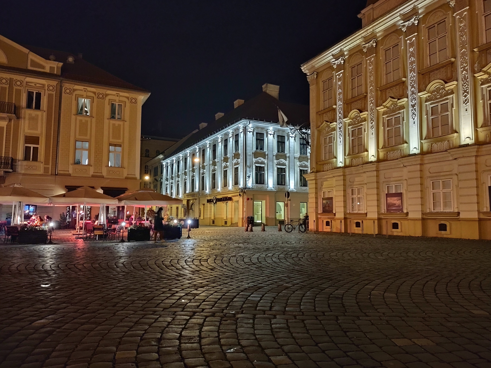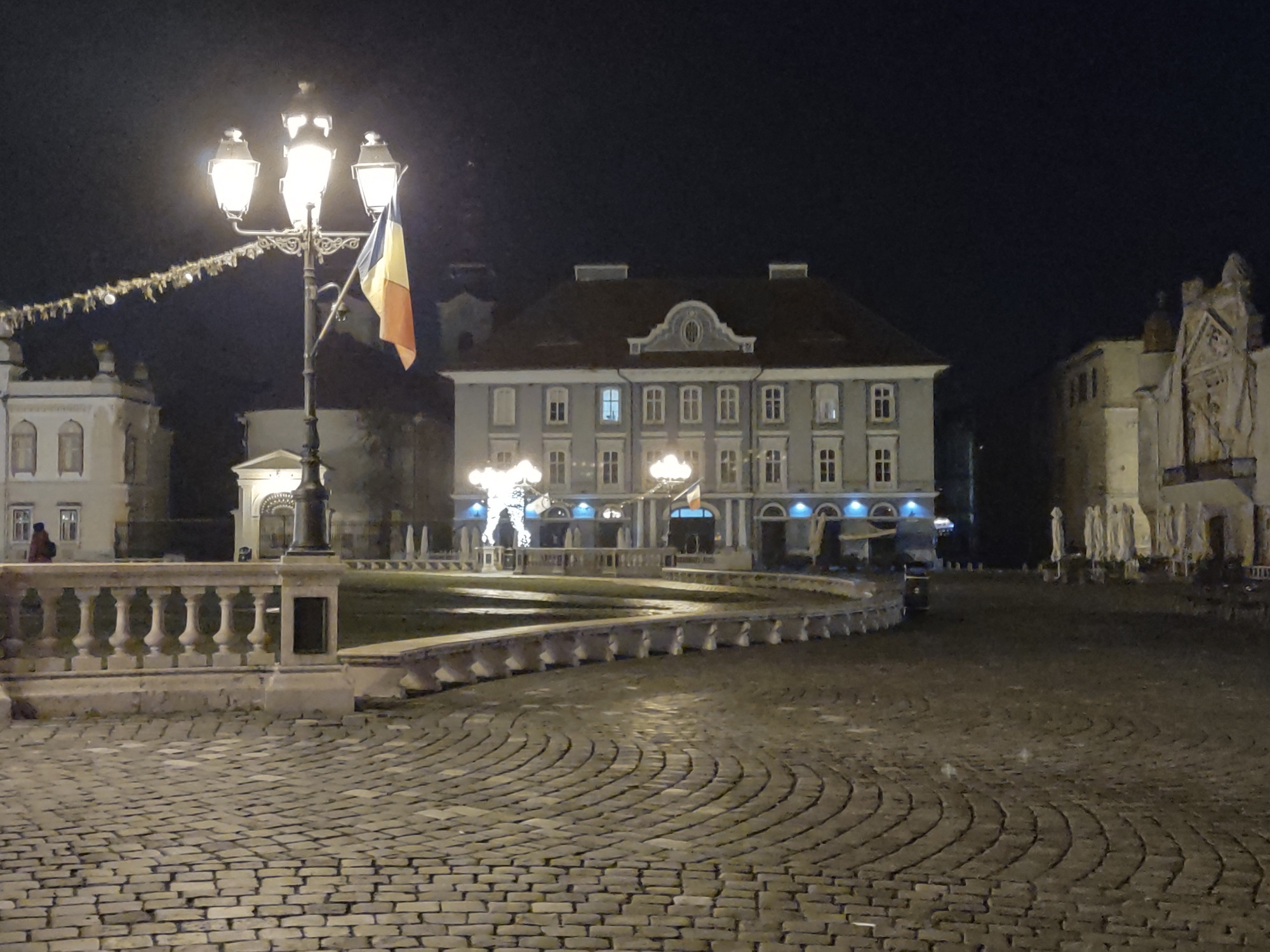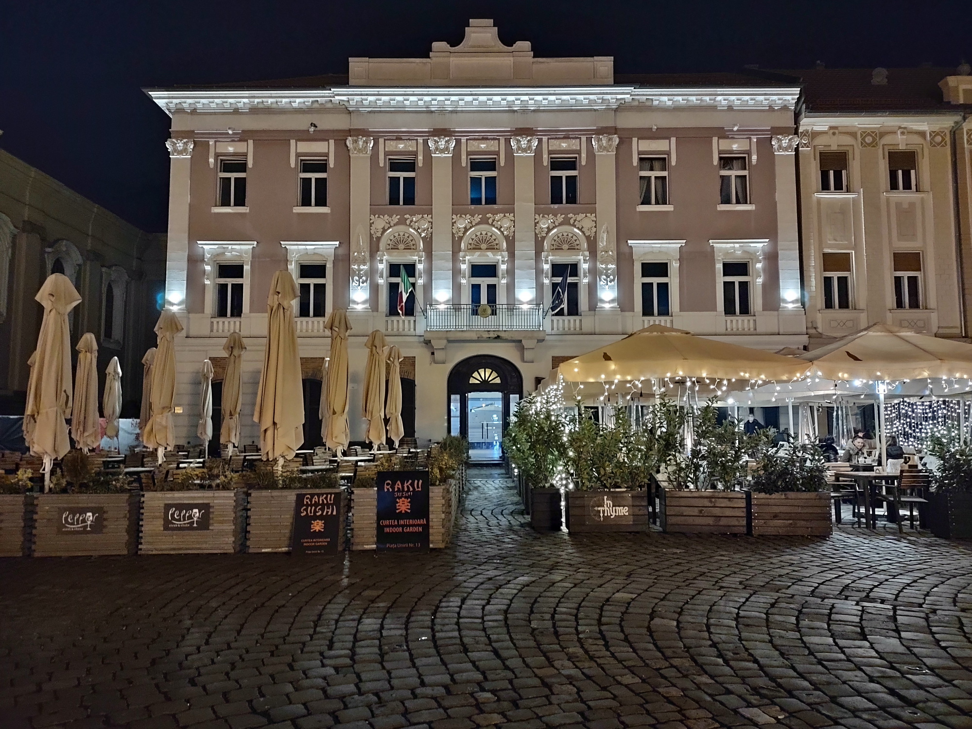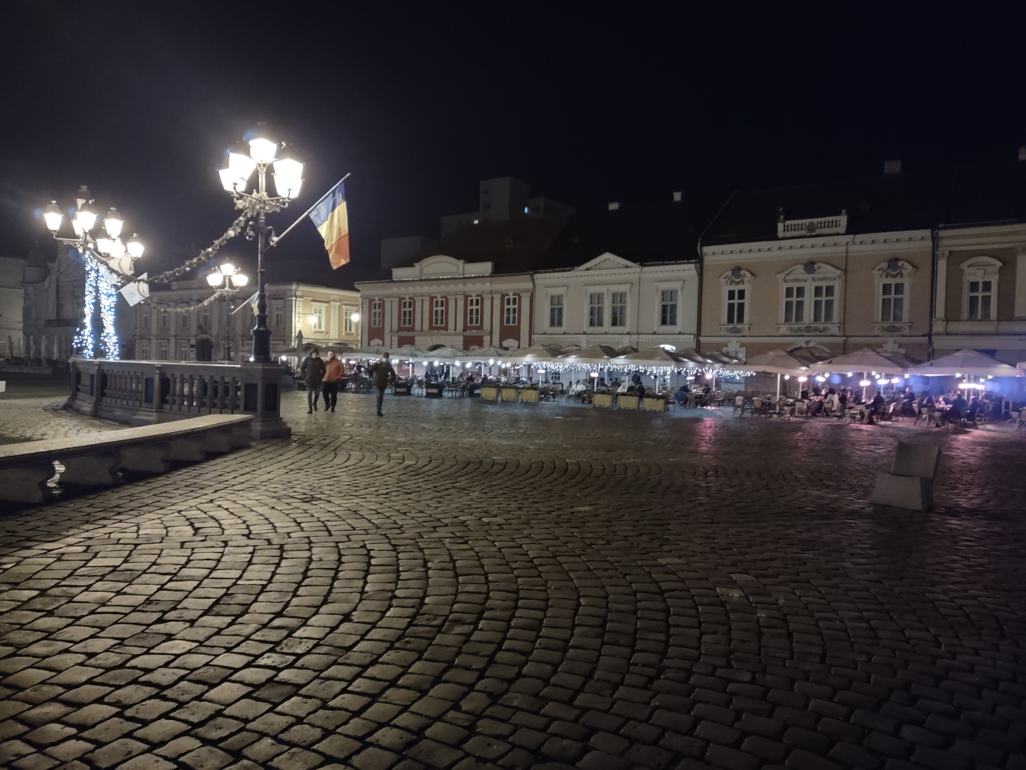 Pentru captura foto nocturnă ne mutăm la Timişoara. Aici recomand să nu faceţi prea multe poze ultrawide, pentru că ies gri, întunecate, amplifica prea mult luminile şi au zgomot. Şi camera principală tinde să amplifice luminiţele de la terasele din Timişoara. Detaliile arată OK, dar la distanţă văd zgomot şi un soi de uşoara ceaţă peste imagine. Sunt şi poze cam albaştrii, iar Night Mode injectează prea multă luminozitate în cadru, făcându-l albicios. Mai luminos nu înseamnă şi mai clar!