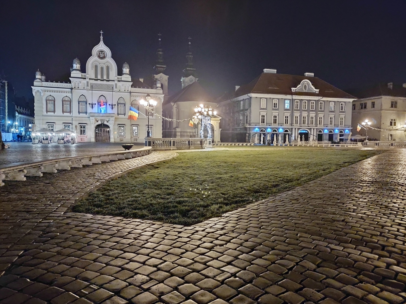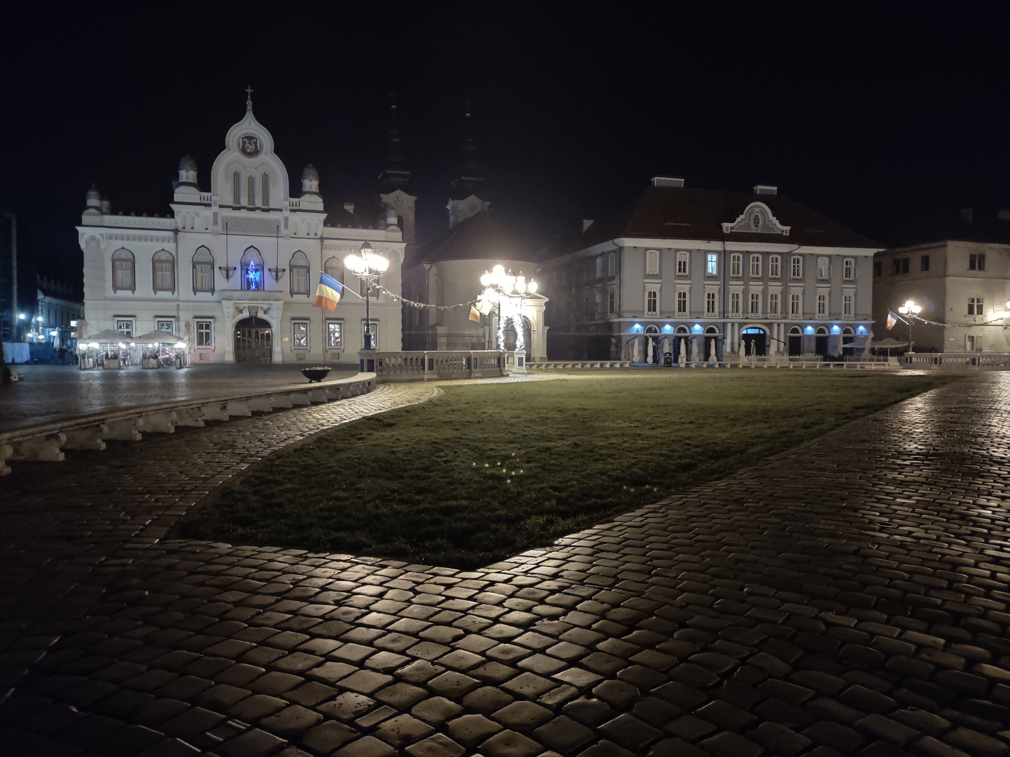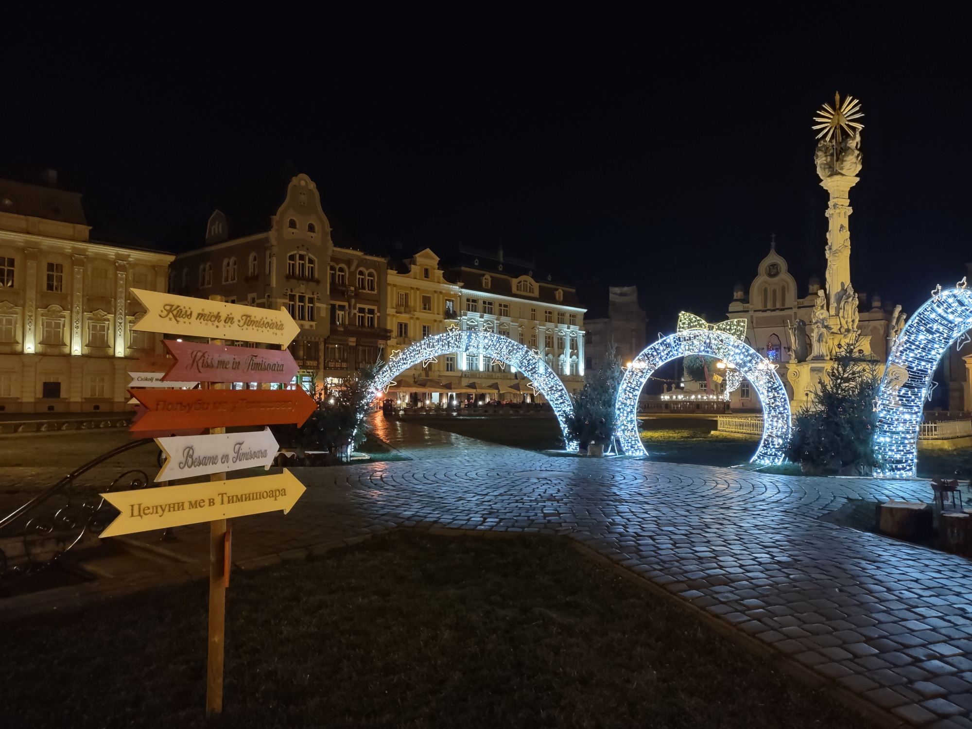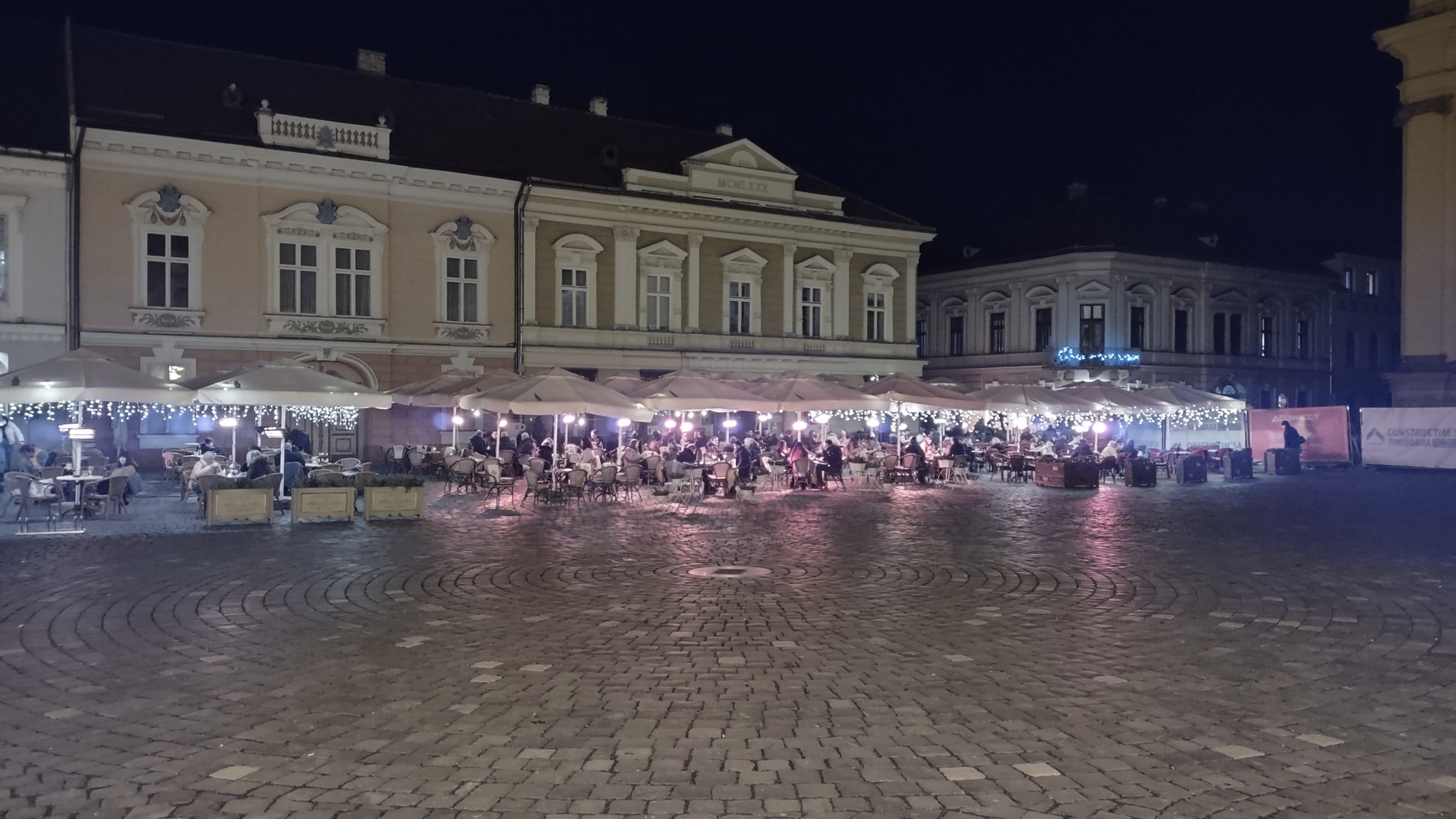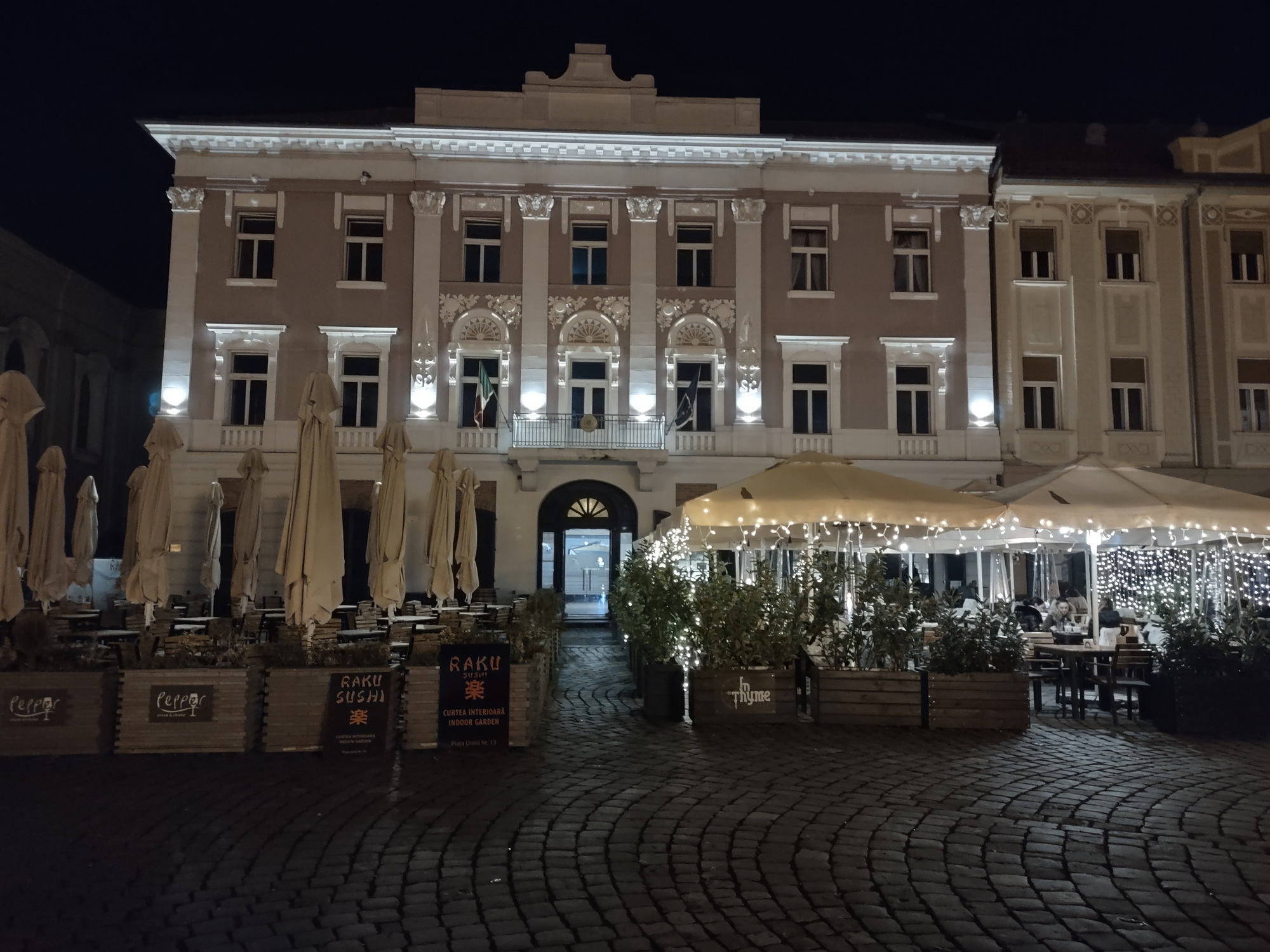 Pentru captura foto nocturnă ne mutăm la Timişoara. Aici recomand să nu faceţi prea multe poze ultrawide, pentru că ies gri, întunecate, amplifica prea mult luminile şi au zgomot. Şi camera principală tinde să amplifice luminiţele de la terasele din Timişoara. Detaliile arată OK, dar la distanţă văd zgomot şi un soi de uşoara ceaţă peste imagine. Sunt şi poze cam albaştrii, iar Night Mode injectează prea multă luminozitate în cadru, făcându-l albicios. Mai luminos nu înseamnă şi mai clar!