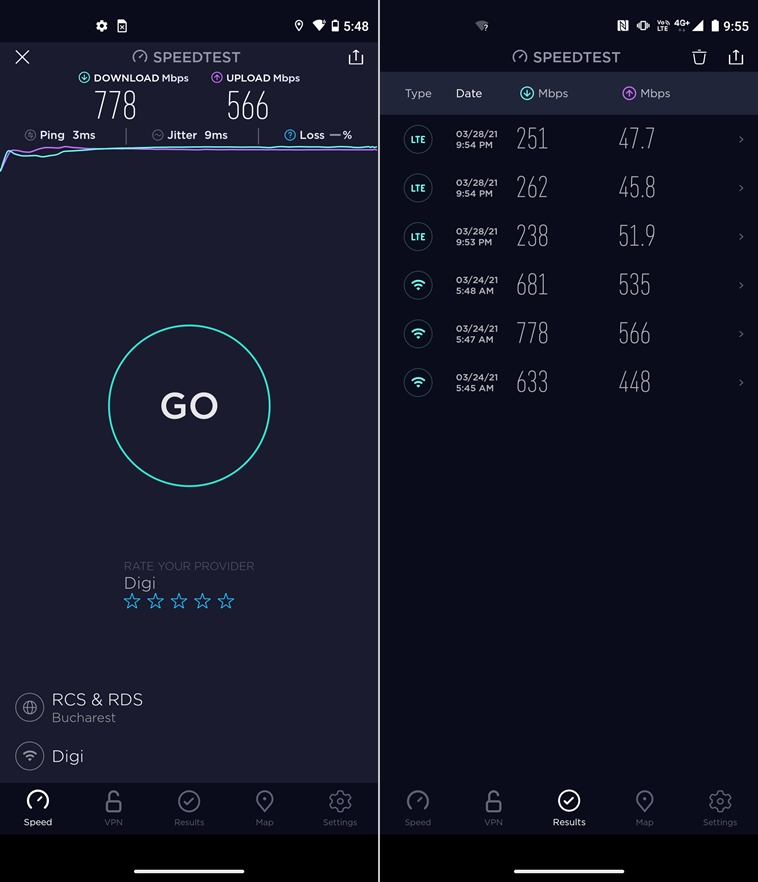 Jos găsim un port USB-C 3.1, iar telefonul oferă şi suport pentru Bluetooth 5.1, WiFi 6, NFC, GPS şi Glonass. Are 3 microfoane la dispoziţie, inclusiv unul cu Audio Zoom pentru filmare. Apelurile se aud tare şi clar, aşa cum ne aşteptăm de la compania care a inventat telefonul mobil. Nu am uitat de Ookla Speedtest, iar la testele aferente am atins 262 Mbps la download 4G în reţeaua Orange şi 51.9 Mbps la upload. Scoruri respectabile aş spune, venind după câteva telefoane sub 100 Mbps la download.