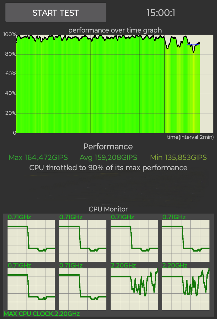 O veste bună e că telefonul nu suferă de Throttling, după 15 minute de rulare pierzând doar 10% din performanță. Temperaturile s-au situat în limite normale, cu 33.2 °C la benchmark-uri și un maxim de 37.4 °C în cazul gaming-ului.