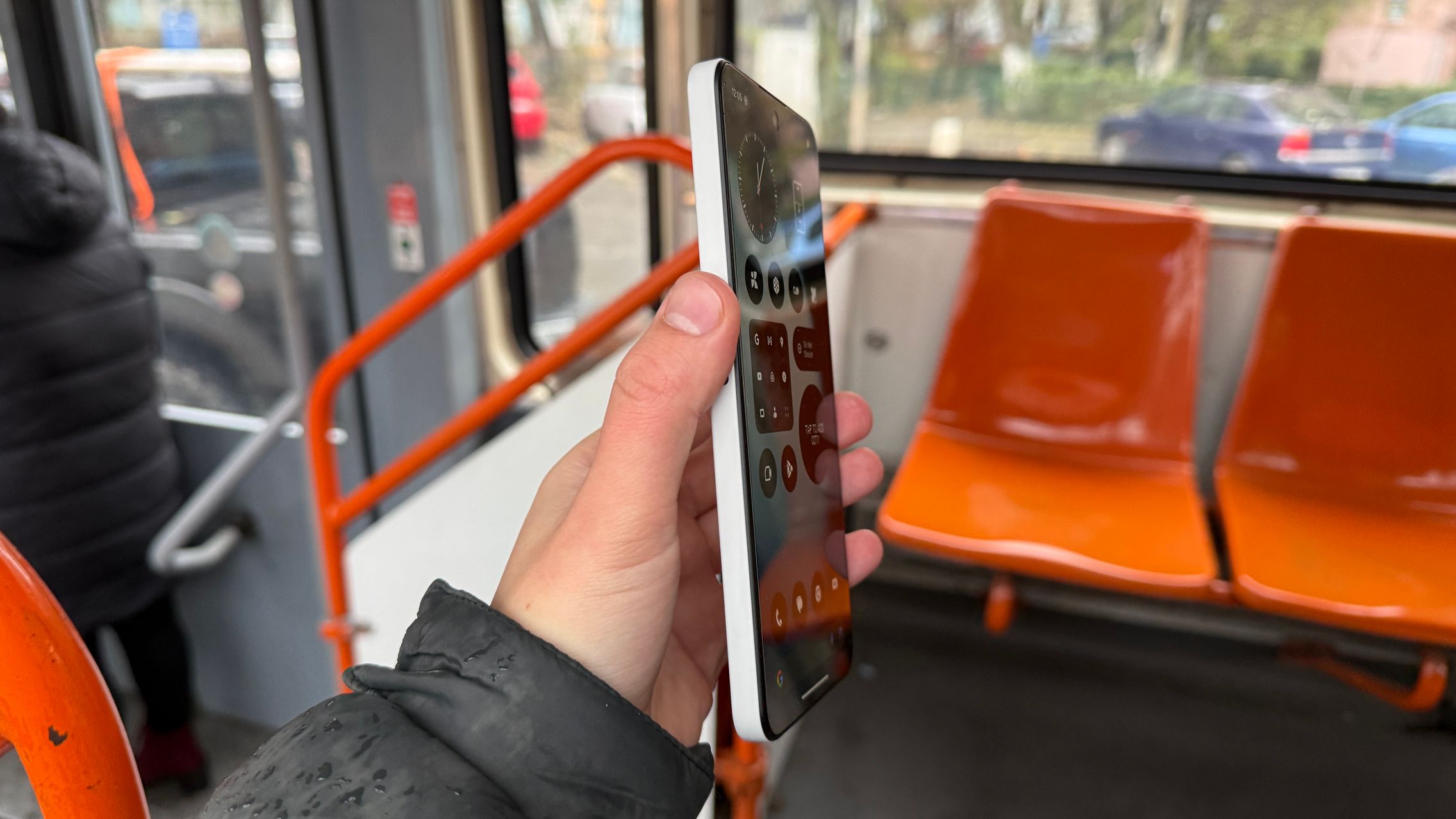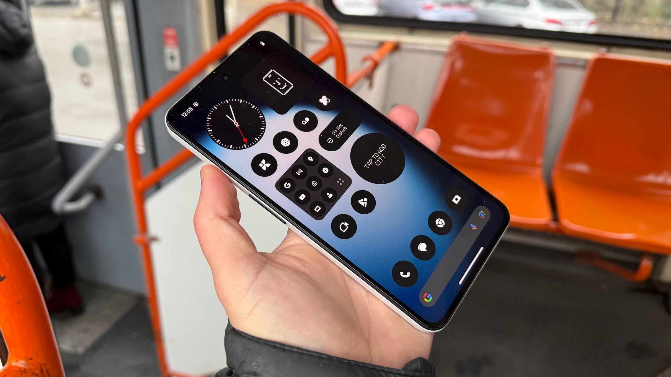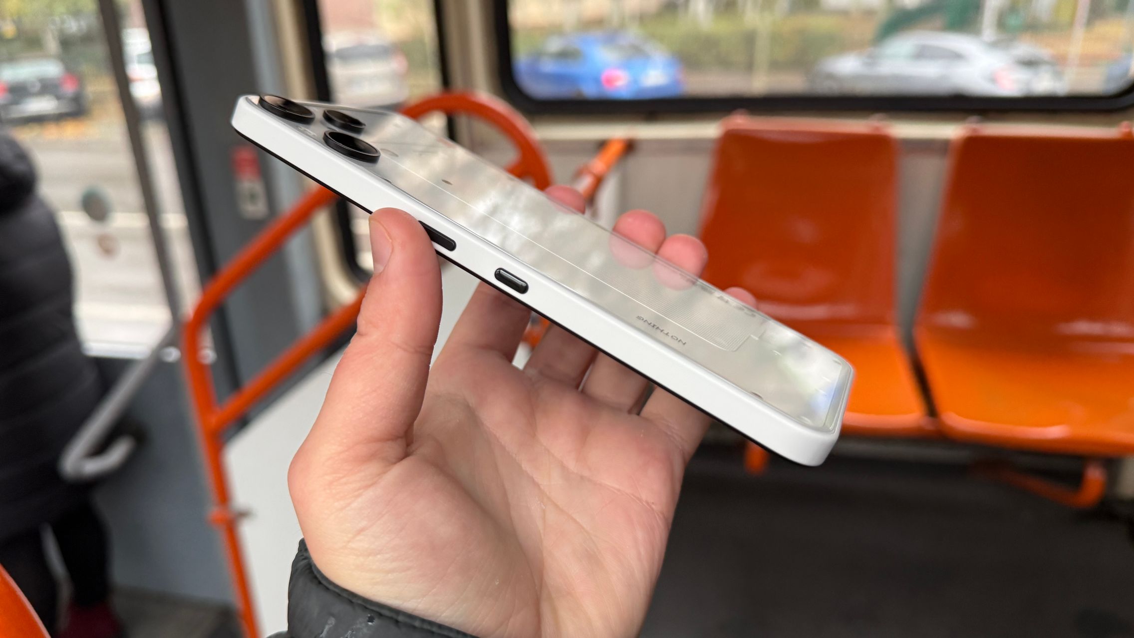 Are spate transaprent sub care se văd doar părți care acoperă componentele și jos de tot în colțul din dreapta apare micul beculeț LED Glyph, doar atât! E un telefon mare, dar care se simte mai ușor decât este, greutatea de 199 grame fiind bine echilibrată. Îmi amintește de fostele "phablet-uri" prin dimensiunile sale și ca dimensiuni, acesta are 8.3 mm grosime și 199 grame.