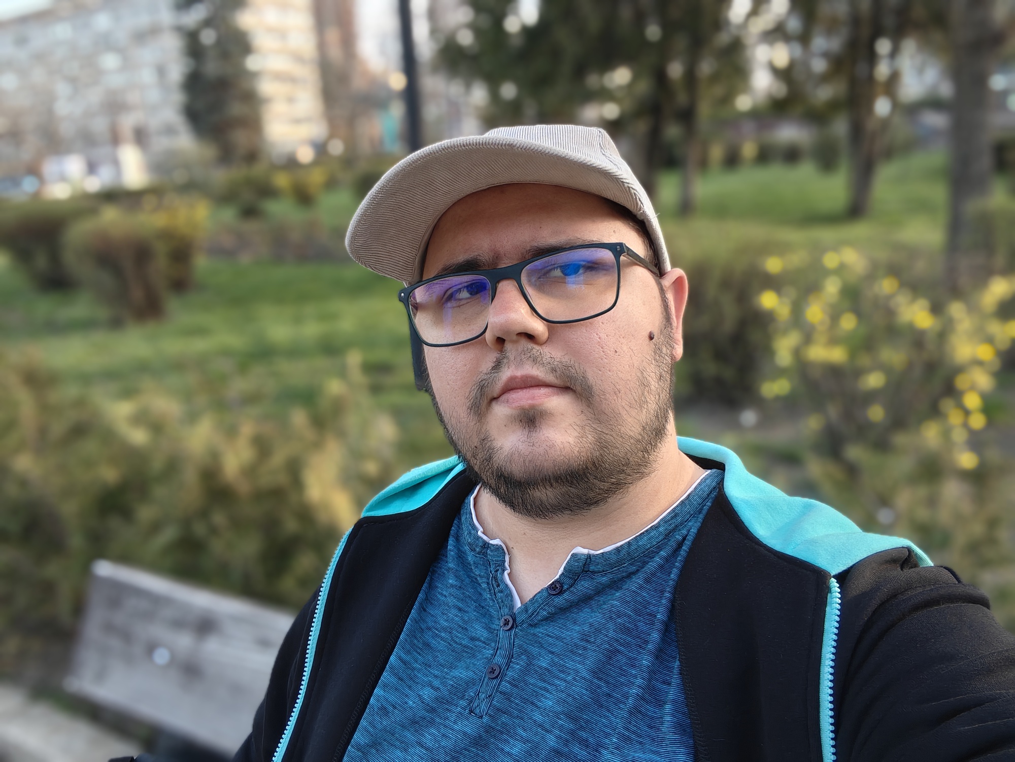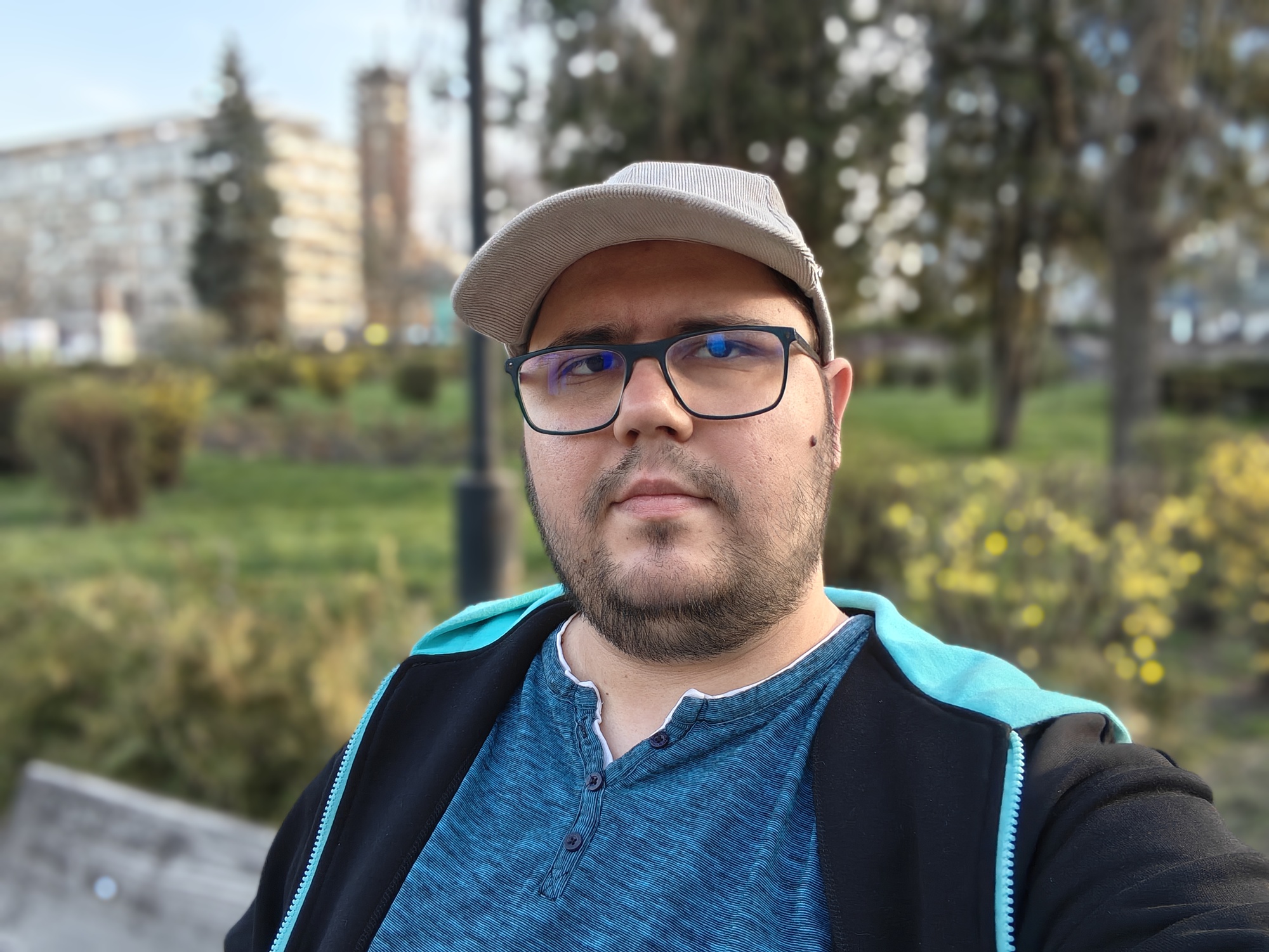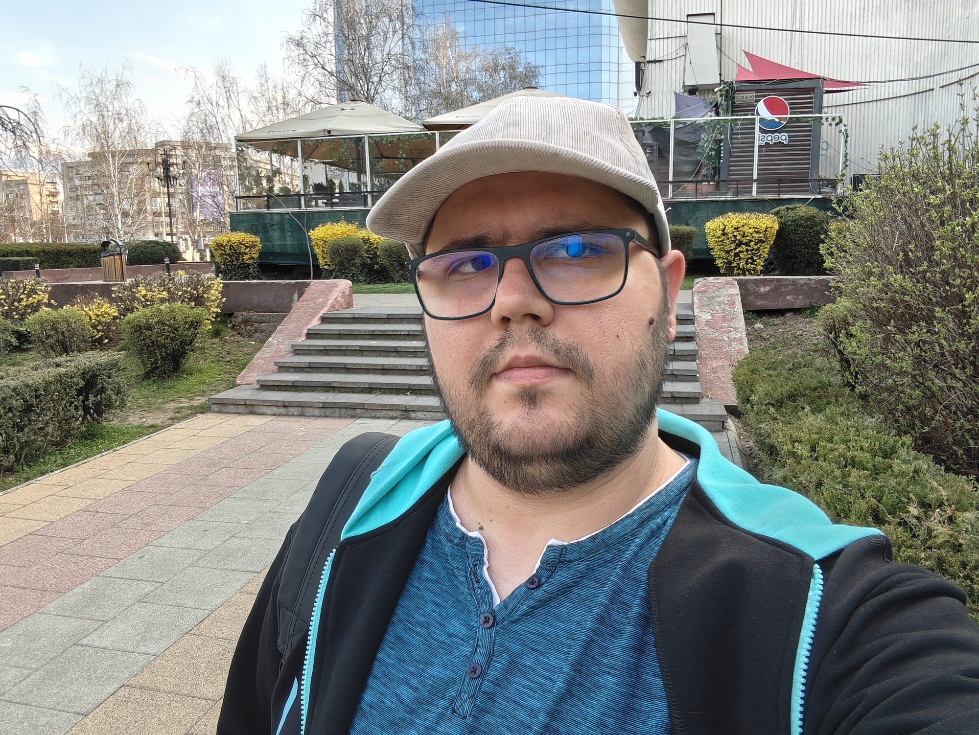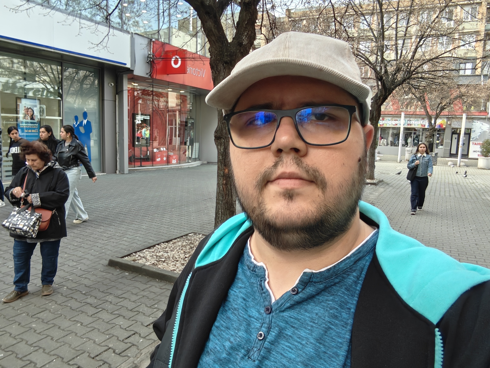 Începem cu captura selfie. Am realizat doar mostre folosind senzorul dedicat din față, deși având Glyph Matrix în partea din spate, putem face selfie-uri și cu camera principală, orientându-ne cu ajutorul „display-ului secundar”. Chiar dacă pe hârtie bifăm downgrade față de predecesor, camera frontală reușește să scoată imagini plăcute vizual, corect redate, cu suficiente detalii și texturi dacă privesc spre haine, pori, proaspăta mea barbă.