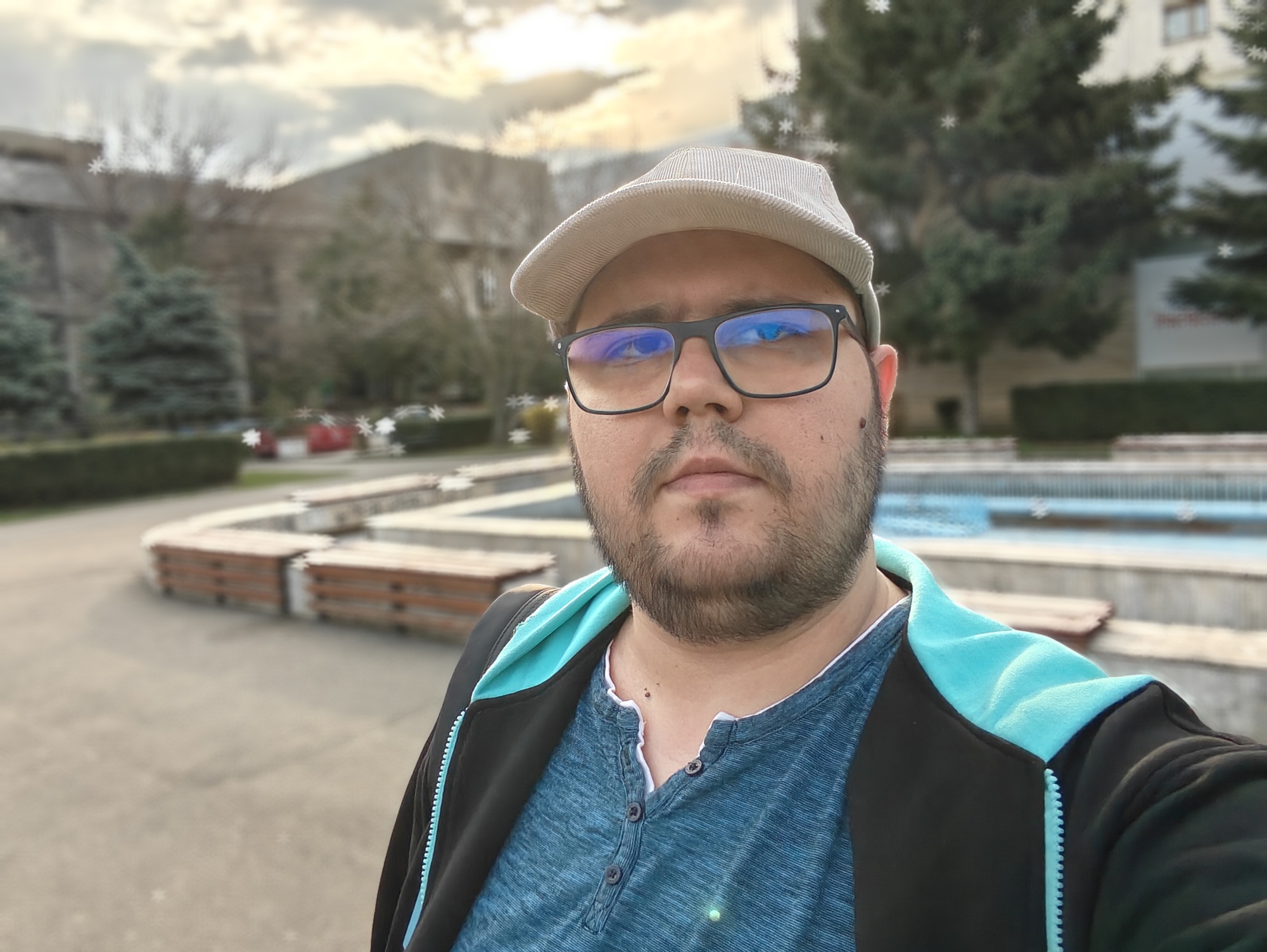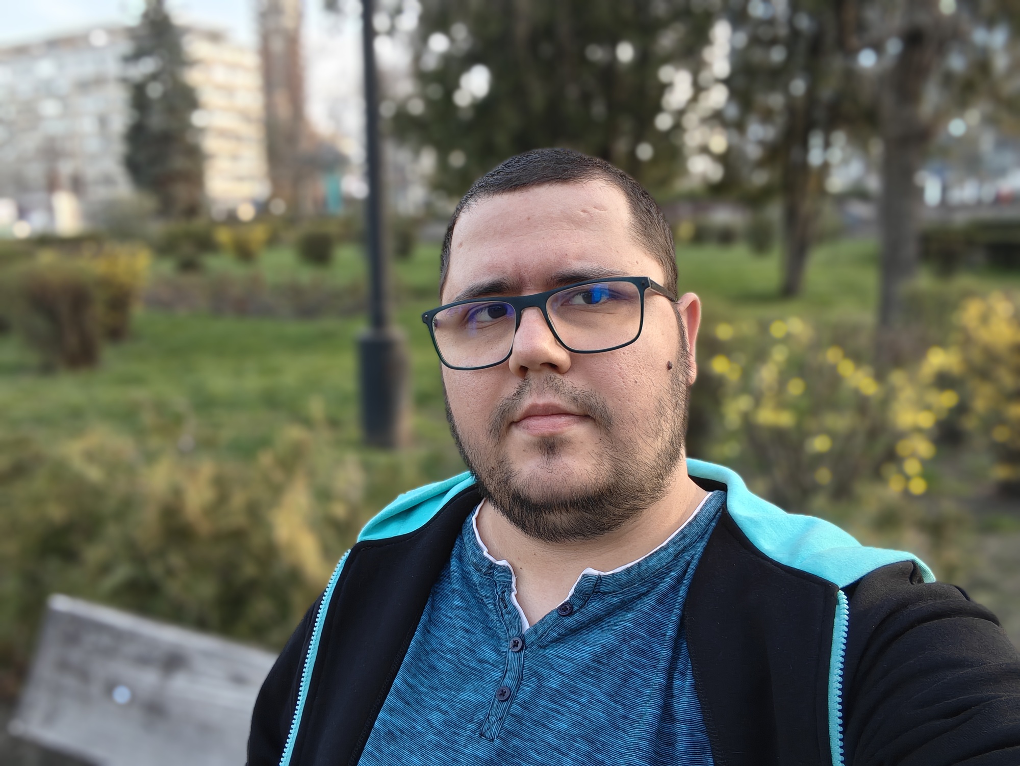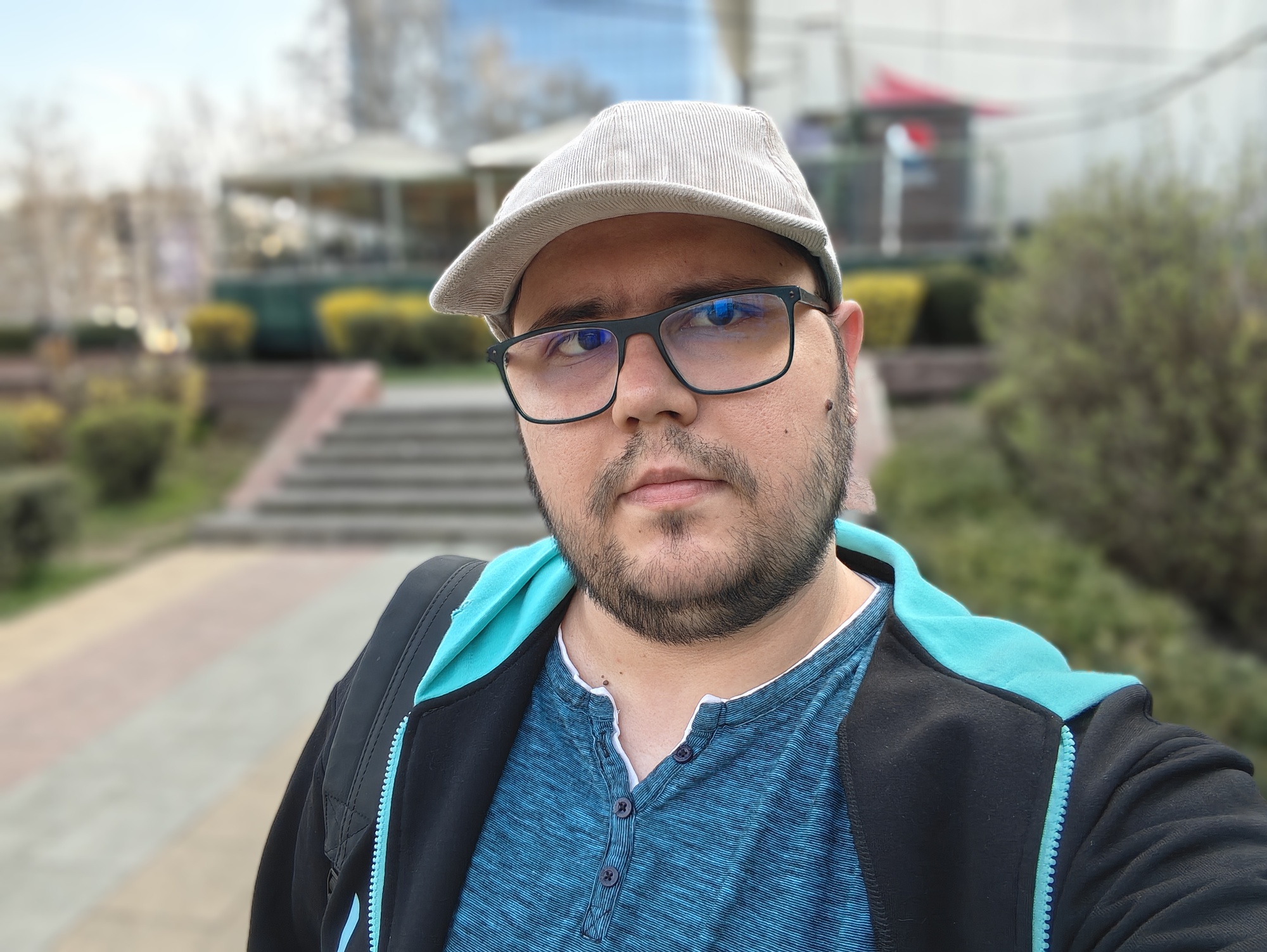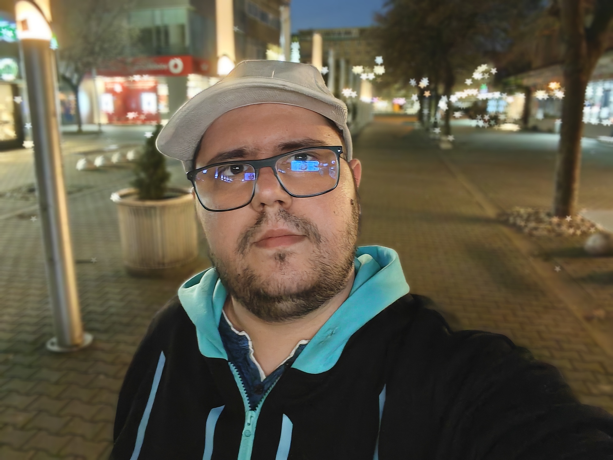 Începem cu captura selfie. Am realizat doar mostre folosind senzorul dedicat din față, deși având Glyph Matrix în partea din spate, putem face selfie-uri și cu camera principală, orientându-ne cu ajutorul „display-ului secundar”. Chiar dacă pe hârtie bifăm downgrade față de predecesor, camera frontală reușește să scoată imagini plăcute vizual, corect redate, cu suficiente detalii și texturi dacă privesc spre haine, pori, proaspăta mea barbă.