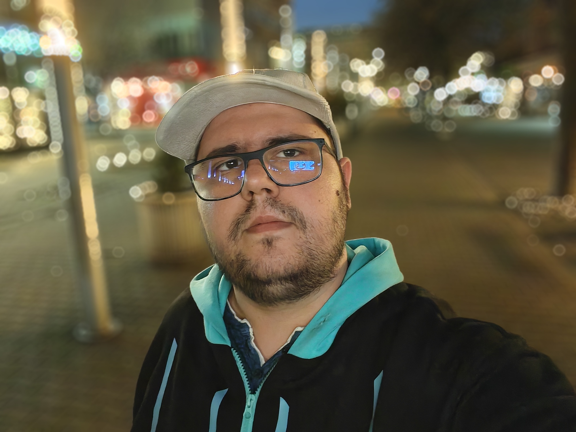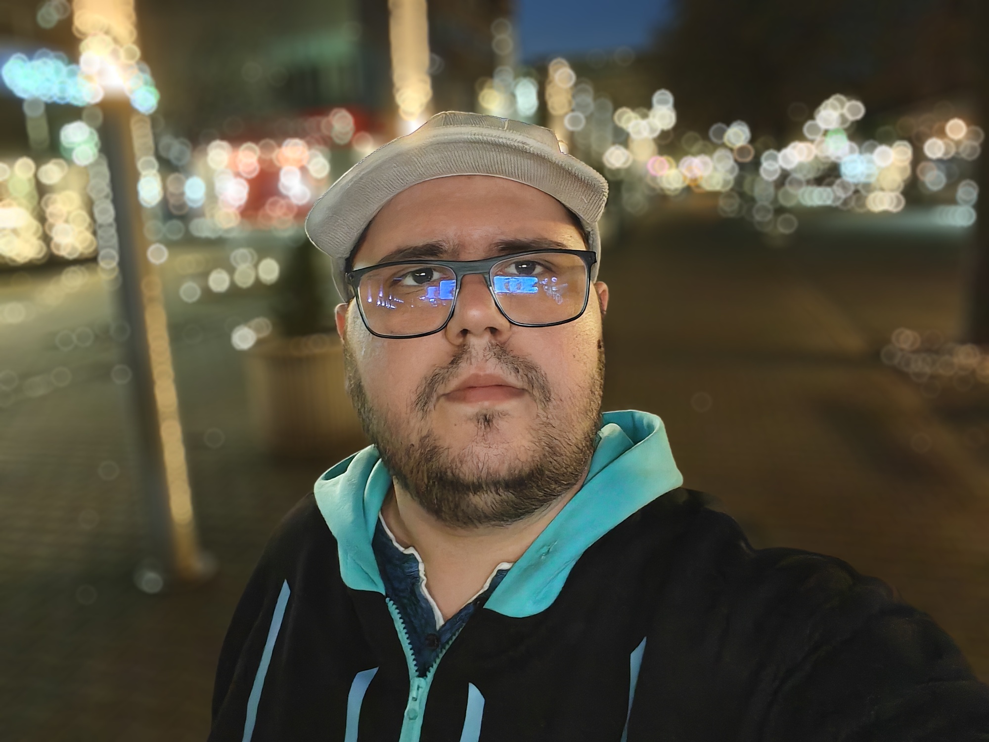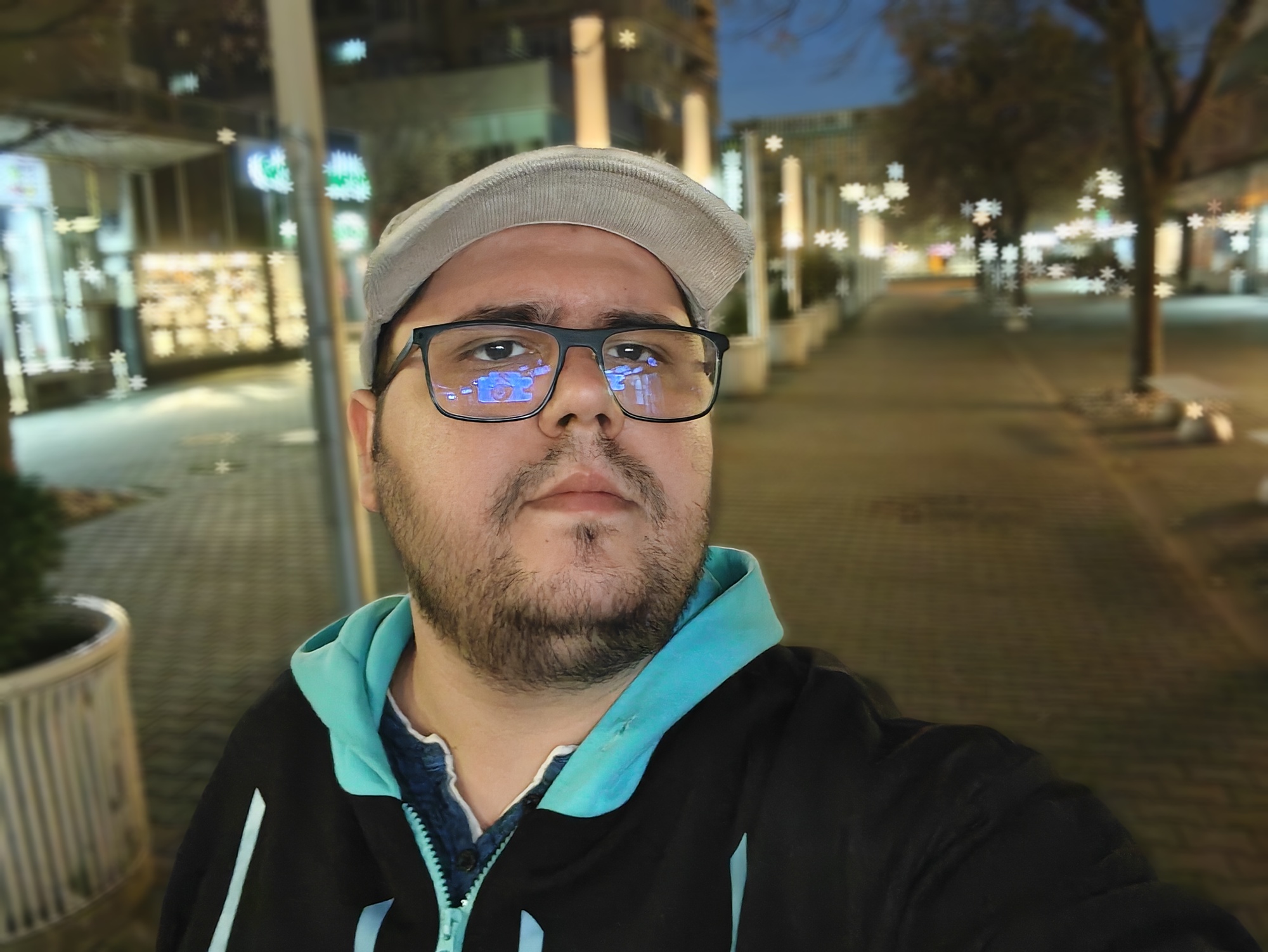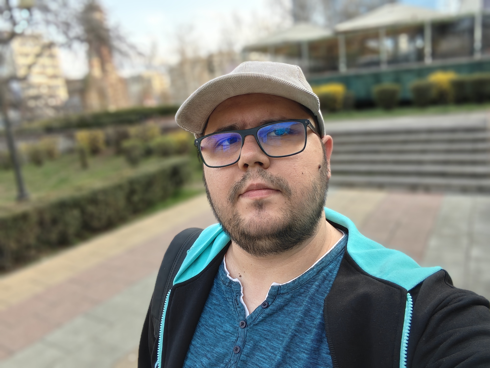 Începem cu captura selfie. Am realizat doar mostre folosind senzorul dedicat din față, deși având Glyph Matrix în partea din spate, putem face selfie-uri și cu camera principală, orientându-ne cu ajutorul „display-ului secundar”. Chiar dacă pe hârtie bifăm downgrade față de predecesor, camera frontală reușește să scoată imagini plăcute vizual, corect redate, cu suficiente detalii și texturi dacă privesc spre haine, pori, proaspăta mea barbă.