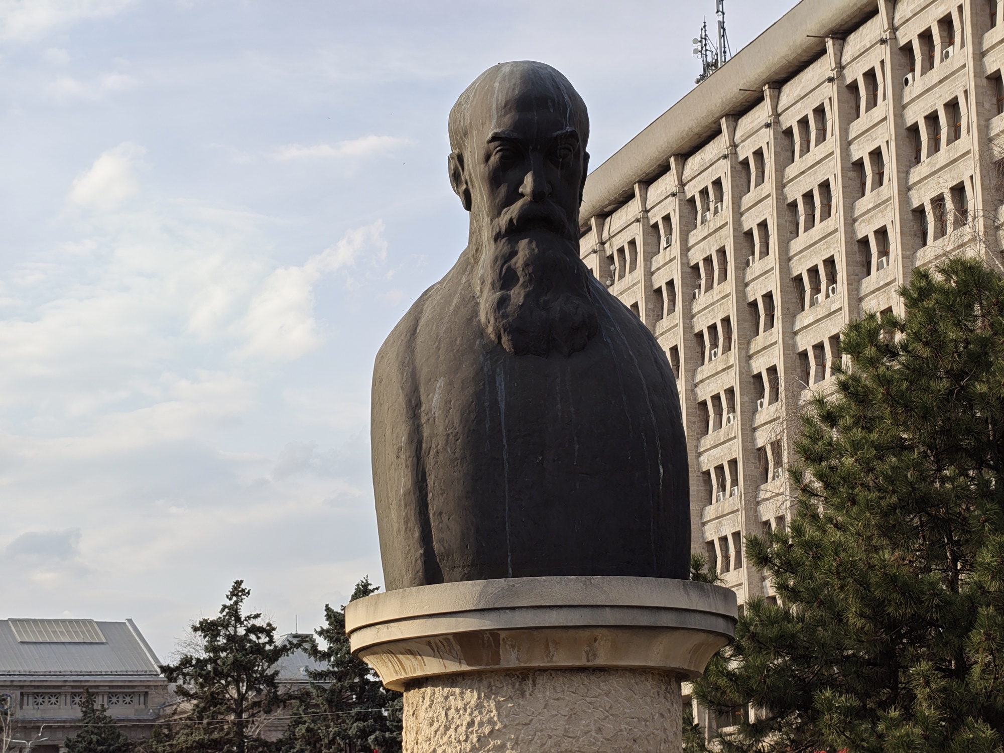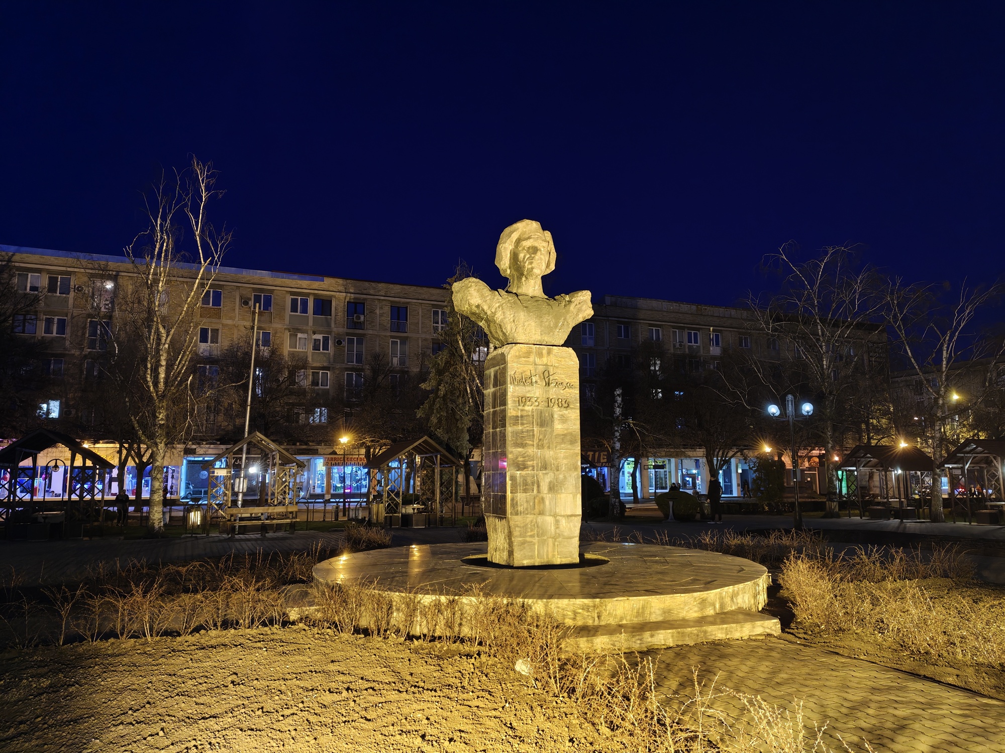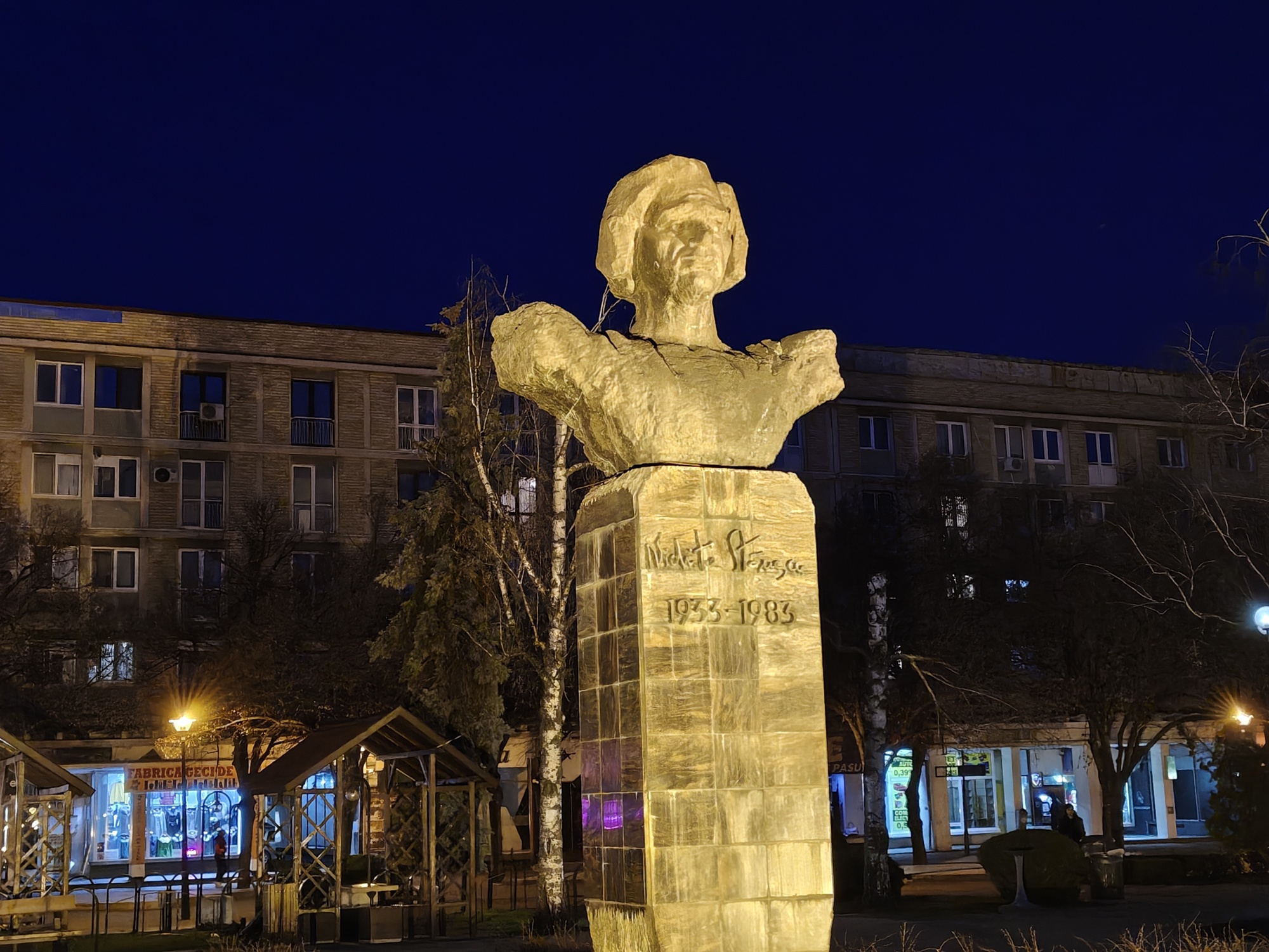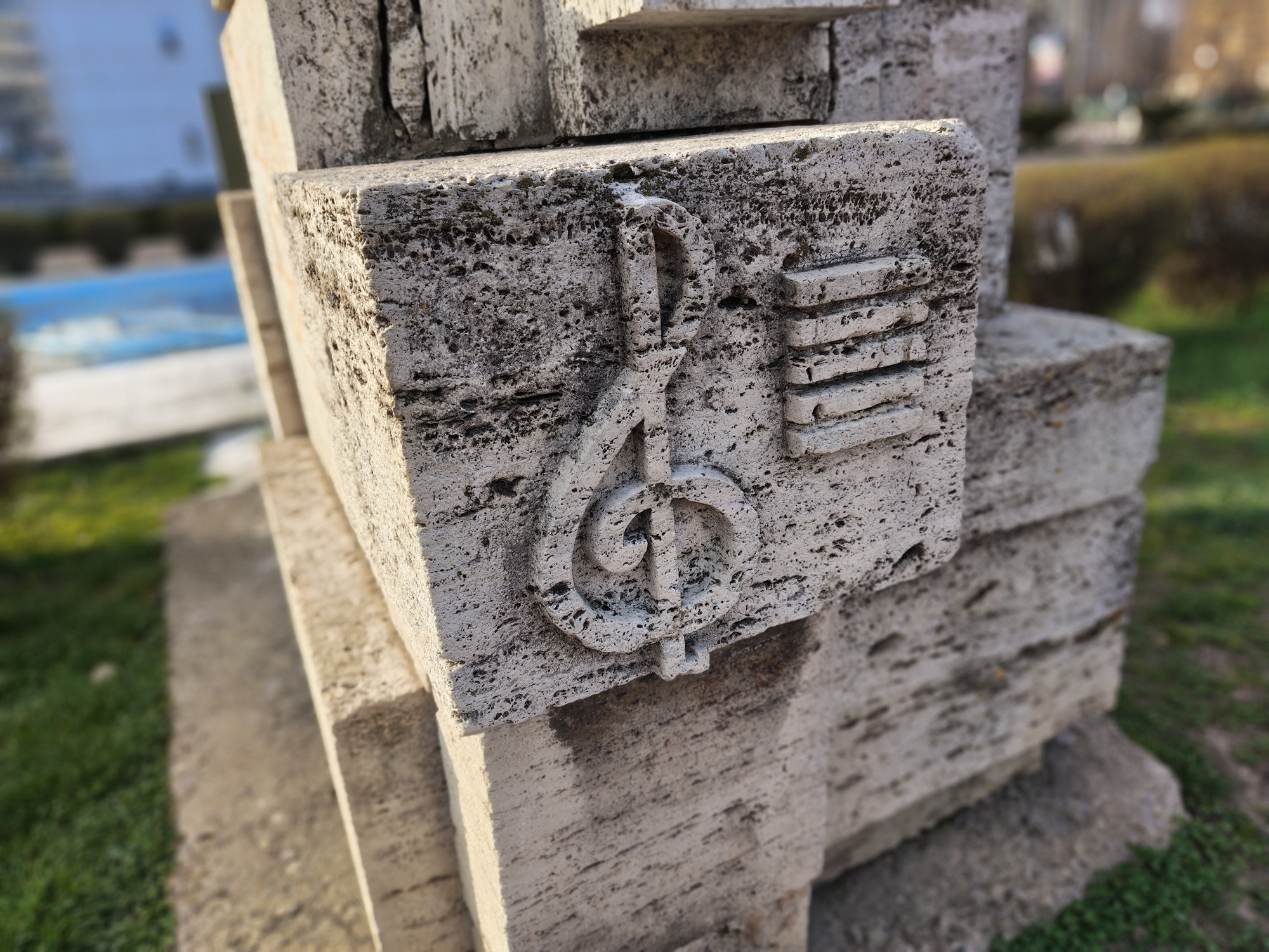 Am statui pe care am aplicat cu succes modul Portrait și am obținut un bokeh frumos în spate. Tot Portrait am folosit pentru a captura acea parte din monument ieșită puțin în relief, cu Cheia Sol gravată, probabil poza mea preferată din galerie. Am surprins și un bec mergând pe stradă, cu zoom 3X, văd până și firele fine de praf de pe sticla transparentă.