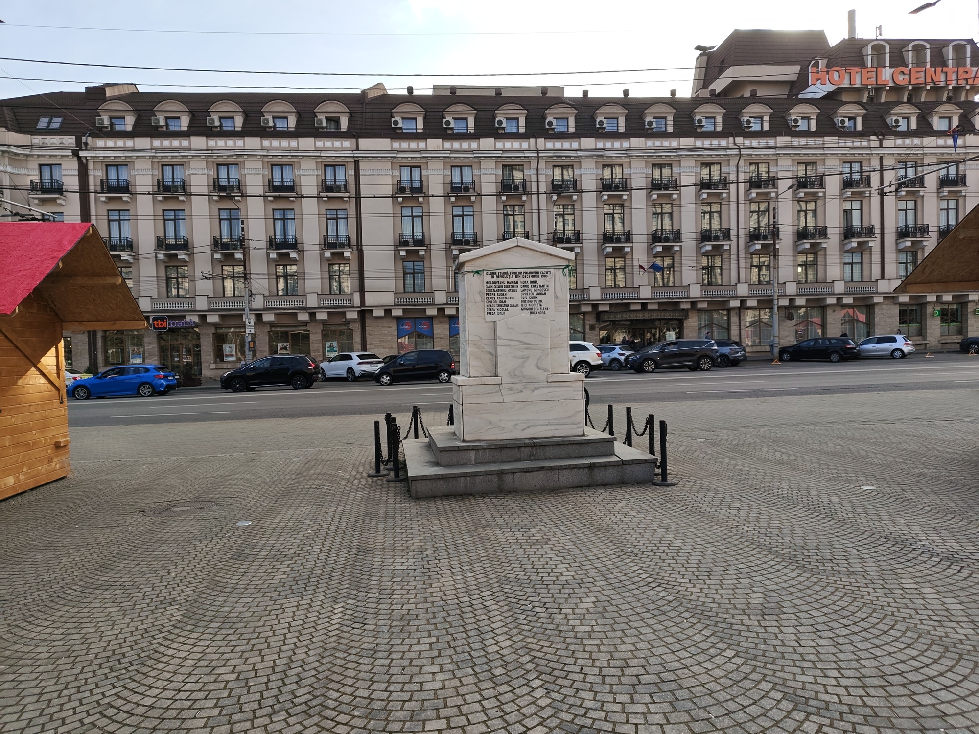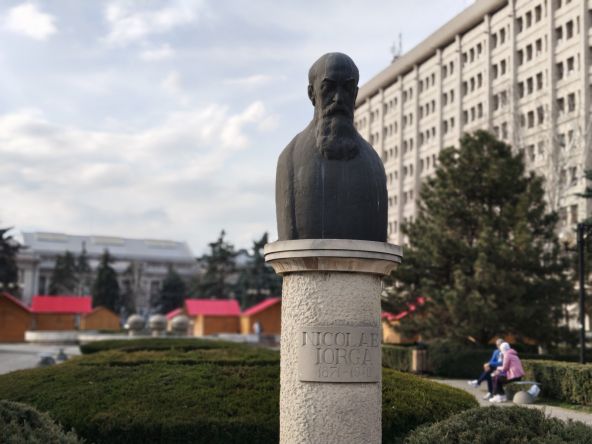 Cu soarele în față apare supraexpunere în cazul cerului, trebuie să fim atenți deci la sursele de iluminare. În fotografia în care apare statuia lui Nicolae Iorga am surprins un cer mult mai plăcut privirii, cu nori și detalii ușor de remarcat în depărtare (precum căsuțele pregătite pentru târgul de Paște sau Palatul Administrativ din partea dreaptă).