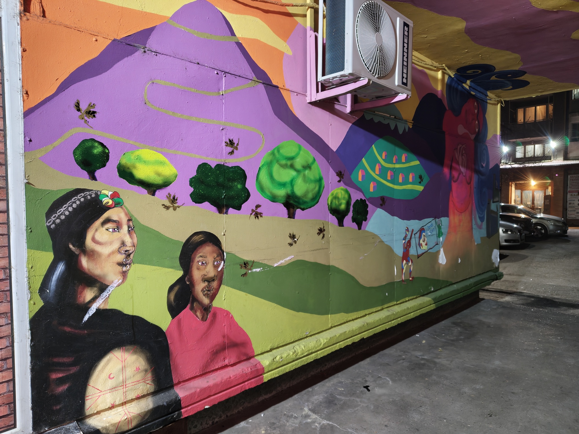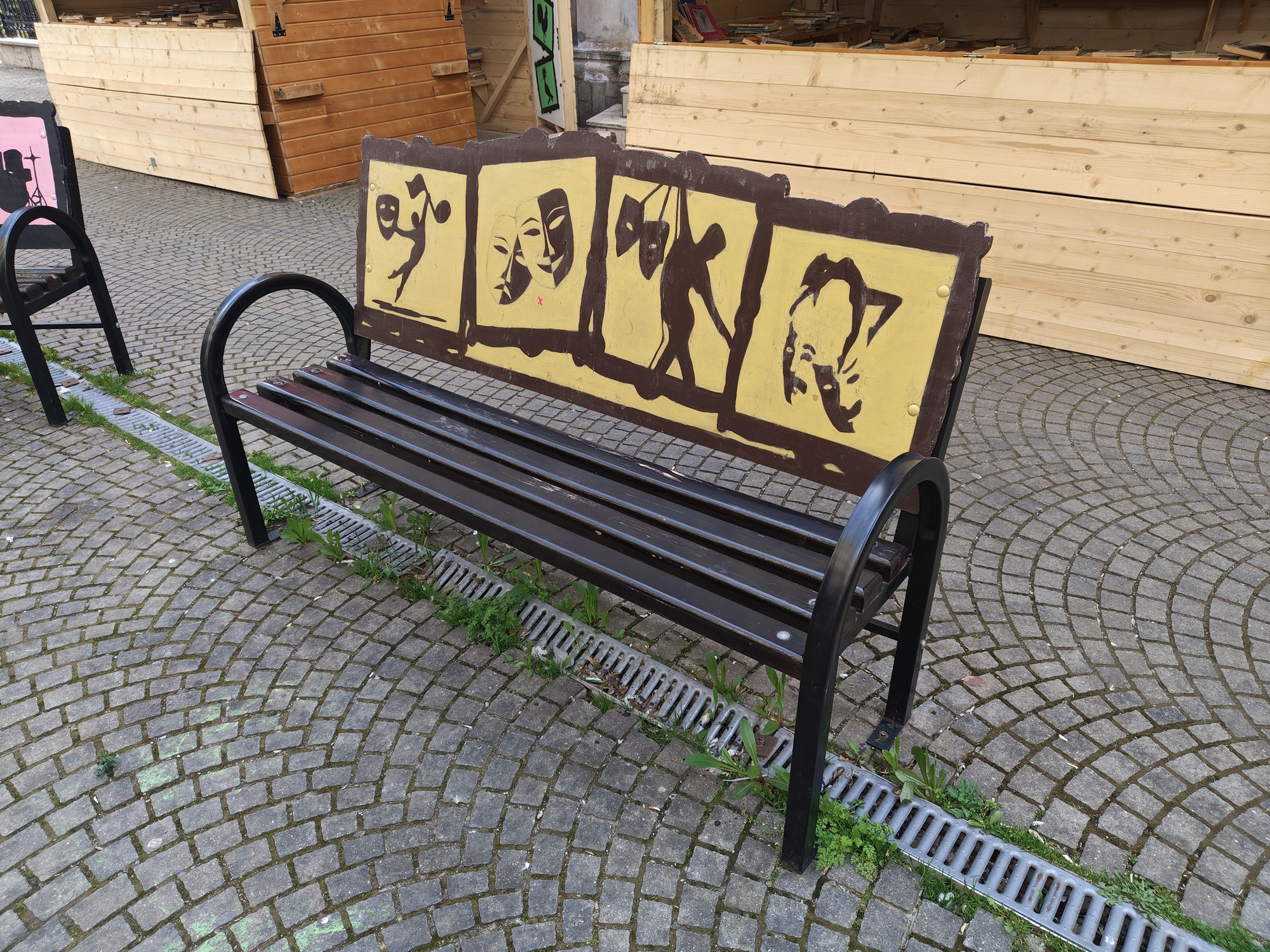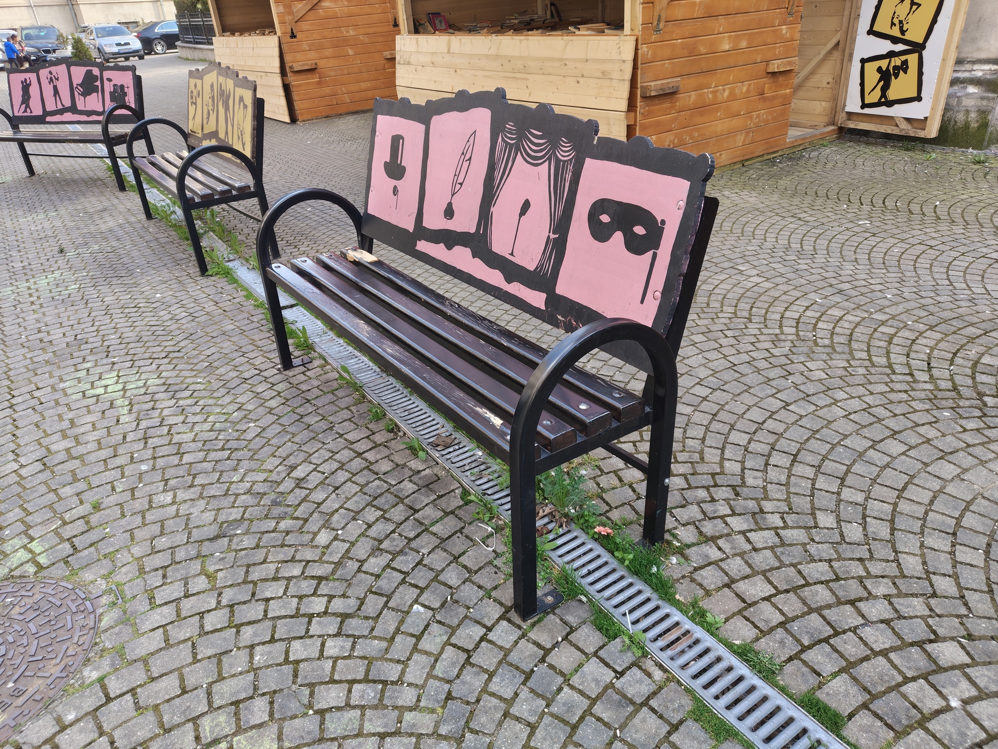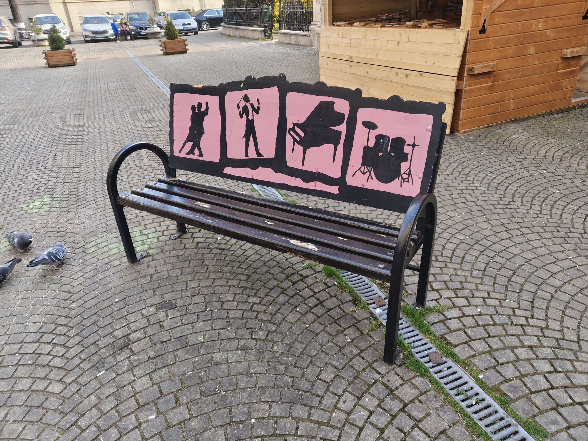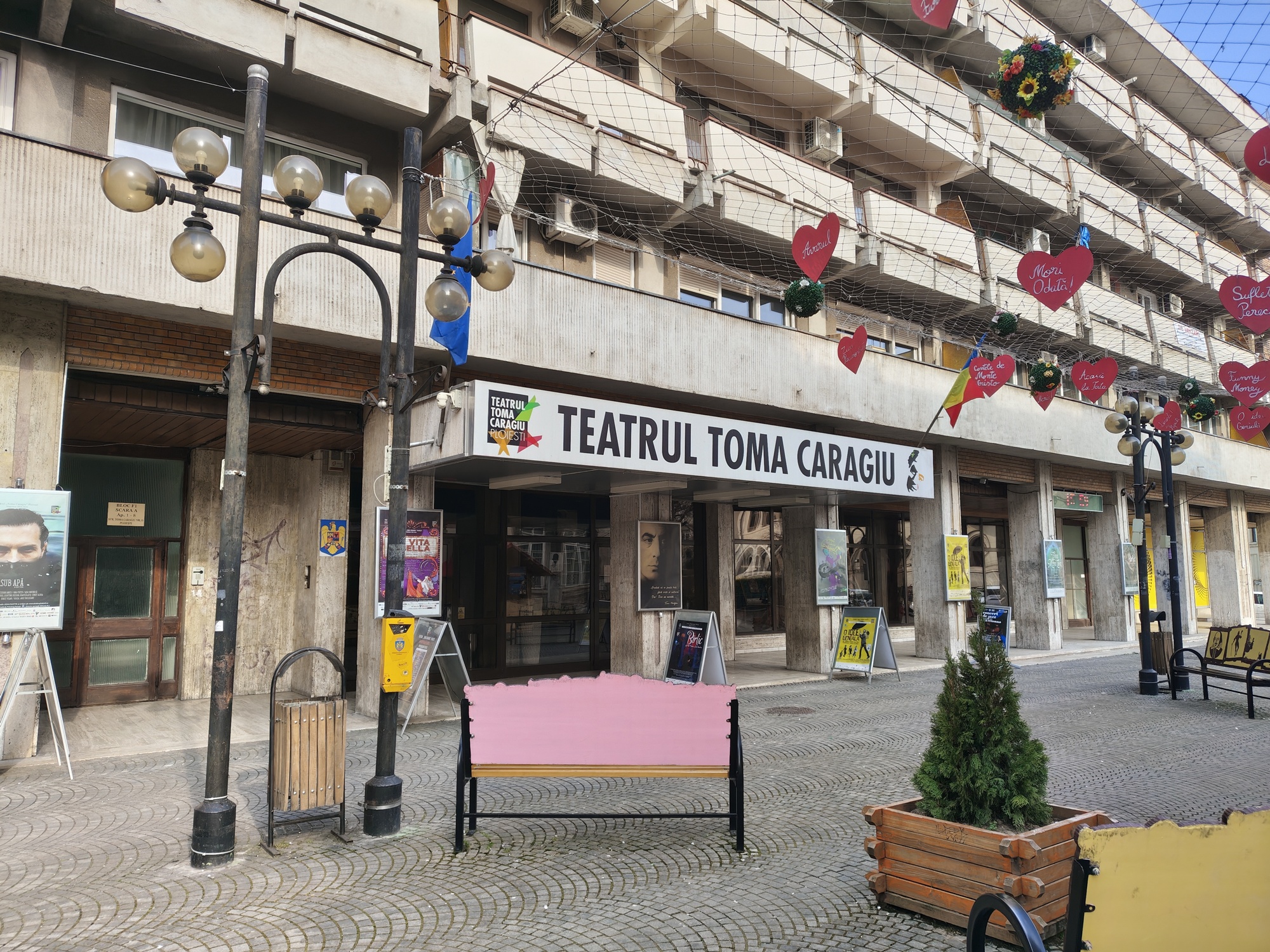 Alta fotografie plăcută vizual e cea cu hidrantul roșu, cu un bokeh aplicat cumva în exces, dar de o claritate bună în rest. Văd până și scrisul de pe eticheta de mici dimensiuni lipită pe acesta. În fața Teatrului Toma Caragiu avem ceva mai multă culoare, bănci roz și galbene cu diferite simboluri teatrale a căror detalii au fost surprinse plăcut și rămân chiar dacă facem zoom din crop.
