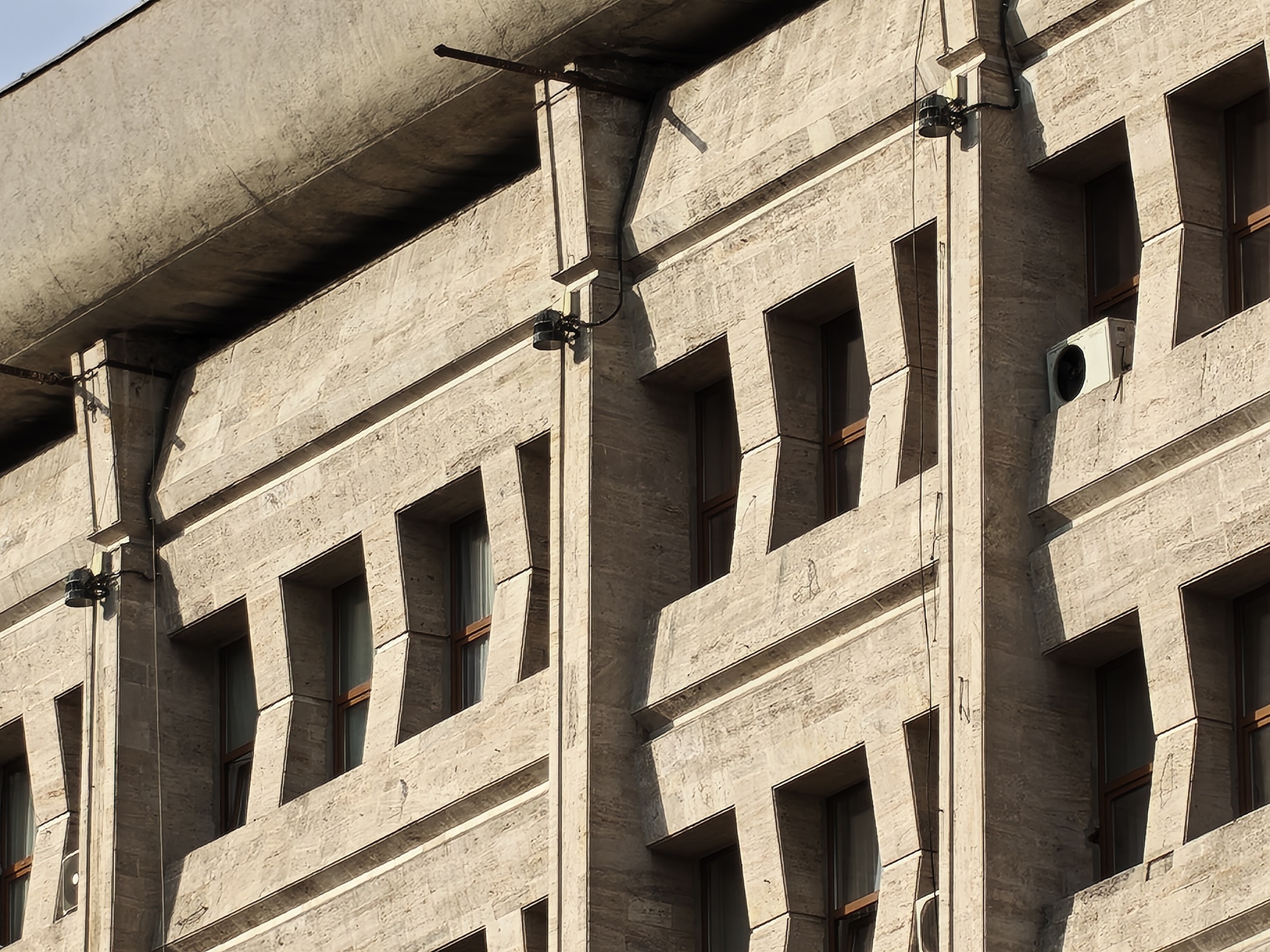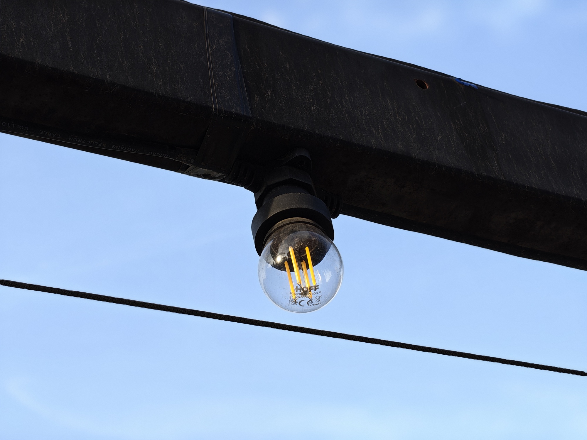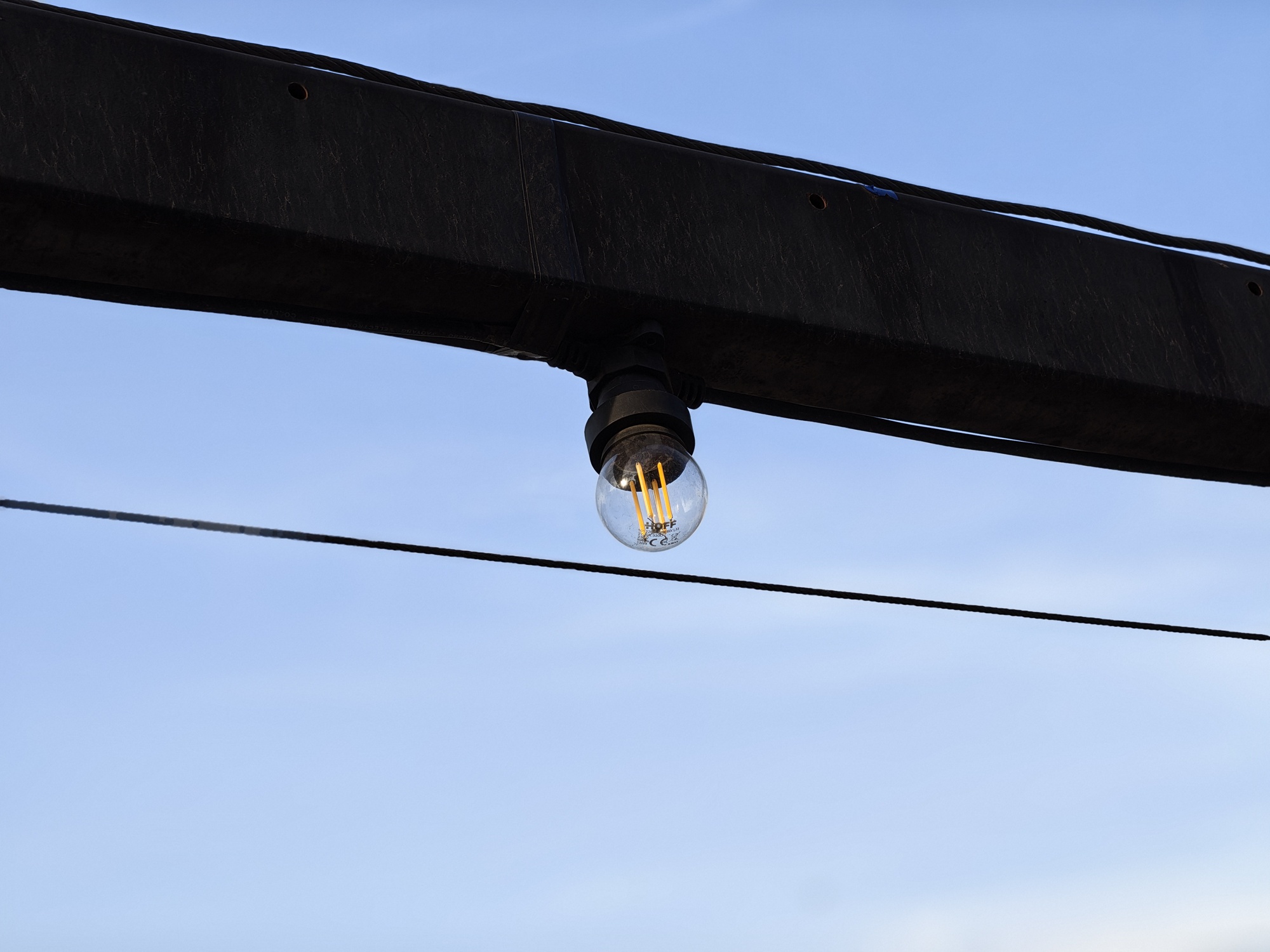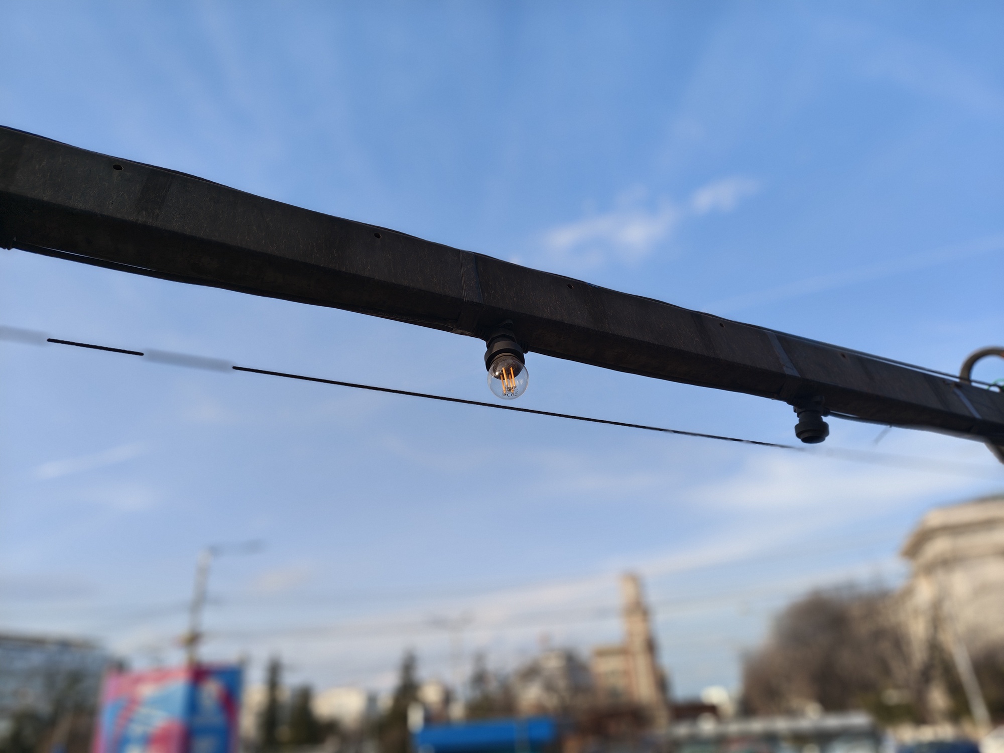 Avem cameră periscopică aici, deci am multe capturi cu zoom, teste pe diferite clădiri unde am mers până la 140X mai mult de curiozitate, pentru că nu mă așteptam la „minuni”. Am remarcat din start că cel mai bine e să ne oprim undeva la 20X dacă vrem cât de cât detalii. Captura cu acel bec e realizată cu 7X și tot văd o mică eroare în ceea ce privește bokeh aplicat pe acel fir ce trecea prin spate.