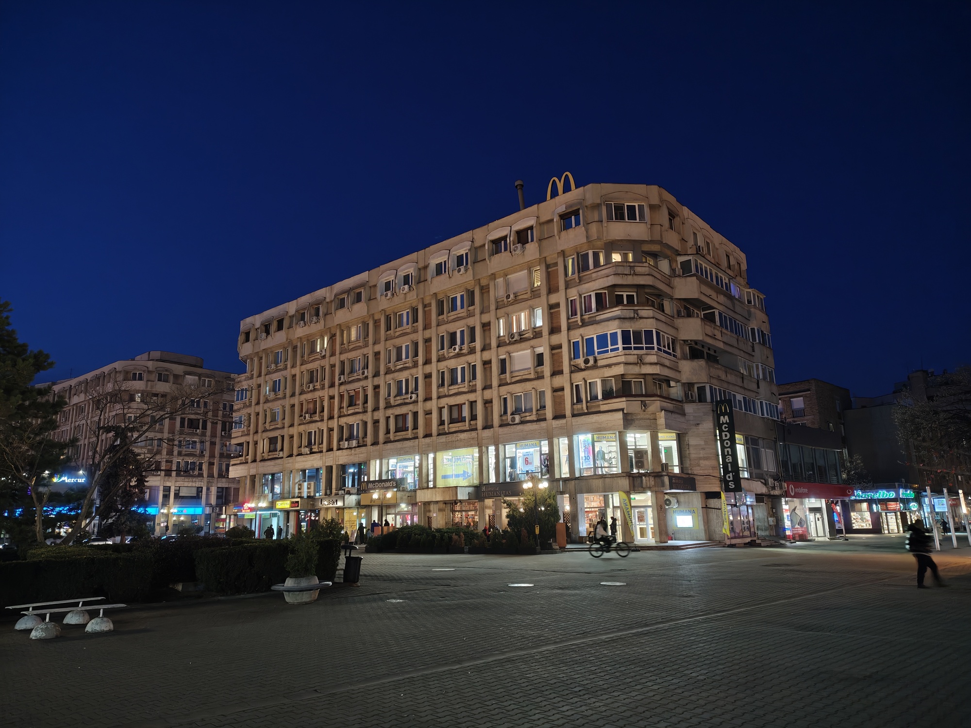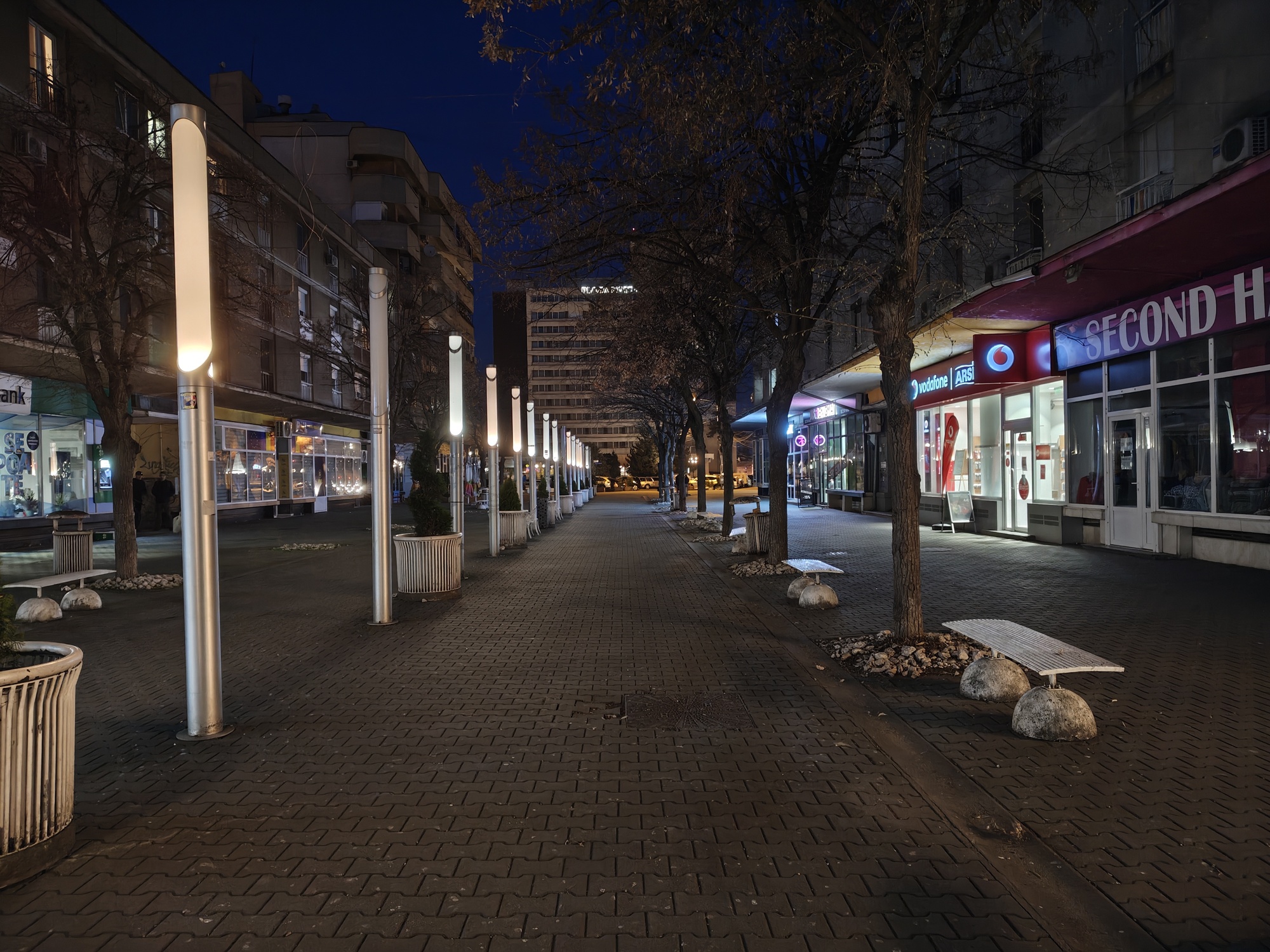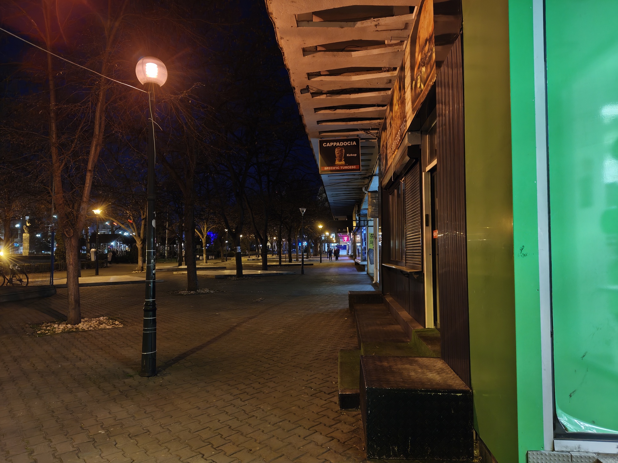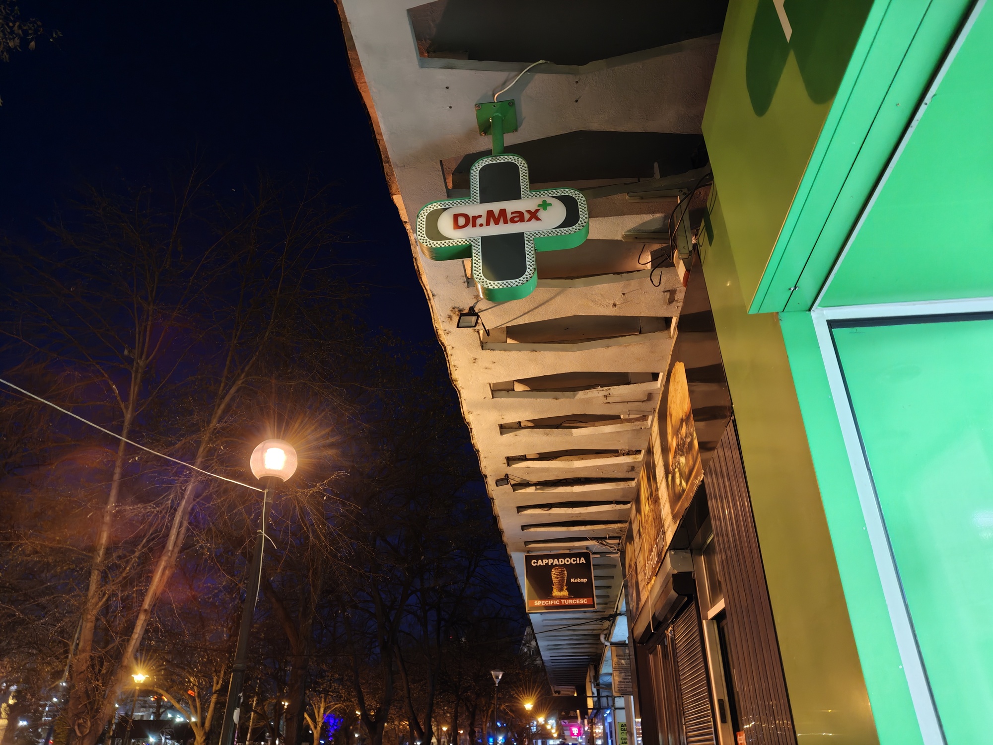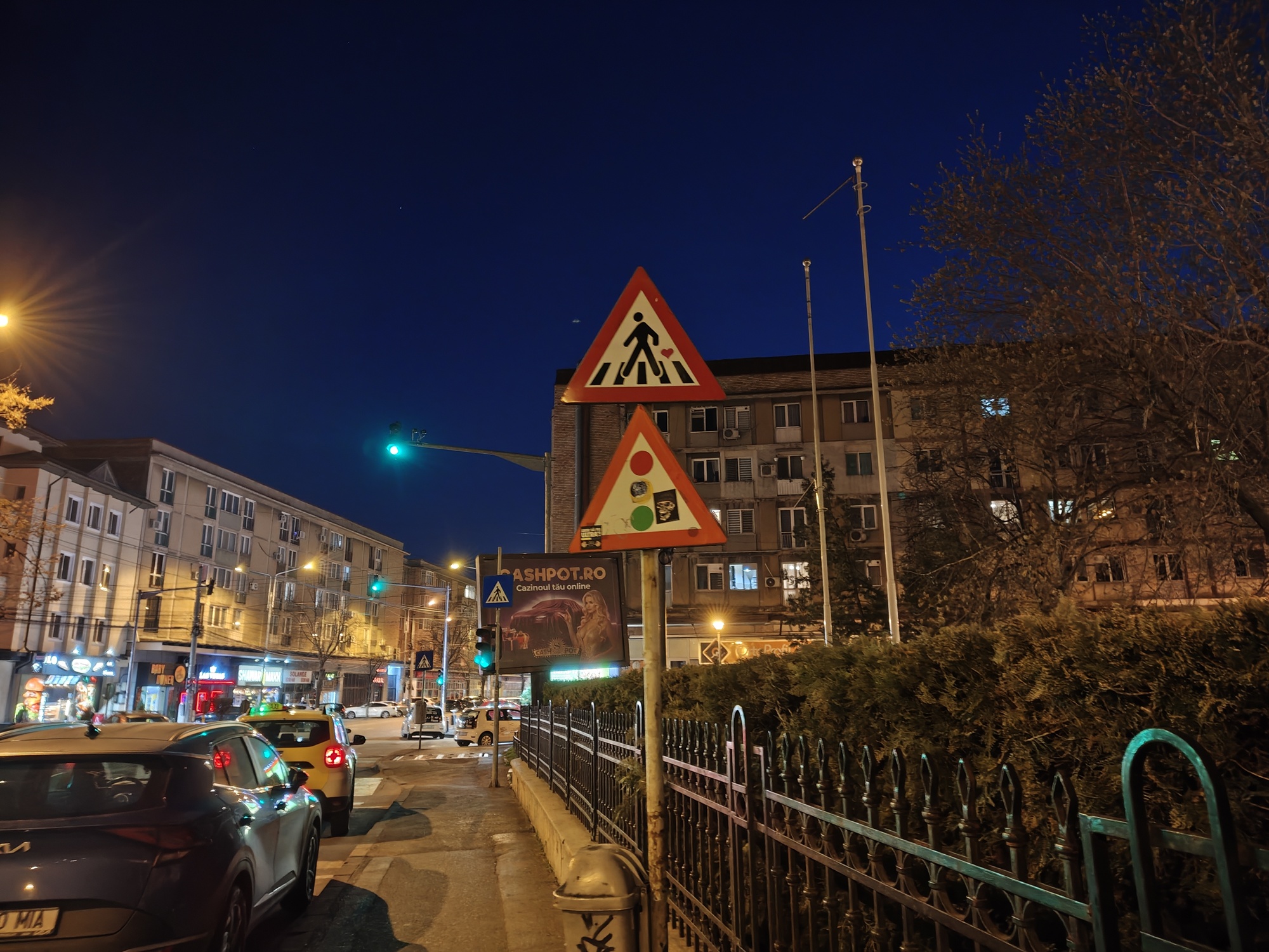Pe timp de noapte lucrurile se schimbă puțin. Night Mode-ul nu e dus la extrem, dar am remacat că e mult mai rapid decât în cazul altor telefoane de buget. Trebuie să stai nemișcat doar 1-2 secunde până ce captura cu Night Mode e gata. În schimb, apar halo-uri în jurul surselor de iluminare și avem mult Lens Flare în special spre extremități (tot din cauza surselor excesive de iluminare).