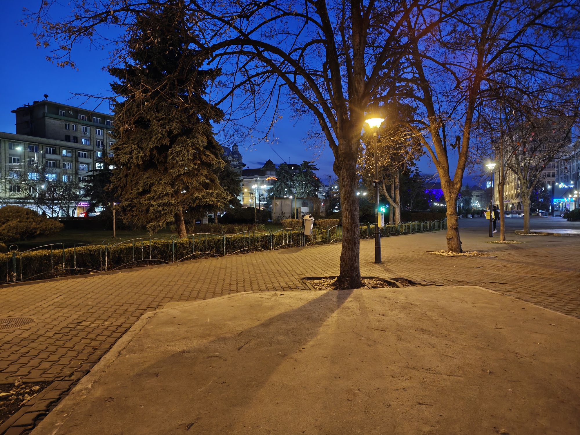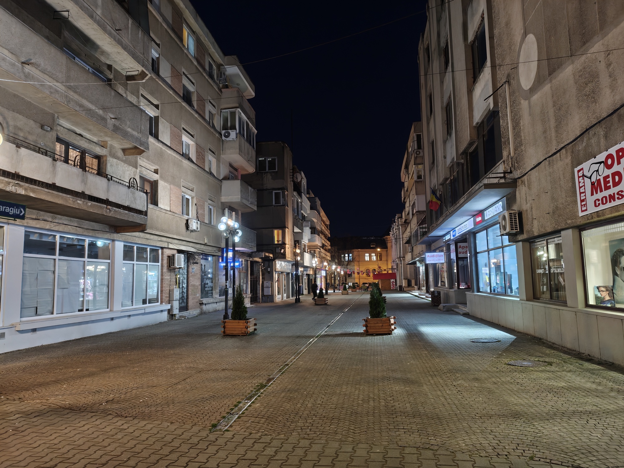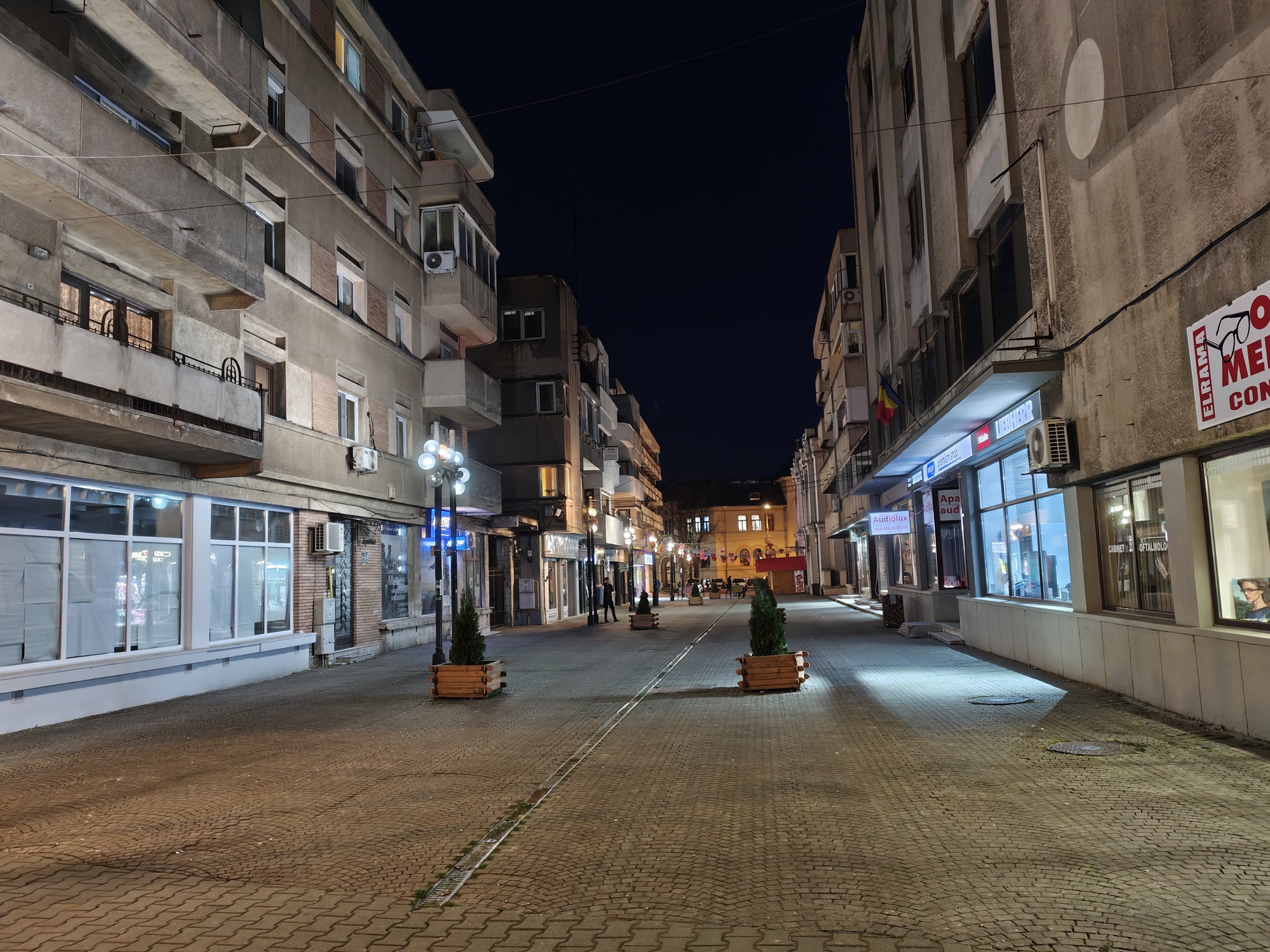 Telefonul se străduiește în continuare să livreze detalii și culori cât mai apropiate de realitate, în ciuda condițiilor dificile. Poza preferată din această categorie aș zice că e cea de pe Strada Teatrului unde avem un soi de perspectivă în două puncte, acolo unde sursele de iluminare sunt mult mai blânde, iar detaliile arhitecturale sunt clar conturate, fără Lens Flare sau alte artefacte vizuale.