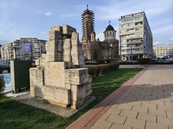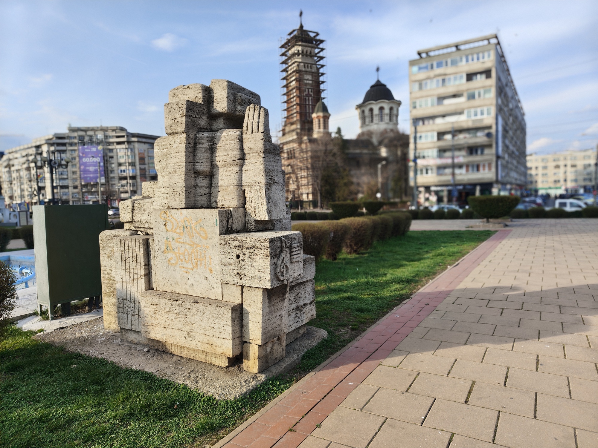 O altă fotografie realizată cu modul Portrait ne aduce acele ornamente de metal în centrul atenției. Arată și ea foarte bine, mai că ai zice că nu e făcută cu un smartphone accesibil. Am capturat și acel monument abstract de mari dimensiuni tot prin intermediul modului Portrait. La prima vedere arată bine, doar ca fundalul din spate e estompat cam pe jumătate, turnul Bisericii ieșit cumva în evidență față de restul clădirilor de lângă.