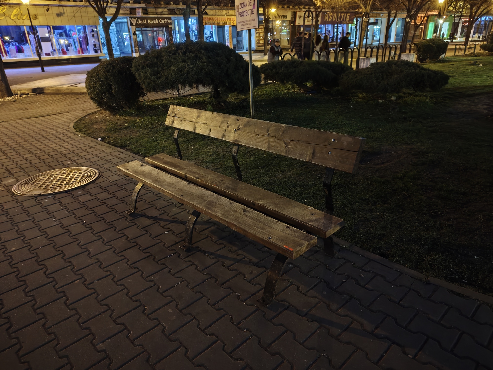 S-a făcut între timp și noapte și suntem întâmpinați de o imagine tremurândă, telefonul încercând constant să ajusteze detaliile, culorile, fiind cumva „bulversat” de sursele de iluminare din zonă. În zona băncilor din parc apar multe artefacte, iar captura e departe de a fi mulțumitoare. Aș evita, deci, să folosesc Nothing Phone (4a) Pro pentru filmare nocturnă.