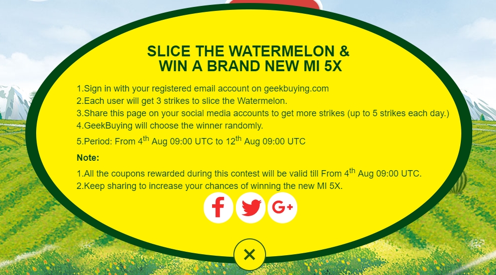 Oferta este tare bună și trebuie să vă anunțăm că această campanie marca GeekBuying se desfășoară în perioada 9 - 12 august, participanții având șansa de a deschide până la 3 astfel de pepeni cu surprize și alege cuponul de reducere care îi încântă cel mai mult pentru folosirea sa. Dacă veți da share acestei paginii (Link campanie) veți primi până la 5 șanse de a deschide pepeni în fiecare zi, dar și participa la tragerea la sorți pentru câștigarea unui smartphone Xiaomi Mi 5X.