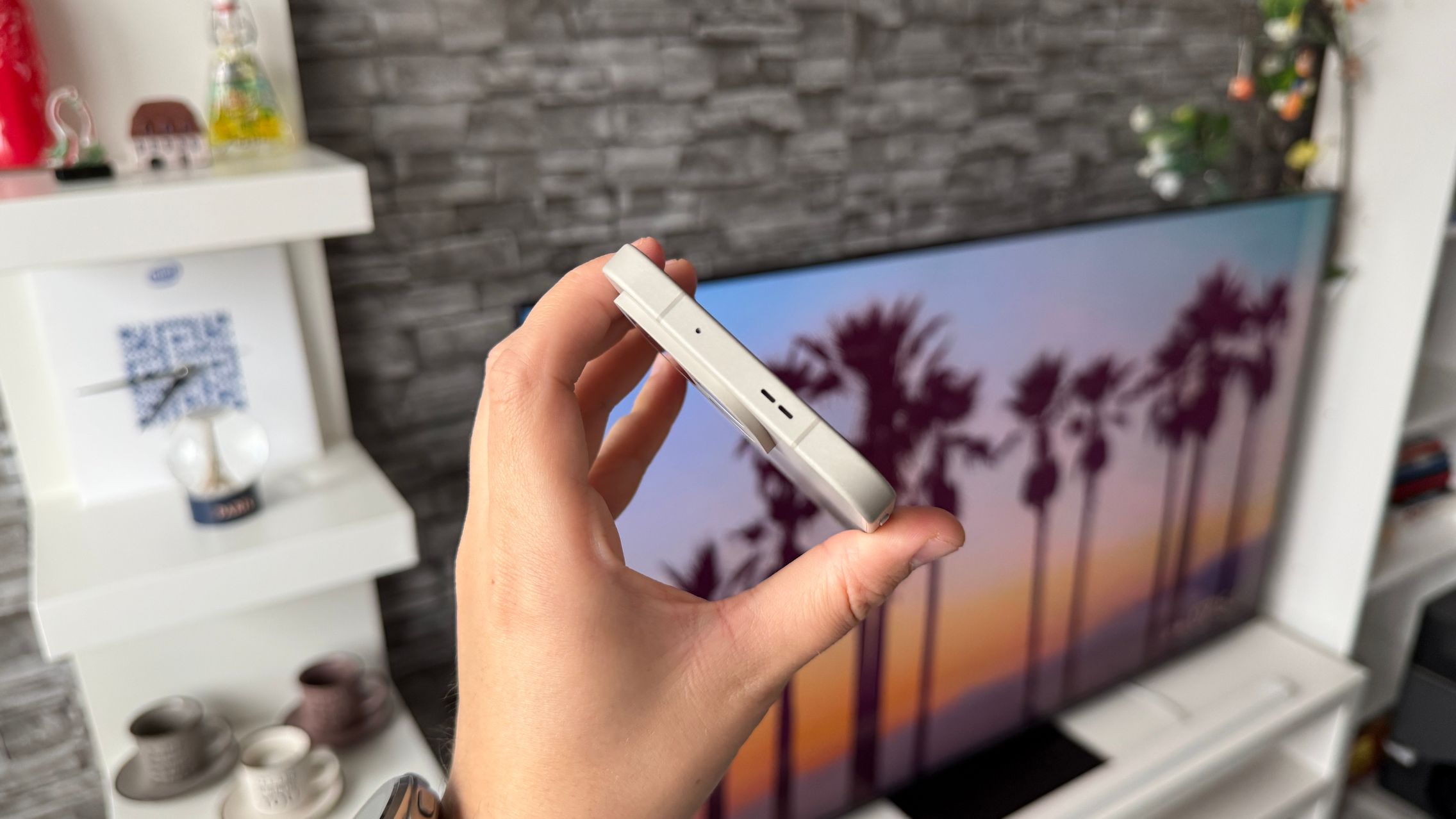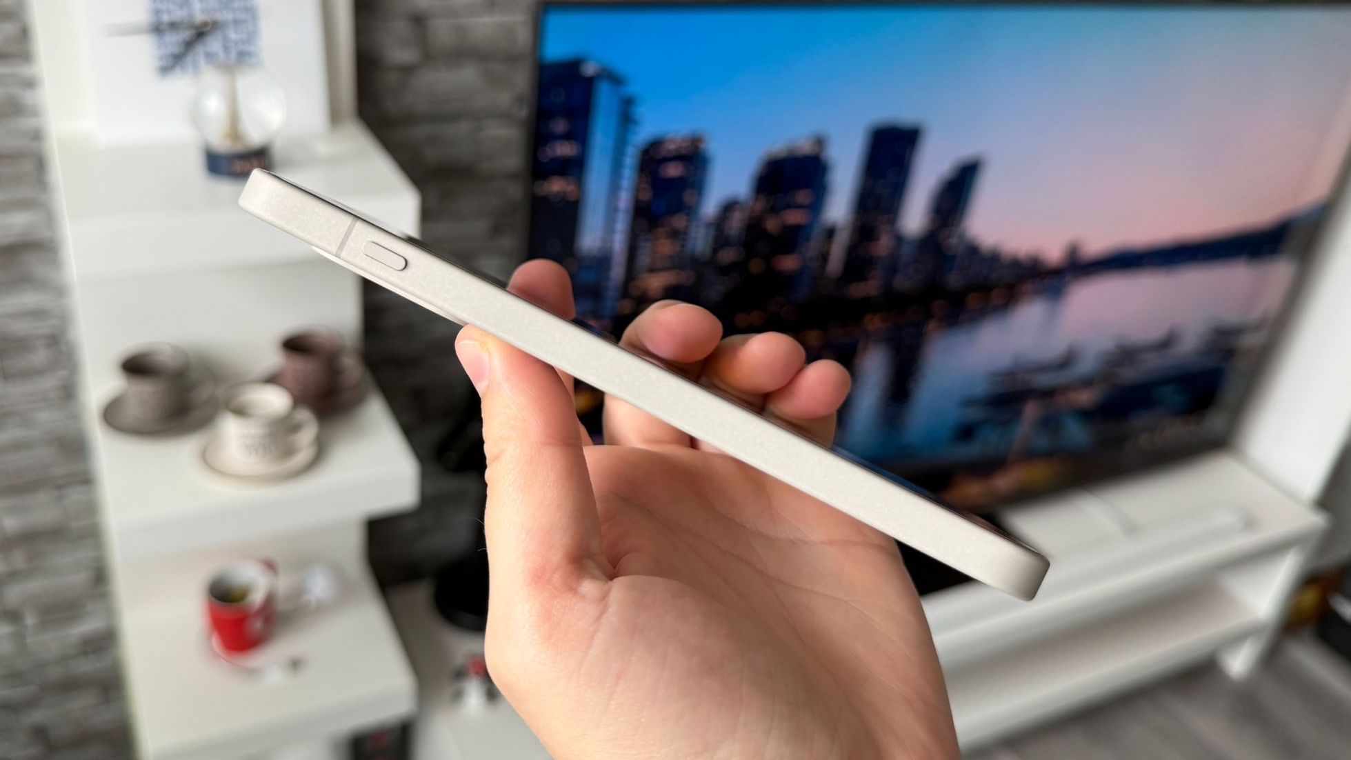 Sunt 3 variante de culoare aici - Infinite Black (sticlă AG), Ultra Violet și Sand Storm (fibră de sticlă), iar aceasta din urmă a ajuns la mine. E un soi de alb nispiu, un bej foarte arătos. E șocant la prima atingere și am avut un feeling de parcă telefonul ar fi fost într-o husă. Felul în care se simte materialul din spate mă duce cu gândul la acele huse premium din silicon de pe iPhone, cele originale.