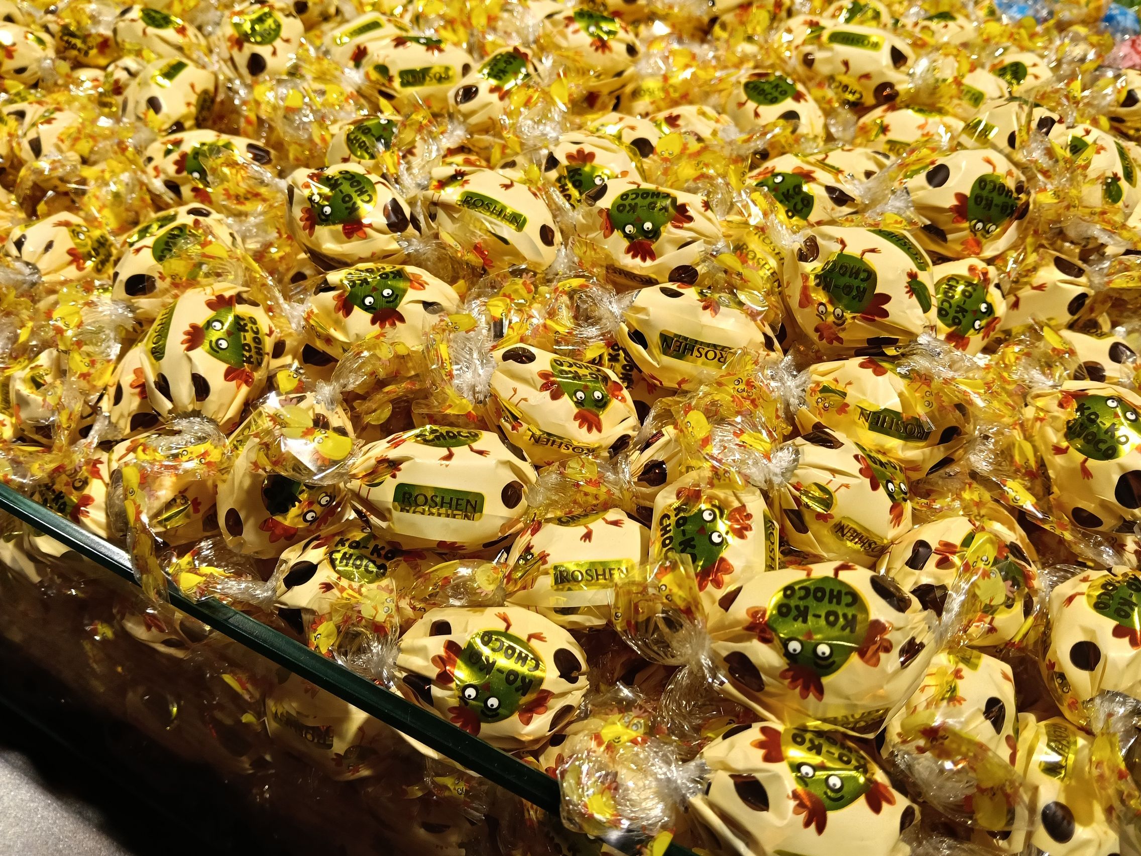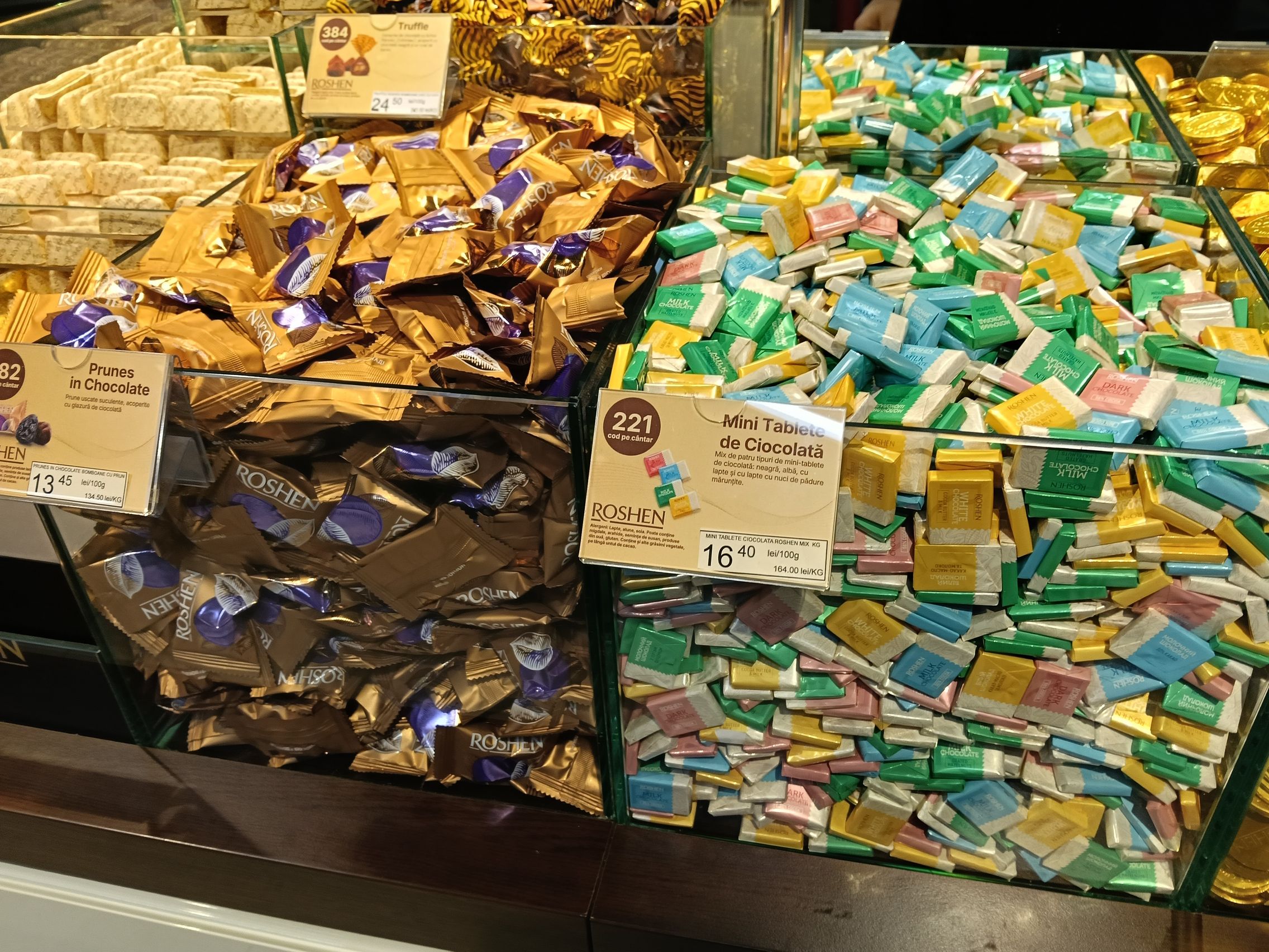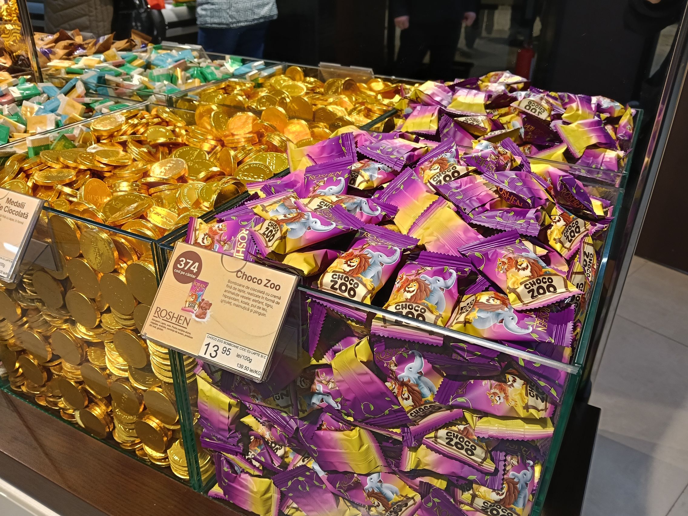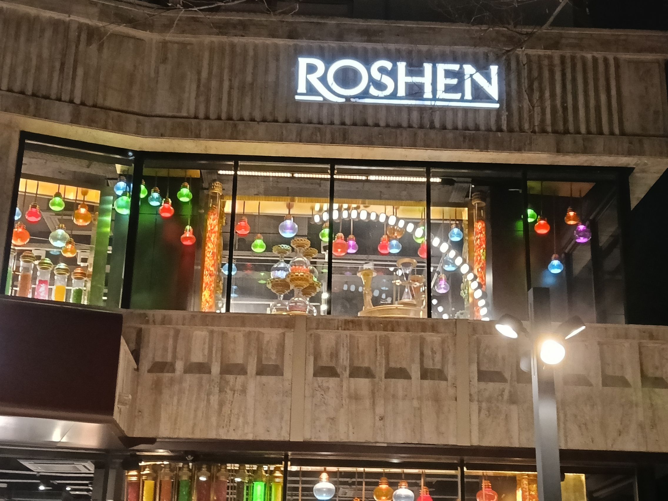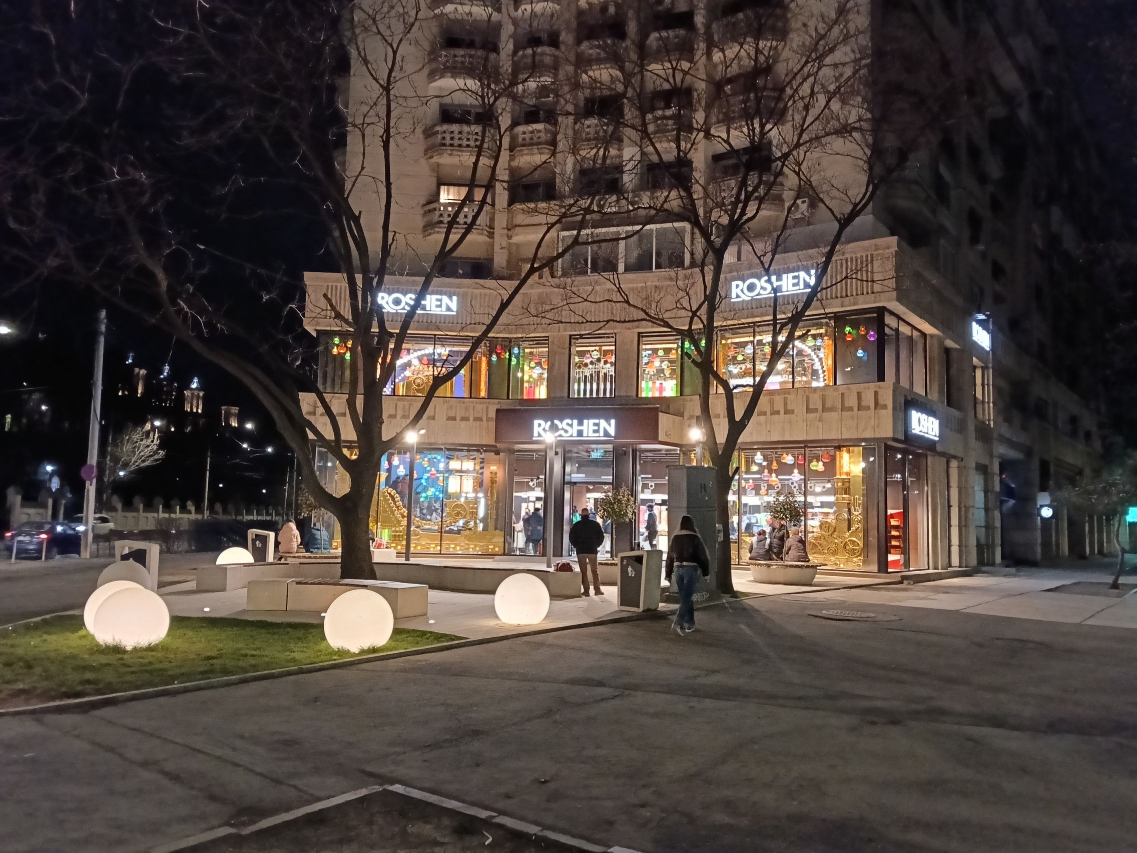 Când se lasa noaptea... mergem după dulciuri. Am fost nu în unul, ci două magazine de dulciuri Roshen. Spirale fabuloase de becuri colorate, tonomate cu bomboane şi drajeuri, un copac sfătos cu ratoni mişcători lângă. Era visul oricărui copil. Aici pot să zic că mă declar foarte mulţumit de culori, în situaţii de iluminare artificială puternică.