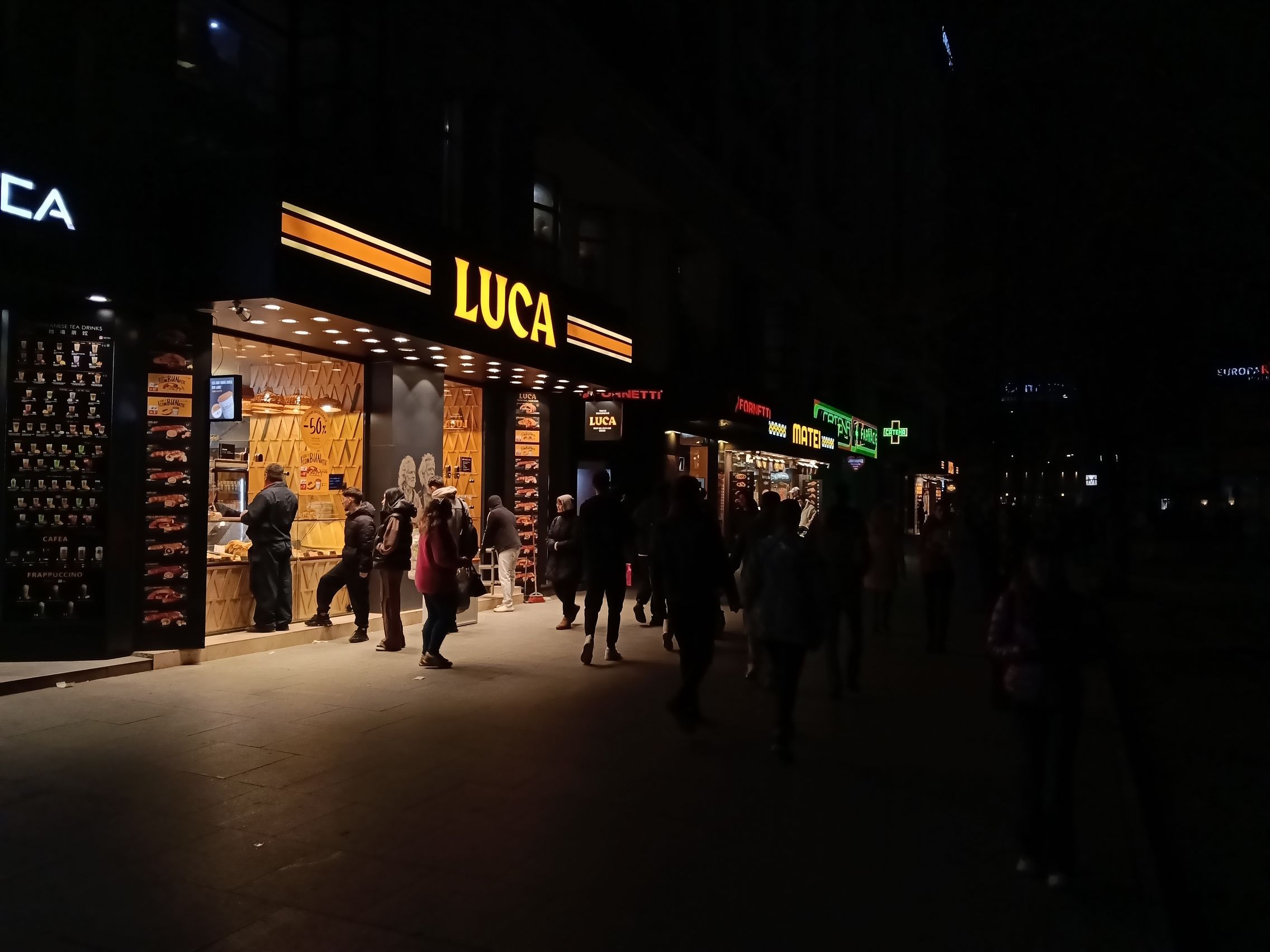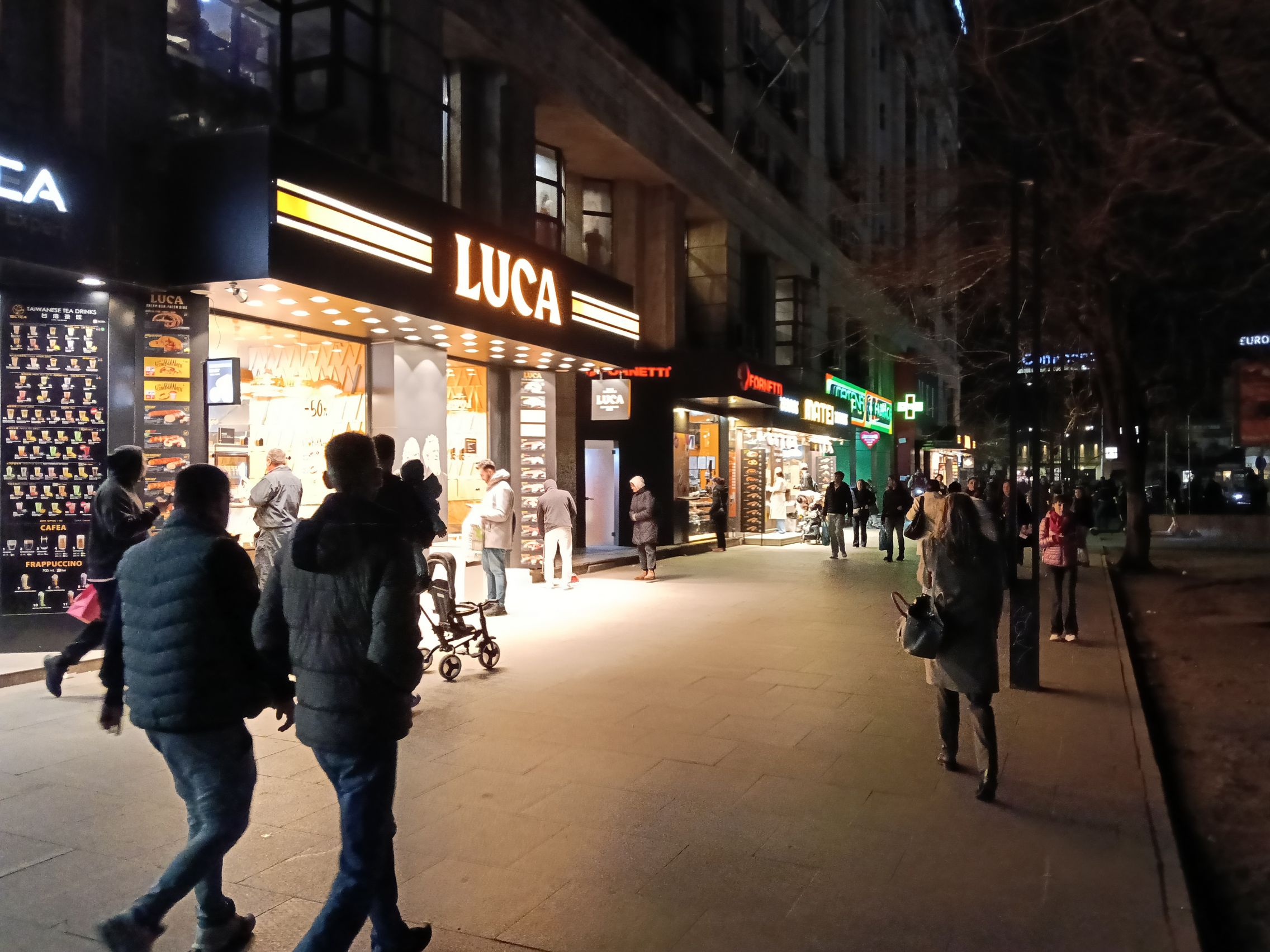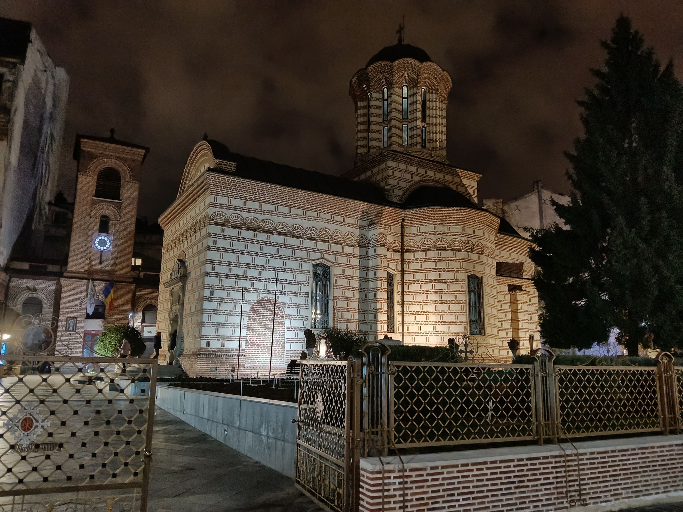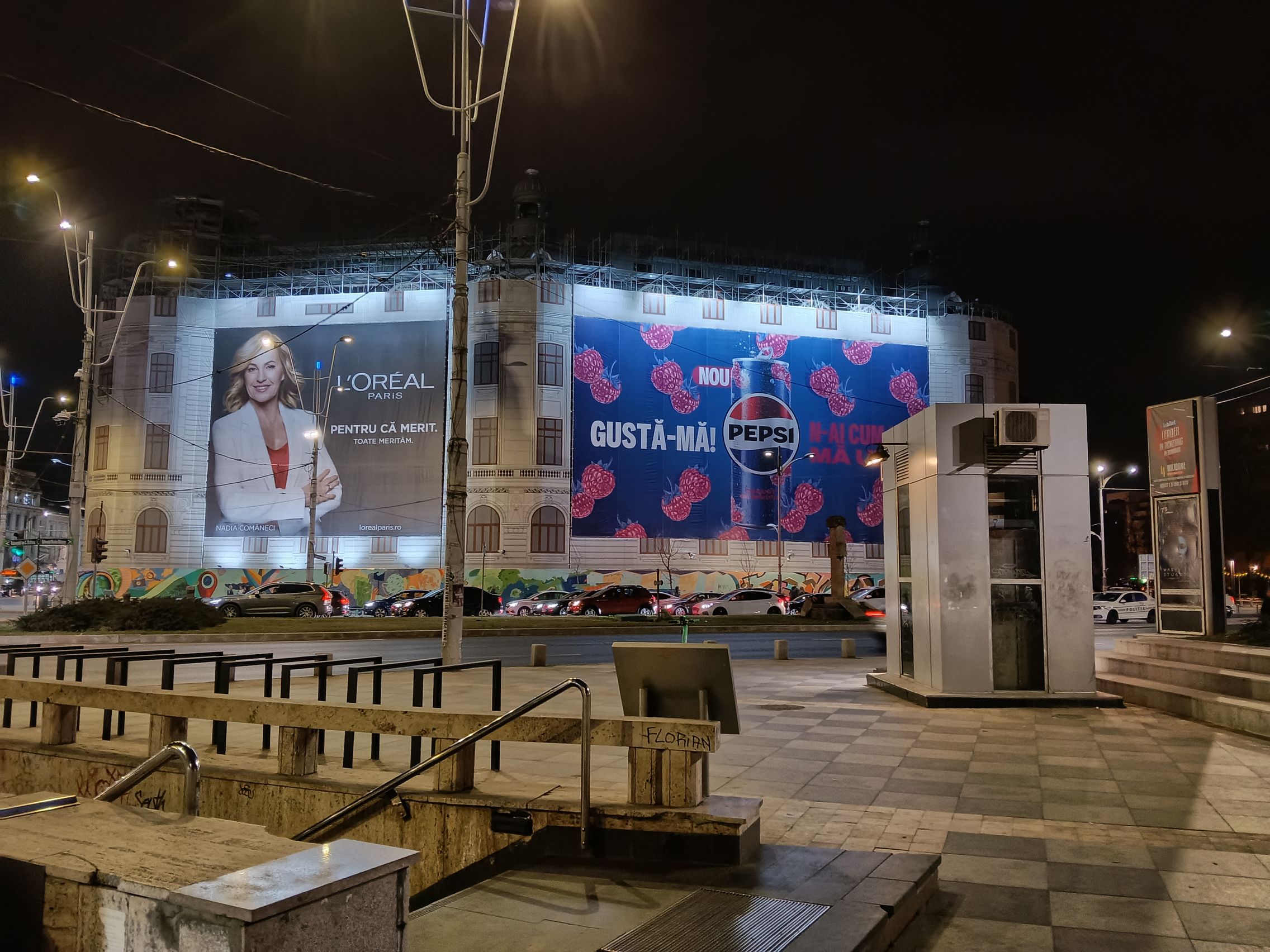 La exterior e posibil să tinzi spre un Night Mode, când luminile stradale sau cele ale restaurantelor din Centrul Vechi sunt prea puternice. Stâlpii de iluminat pot crea halouri, dar le remediază Night Mode. Zoom-ul e mai slab noaptea, era de aşteptat, când nu ai camera tele. Cadrele din zonele mai întunecate precum Catena la Unirii nu sunt chiar un succes, având în vedere că oamenii ies mişcaţi şi că nu captăm suficientă lumină, pentru a fenta zgomotul.