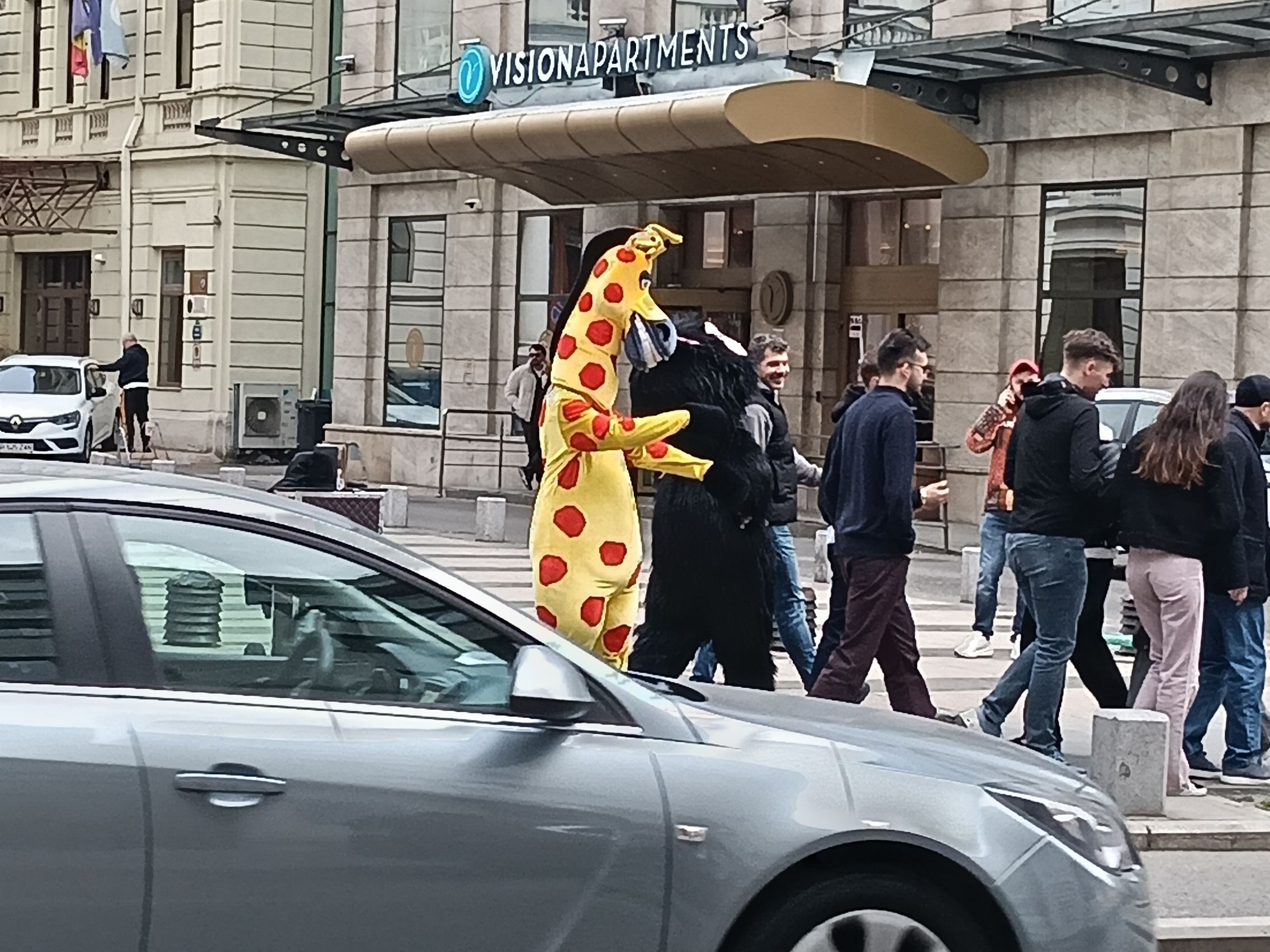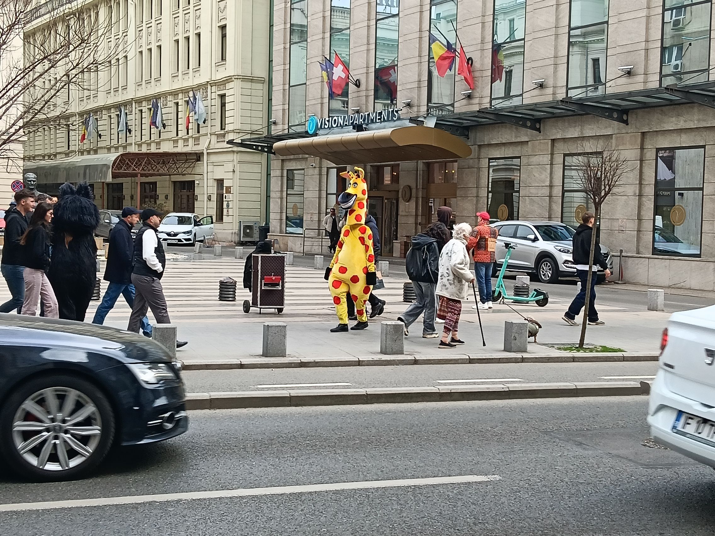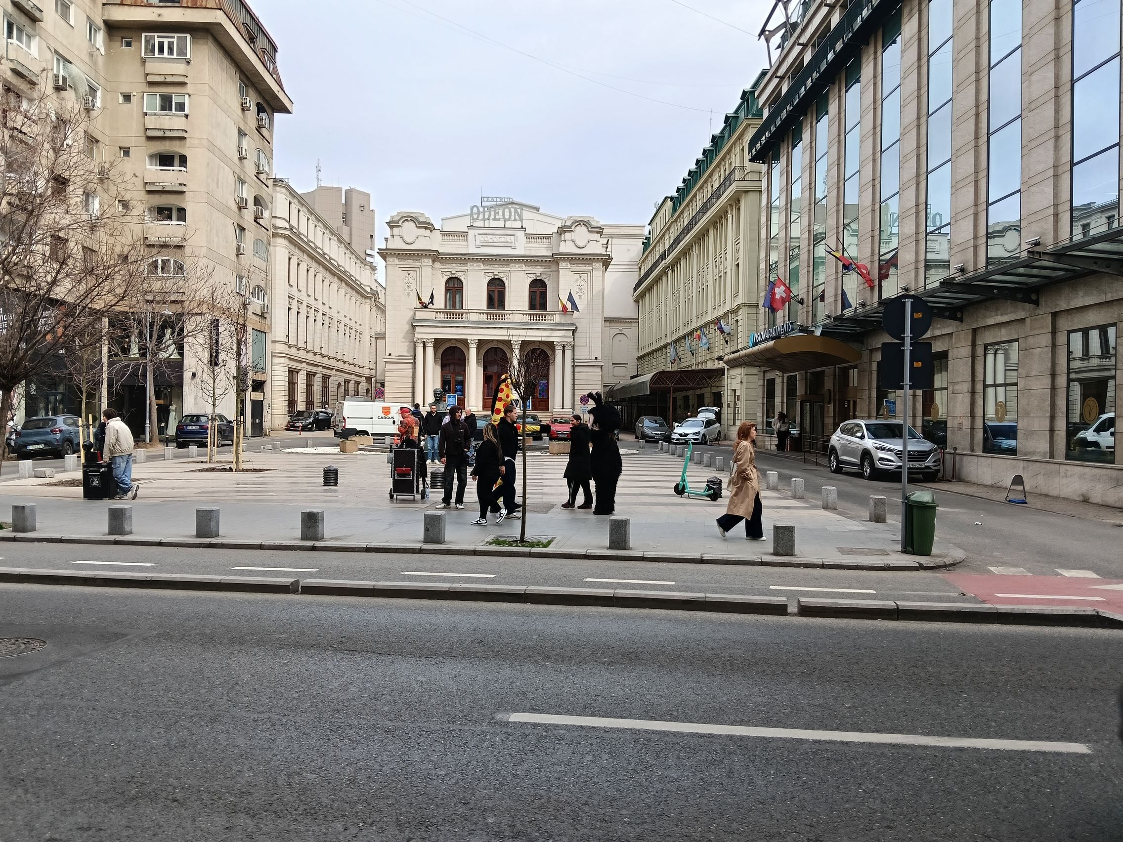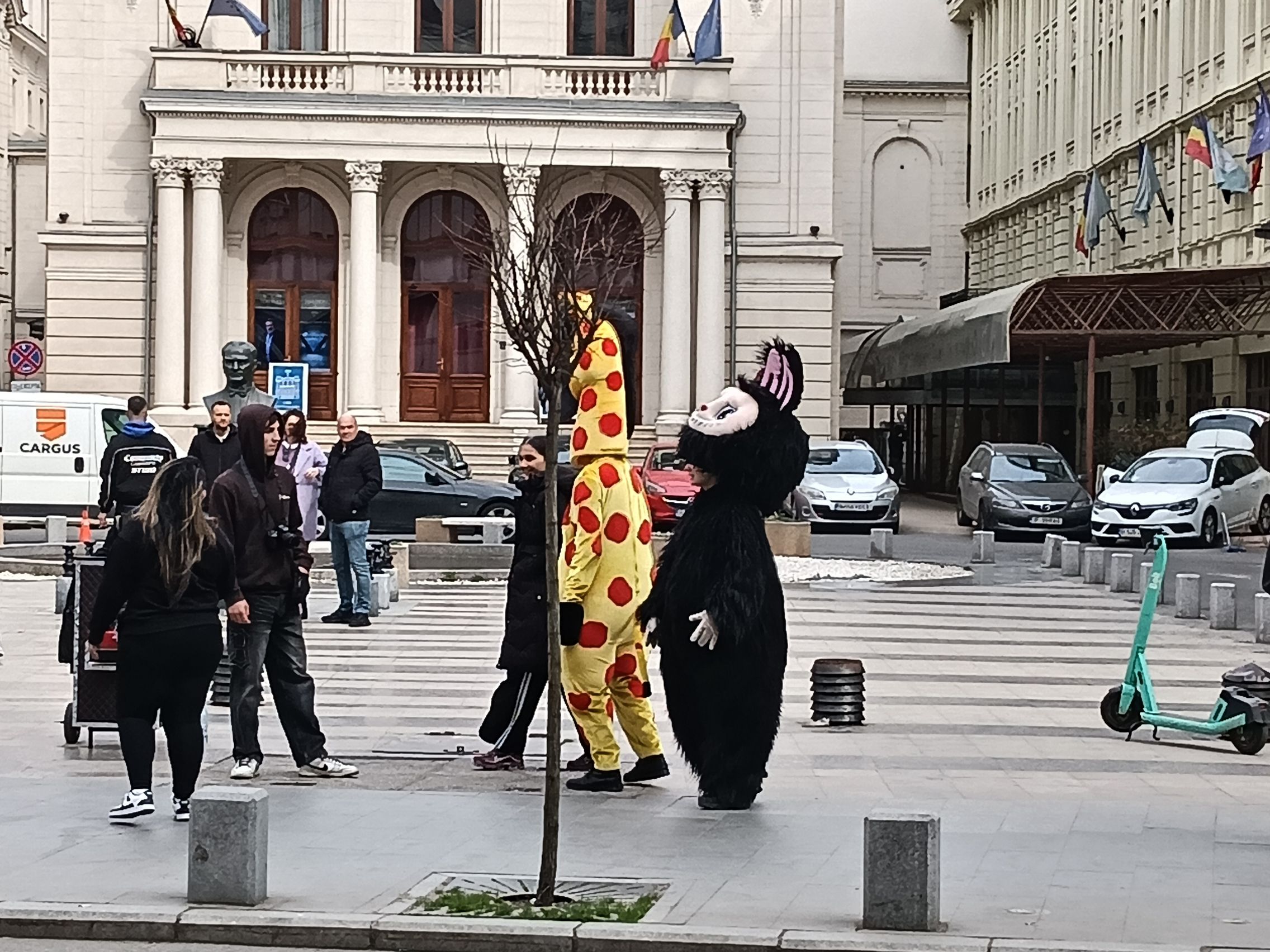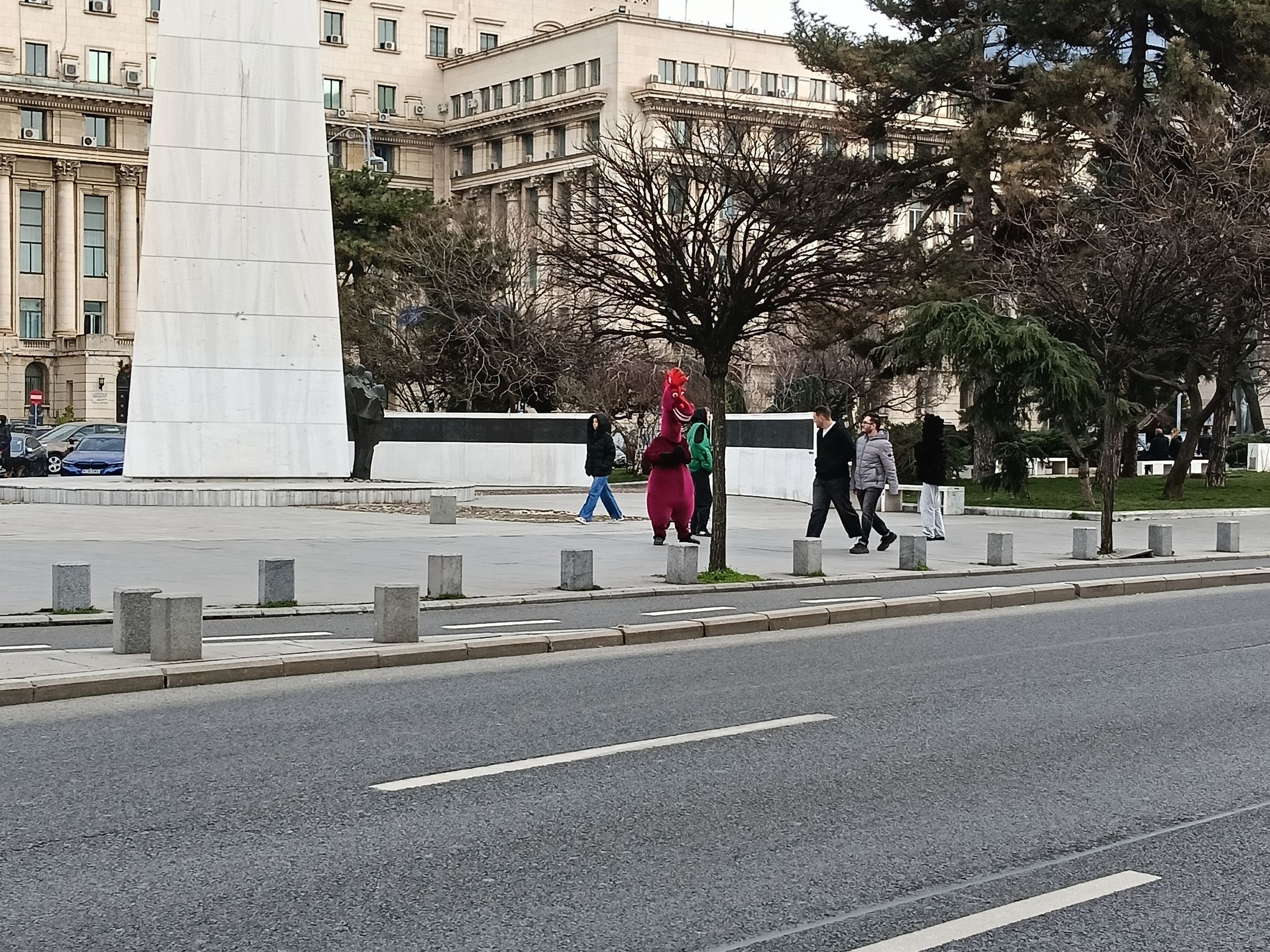 Zoom-ul e subţirel, după vreo 3X, dar nu puteam să mă abţin din a filma acel măgar mov, care făcea poante pe stradă şi dădea îmbrăţişări gratis. Expunere reglată violent în zona Magazin Muzica şi o filmare duală, cu selfie plus spate, care a ieşit turistic, dar a pierdut la detalii serios, împărţind ecranul în două. Nu ştiu dacă să recomand asta neapărat. Am încercat şi un extra test de stabilizare, dar mişcările sunt prea abrupte, chit că detaliile Muzeului Naţional de Istorie sunt OK.