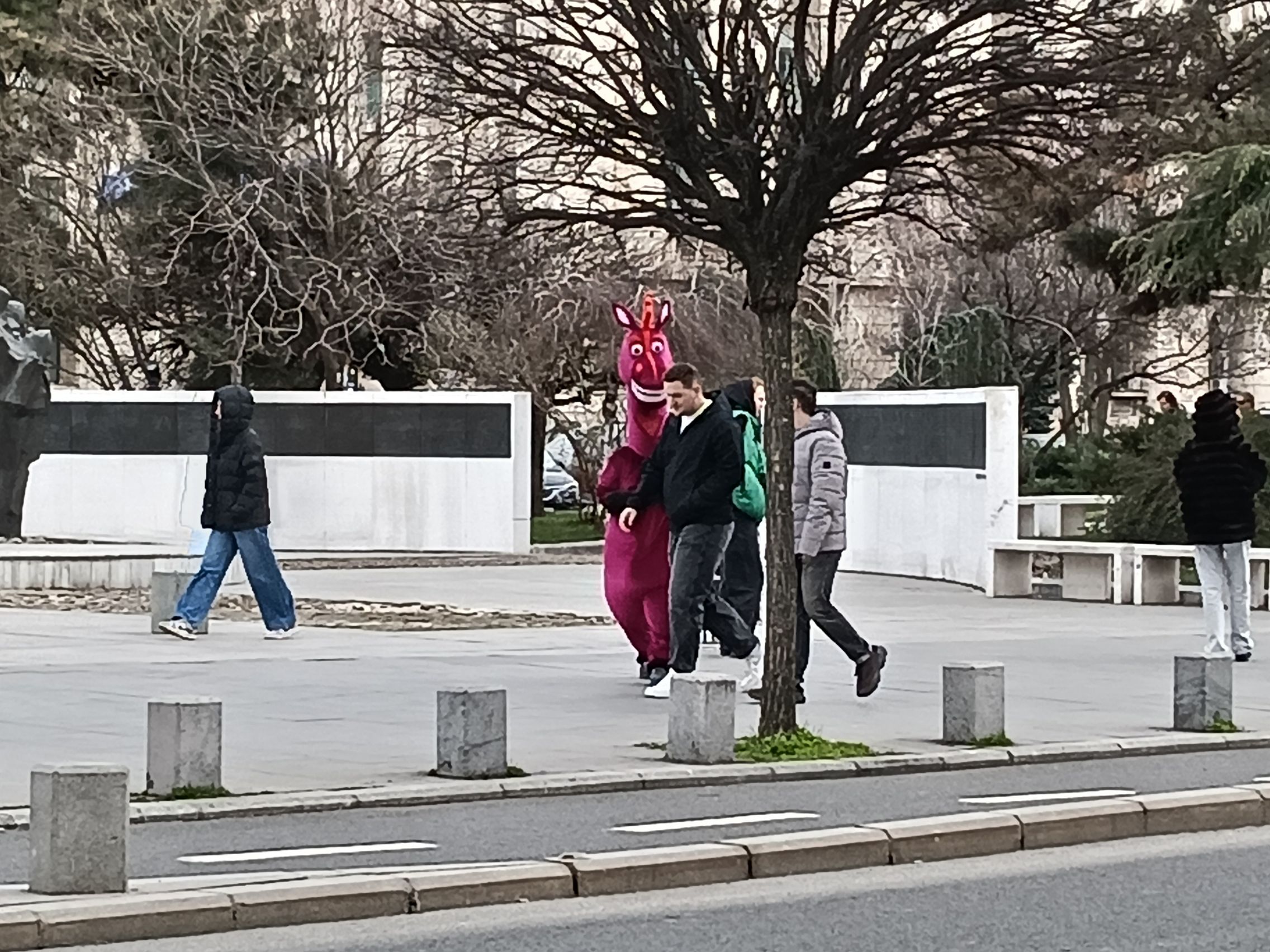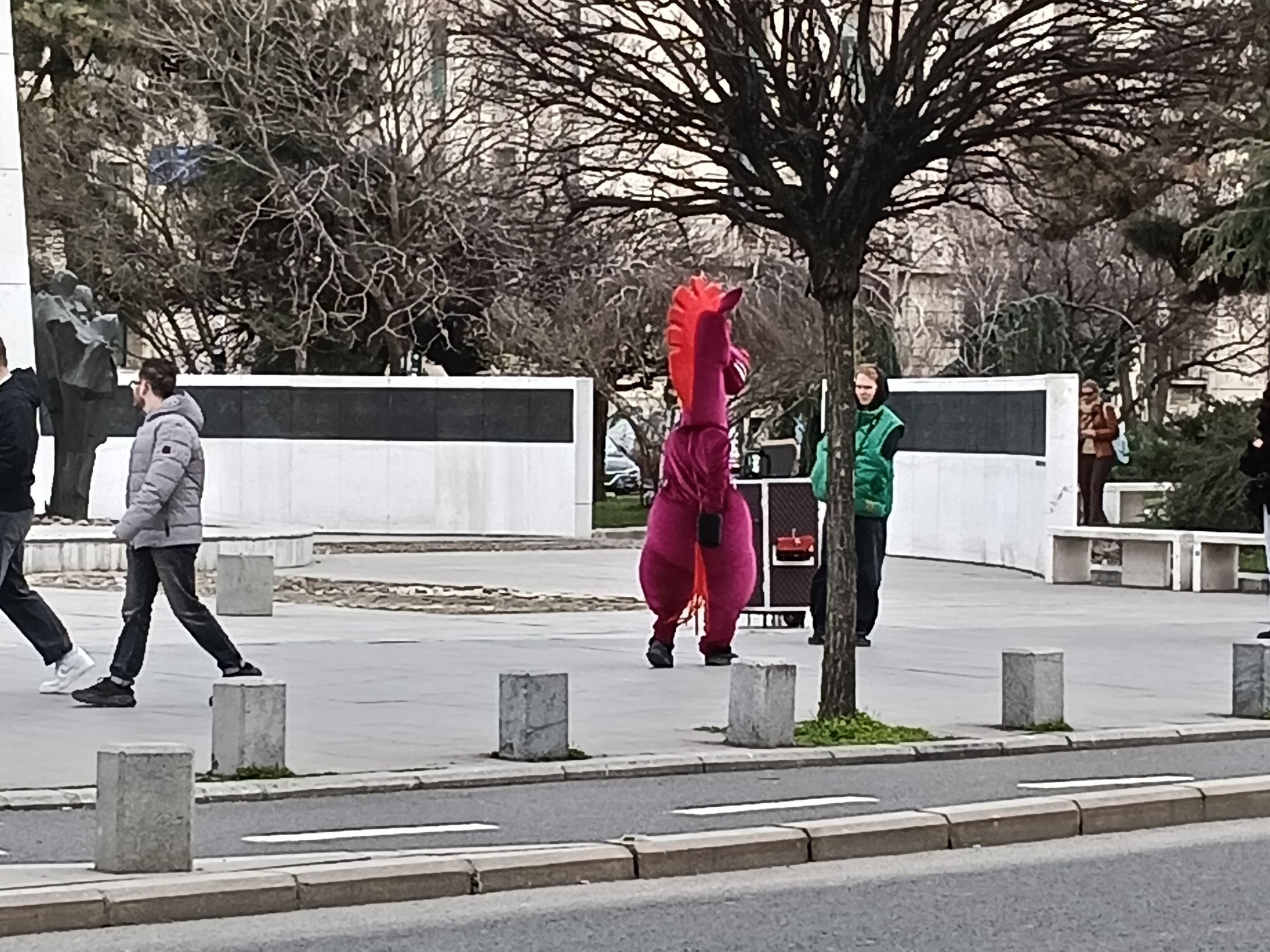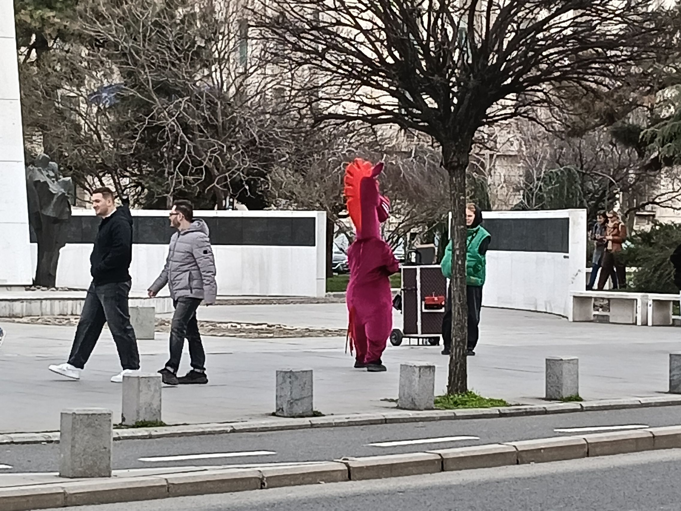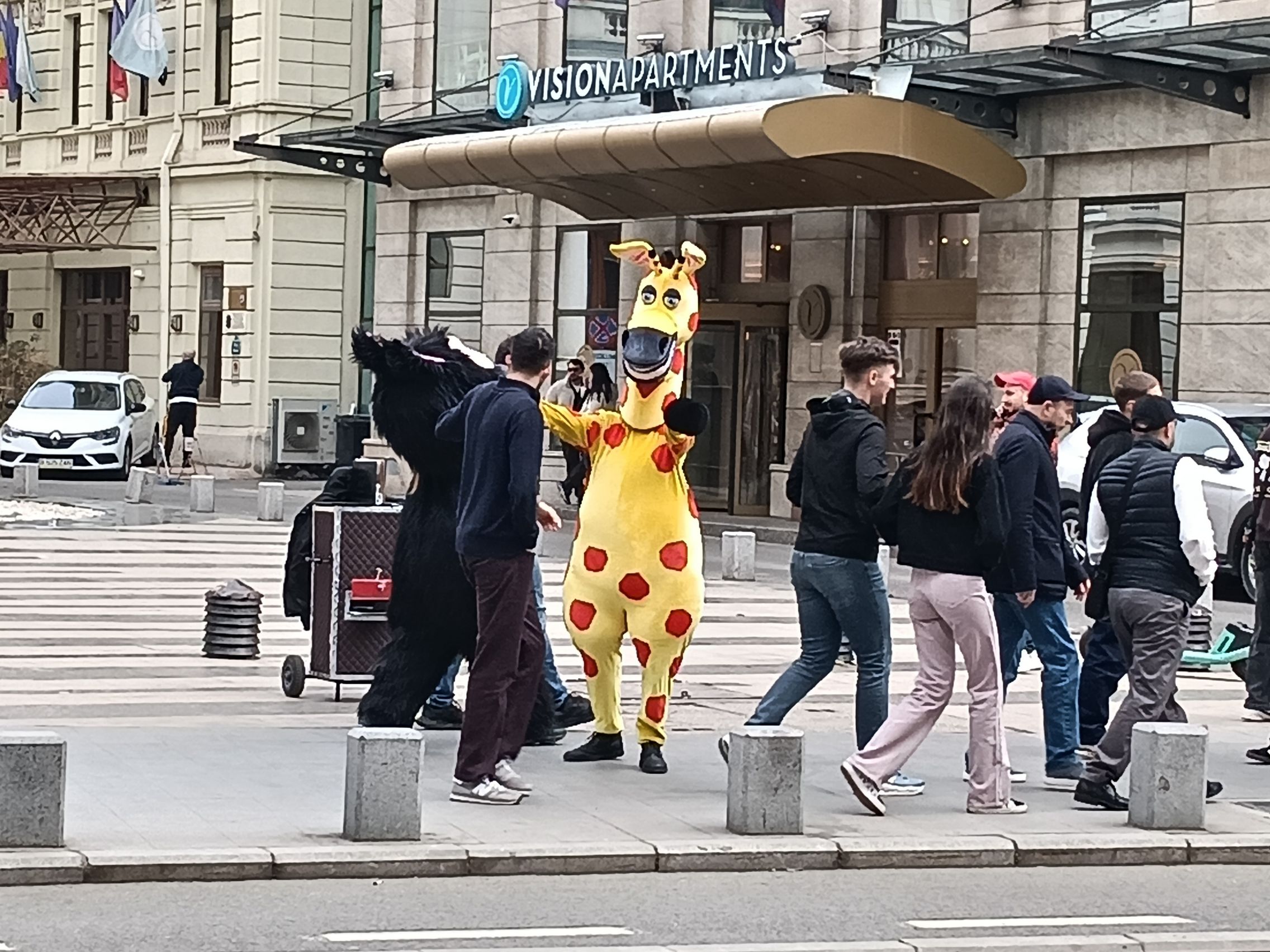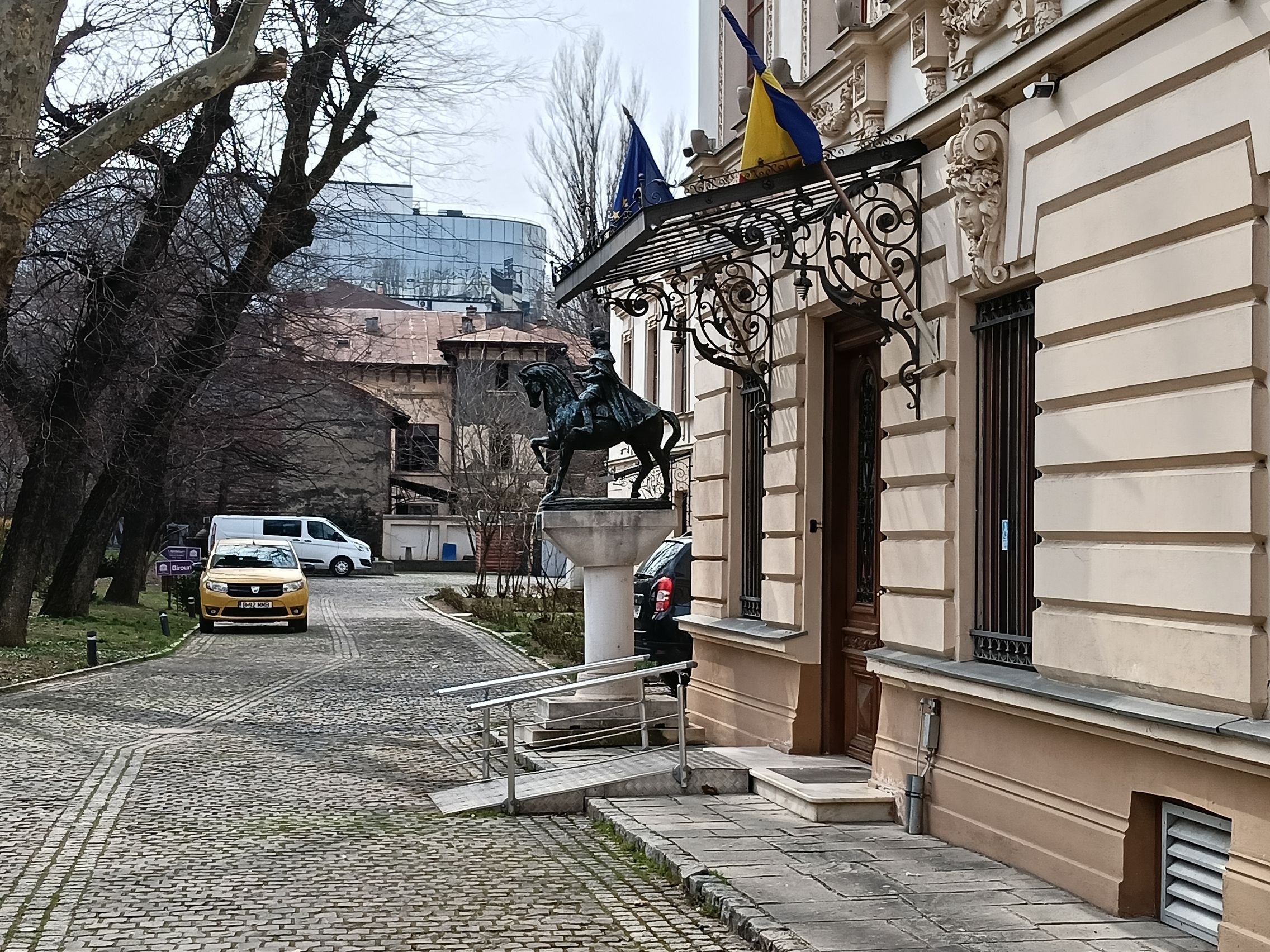 Zoom-ul e subţirel, după vreo 3X, dar nu puteam să mă abţin din a filma acel măgar mov, care făcea poante pe stradă şi dădea îmbrăţişări gratis. Expunere reglată violent în zona Magazin Muzica şi o filmare duală, cu selfie plus spate, care a ieşit turistic, dar a pierdut la detalii serios, împărţind ecranul în două. Nu ştiu dacă să recomand asta neapărat. Am încercat şi un extra test de stabilizare, dar mişcările sunt prea abrupte, chit că detaliile Muzeului Naţional de Istorie sunt OK.
