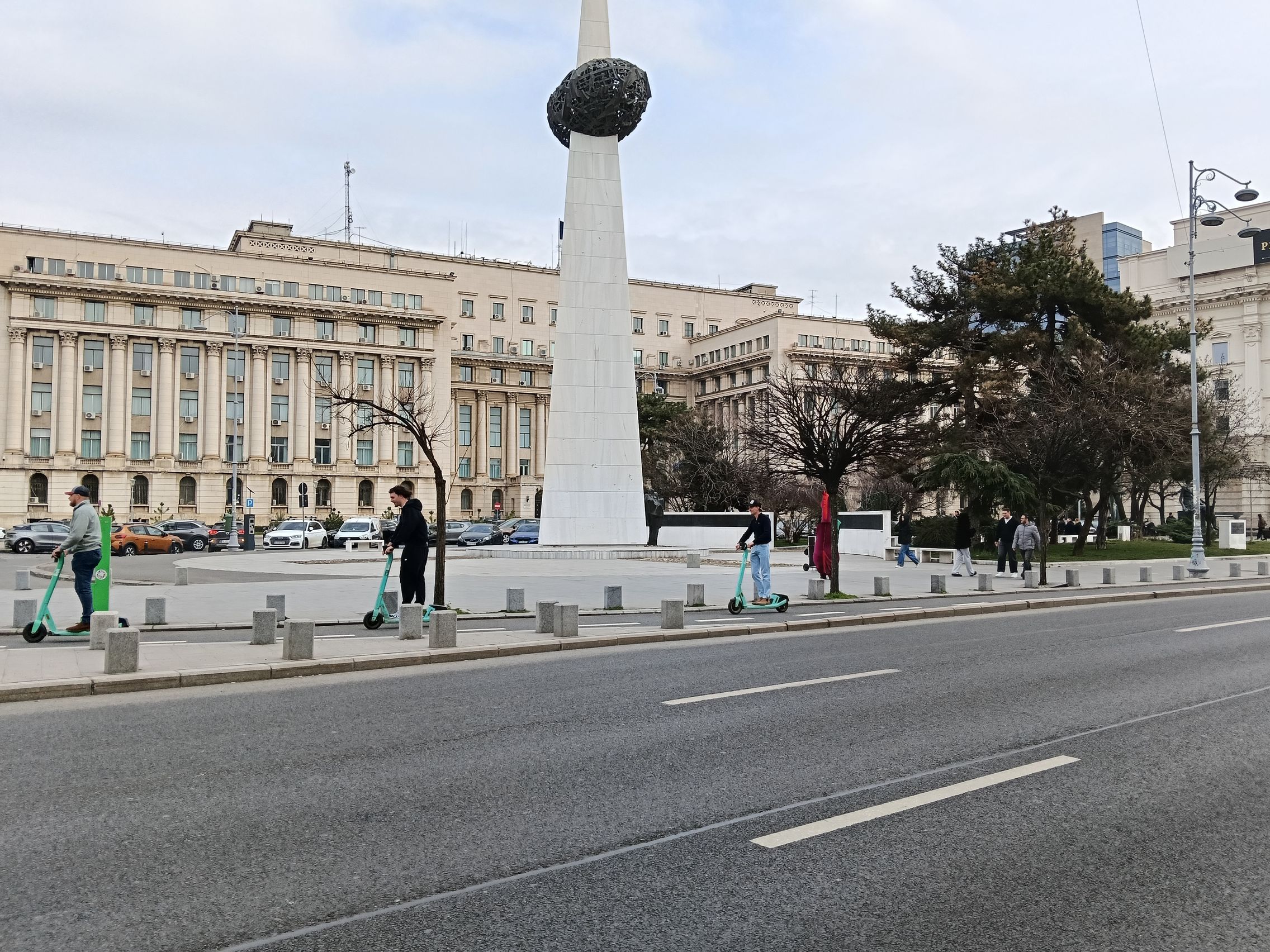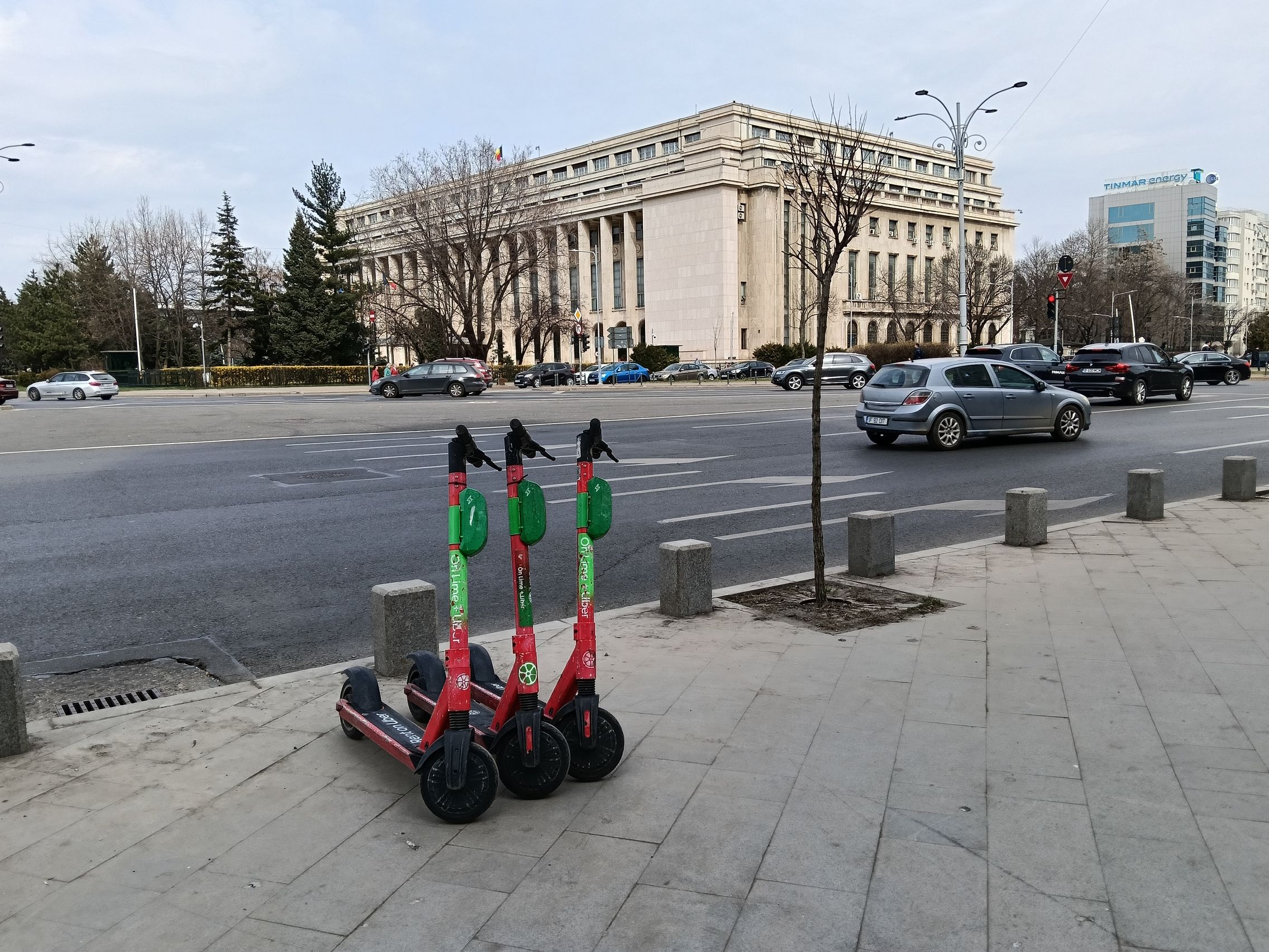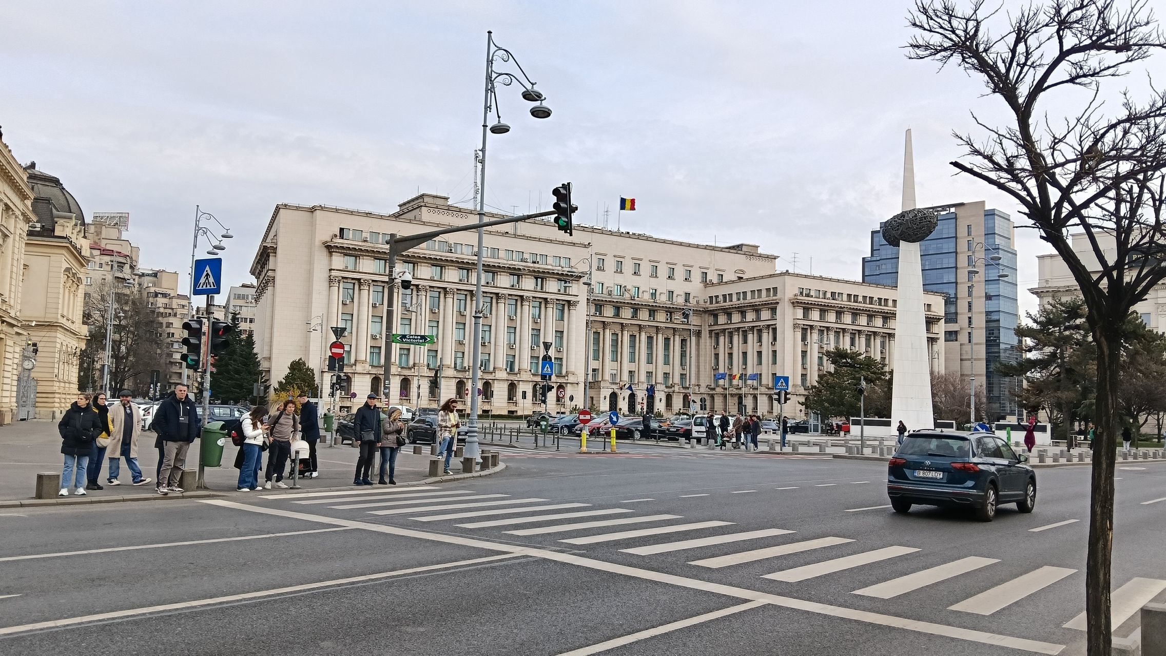 Greu să ai pretenţii de la filmare Full HD prin 2026, dar iată câteva idei. Focalizare precisă la alternarea între planuri: apropiat pe mâner de trotinetă şi depărtat pe traficul din zona Victoriei. Stabilizarea nu e optimă, se simte fiecare pas, dar măcar nu vibrează imaginea. Clar trebuie să mergi mai lent decât am făcut-o eu.