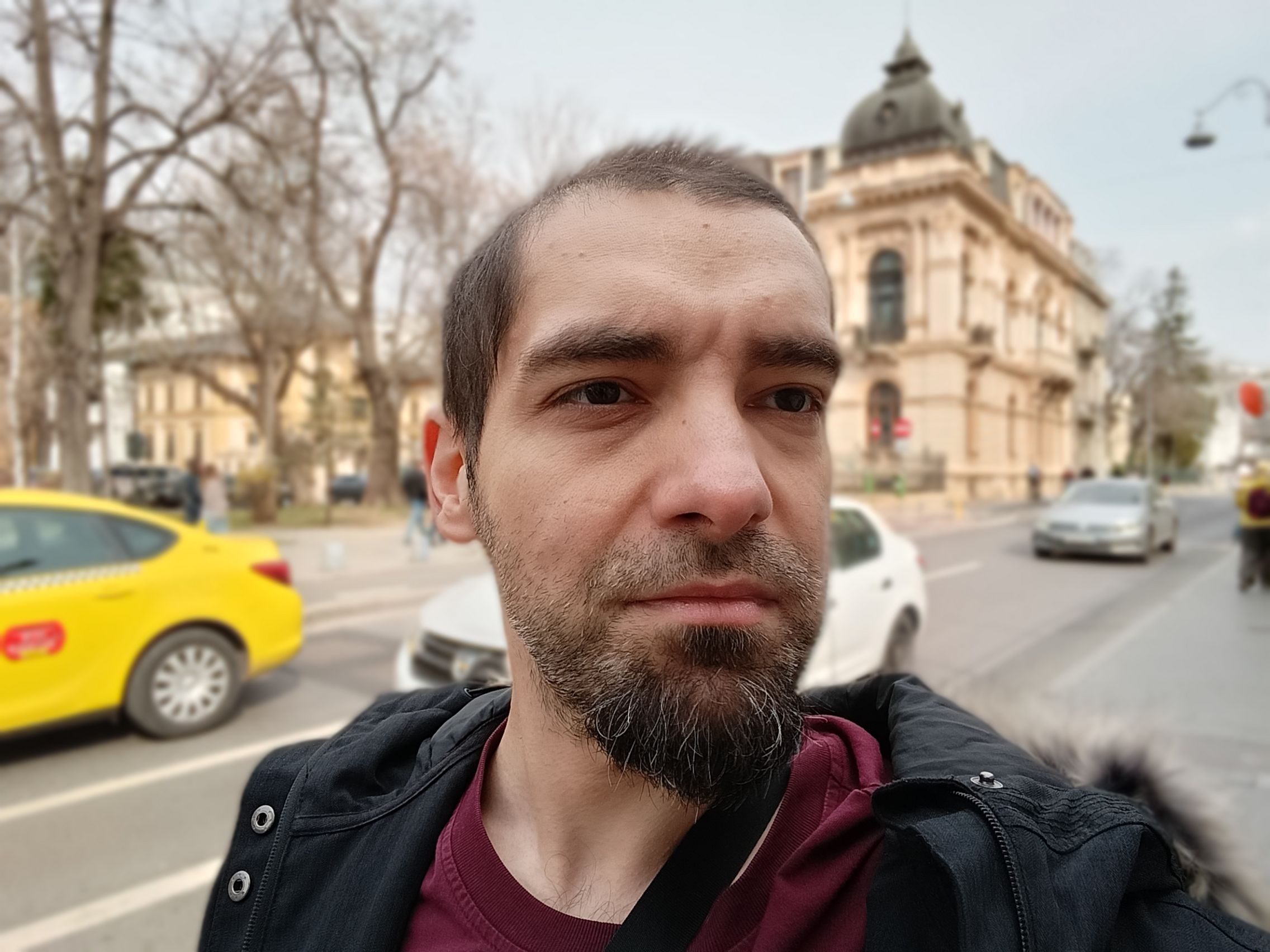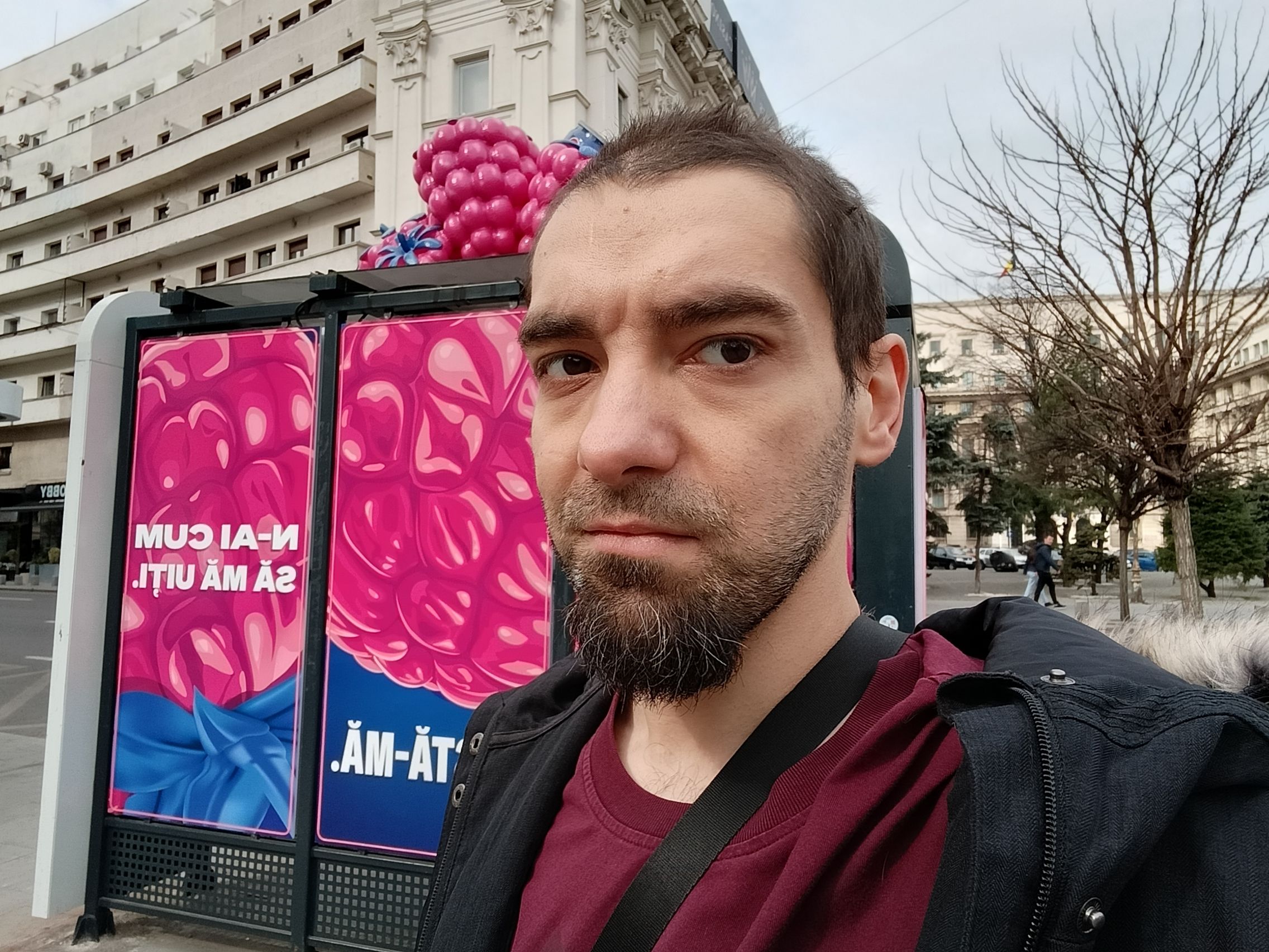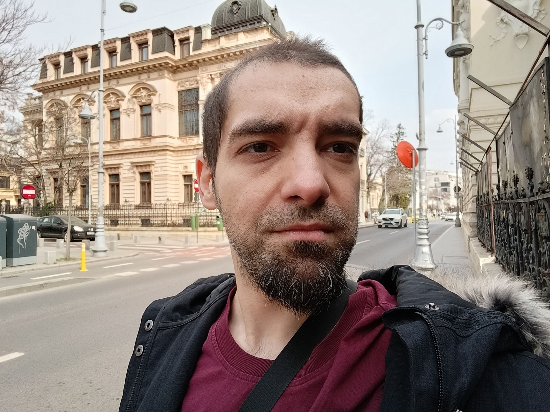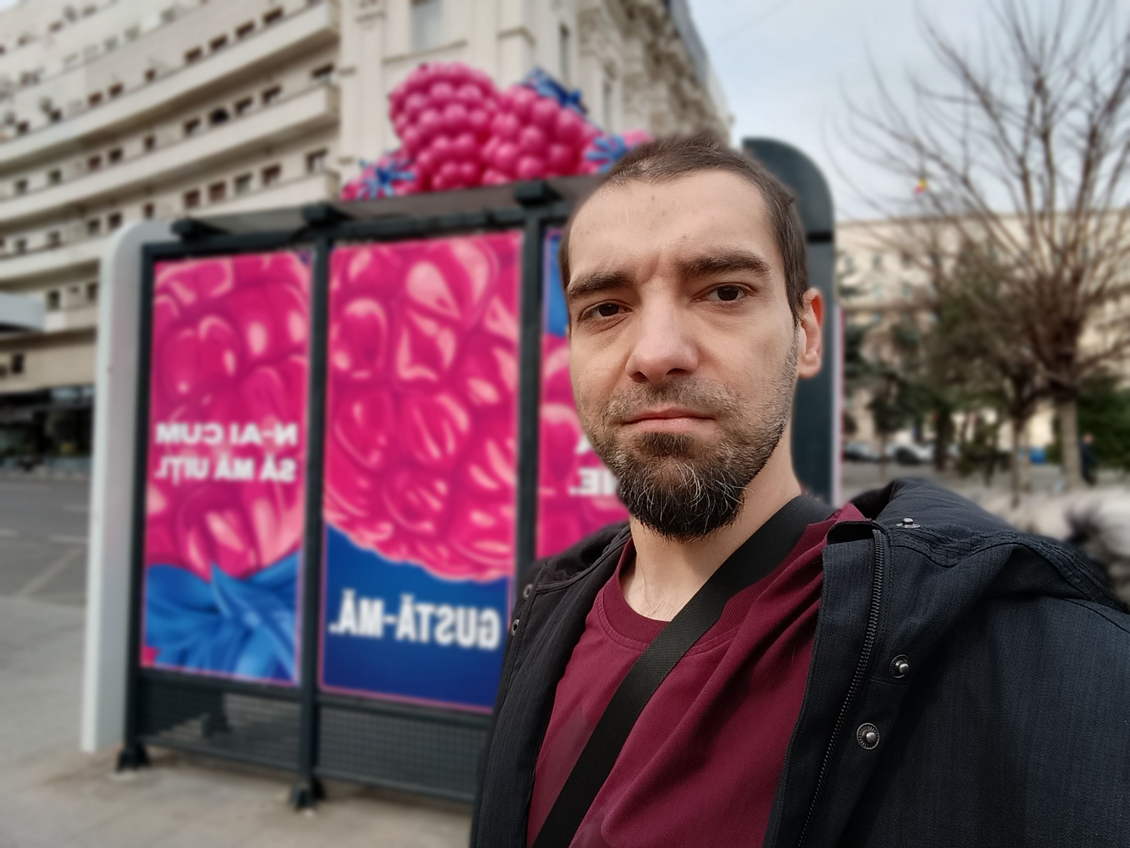 Selfie-urile? Expresive, focalizate decent, dar fără detalii prea multe în fundal. Bokeh corect aplicat, subliniind detaiile faciale, că gropiţe, dungi de expresie, riduri, încruntări sau zâmbete. Sunt şi multe efecte cu care să te joci, dar atenţie la expunerea fundalului. Luciul maşinilor de pe Calea Victoriei e veridic, nimic de rău de zis aici, dar obiectele de la distanţă, dacă nu ai ales captura Hi Res vor păli că detalii.